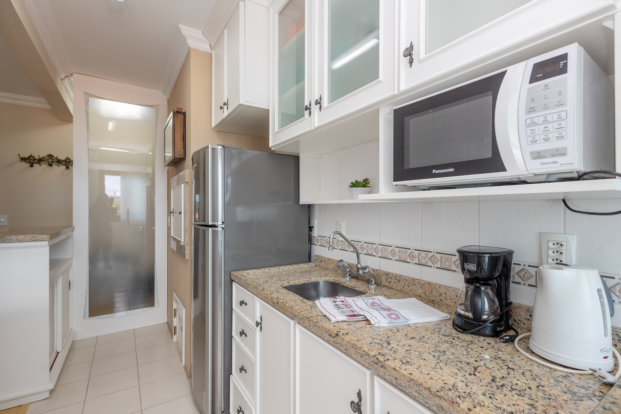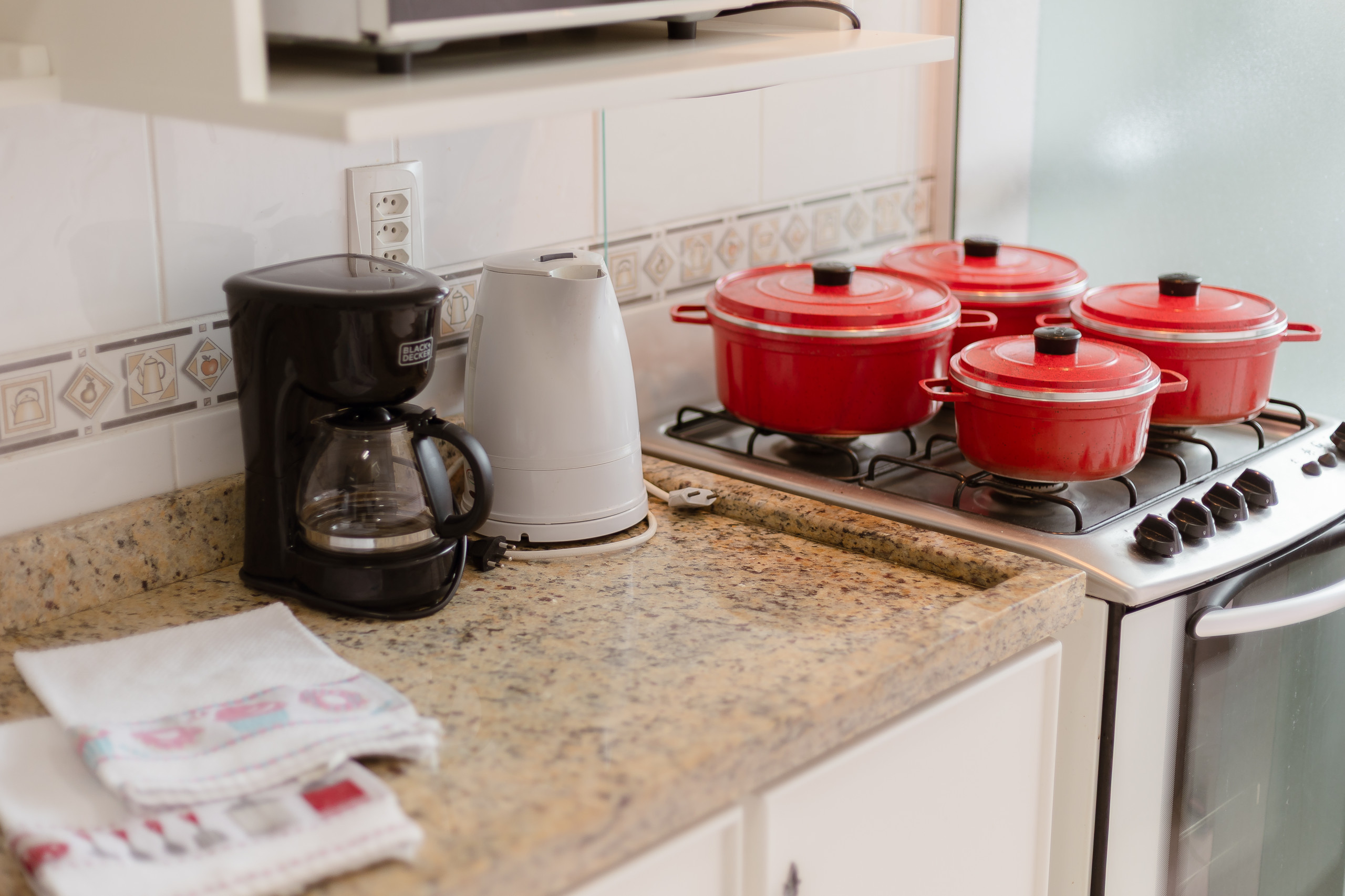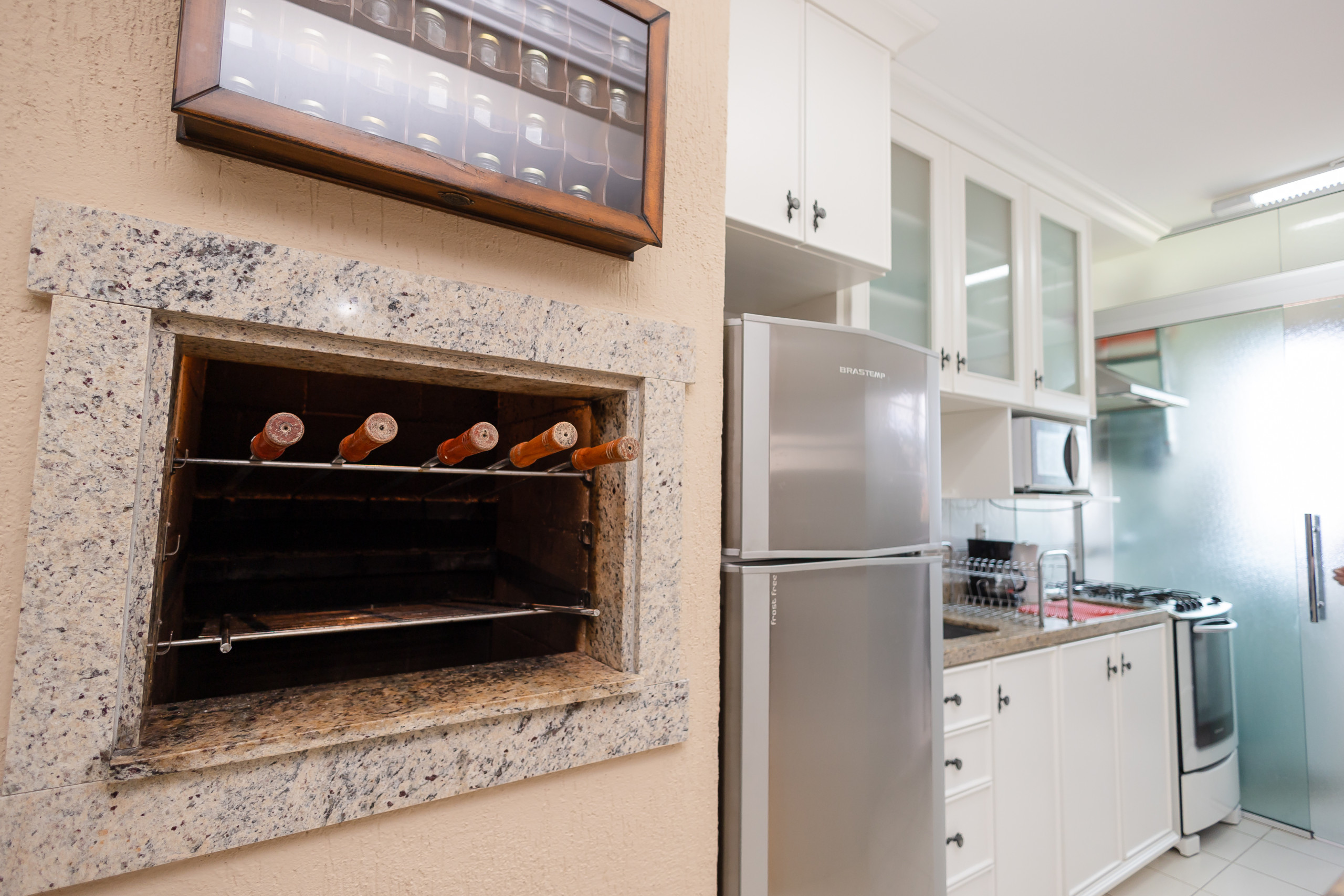 The complete kitchen has a barbecue, refrigerator, coffee maker, sandwich maker, microwave, oven and stove. At the table, up to 06 guests can sit for meals or to simply enjoy a hot chocolate. The apartment also has a laundry area with a tank and counter with two more seats.