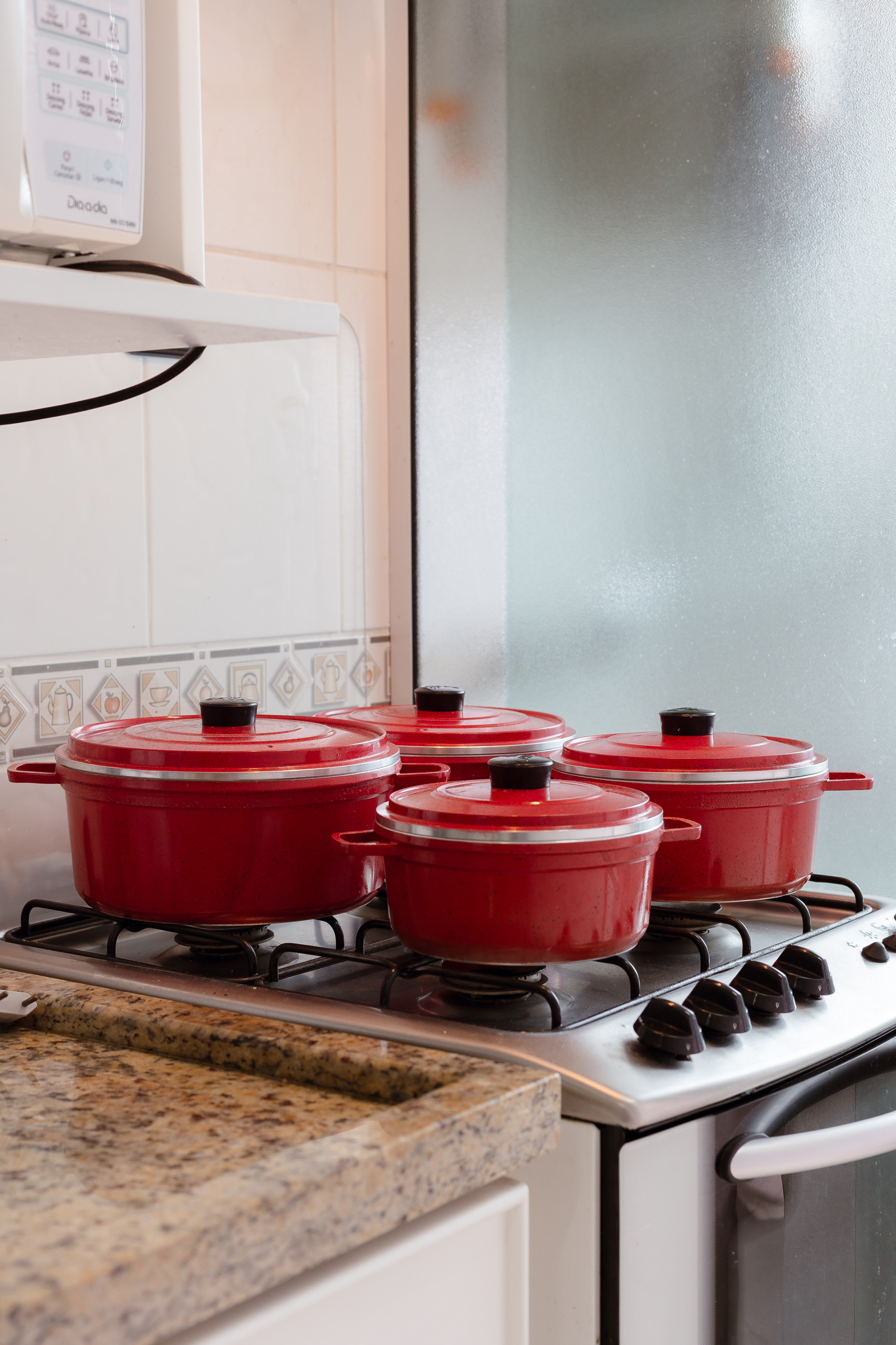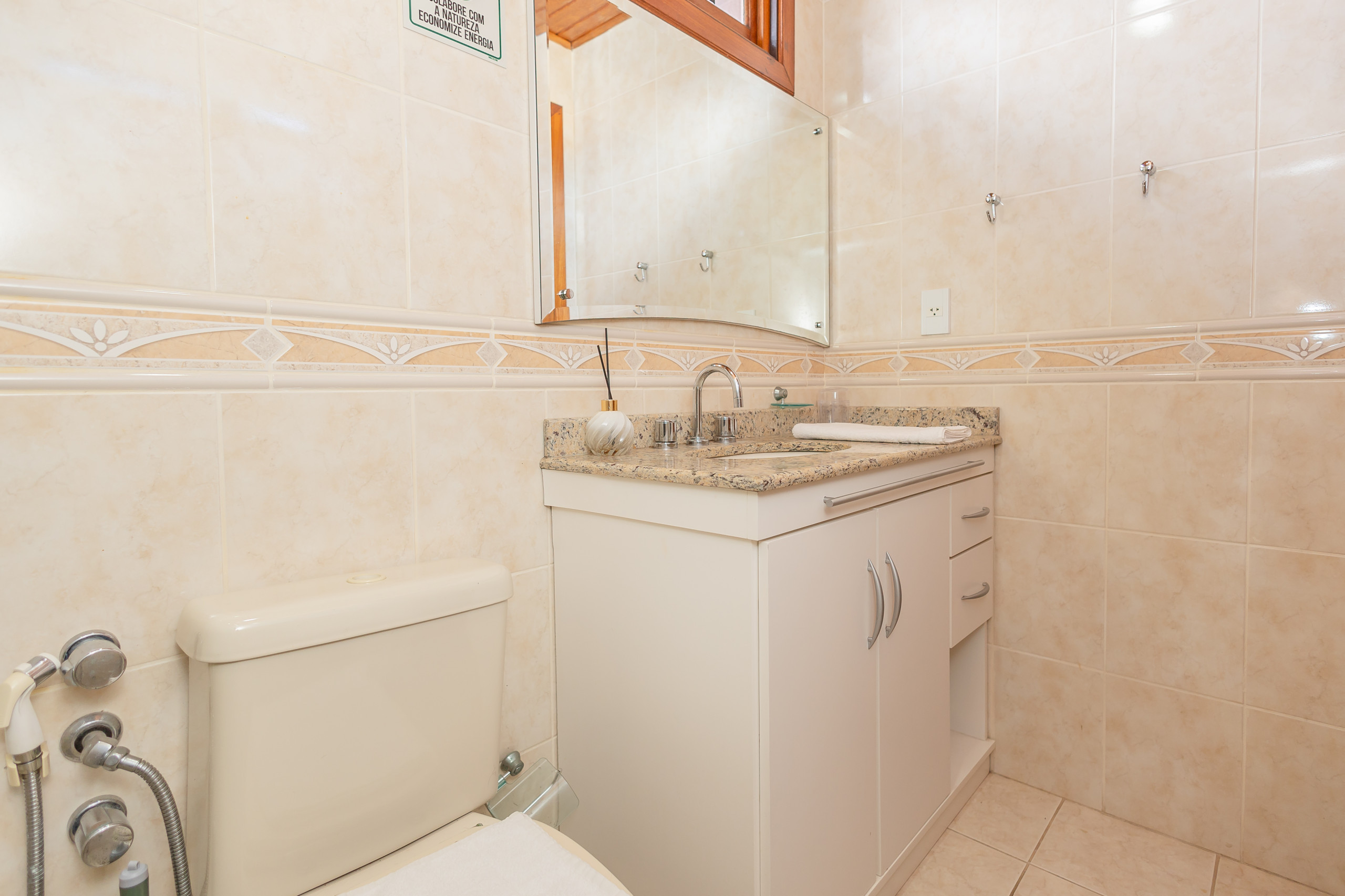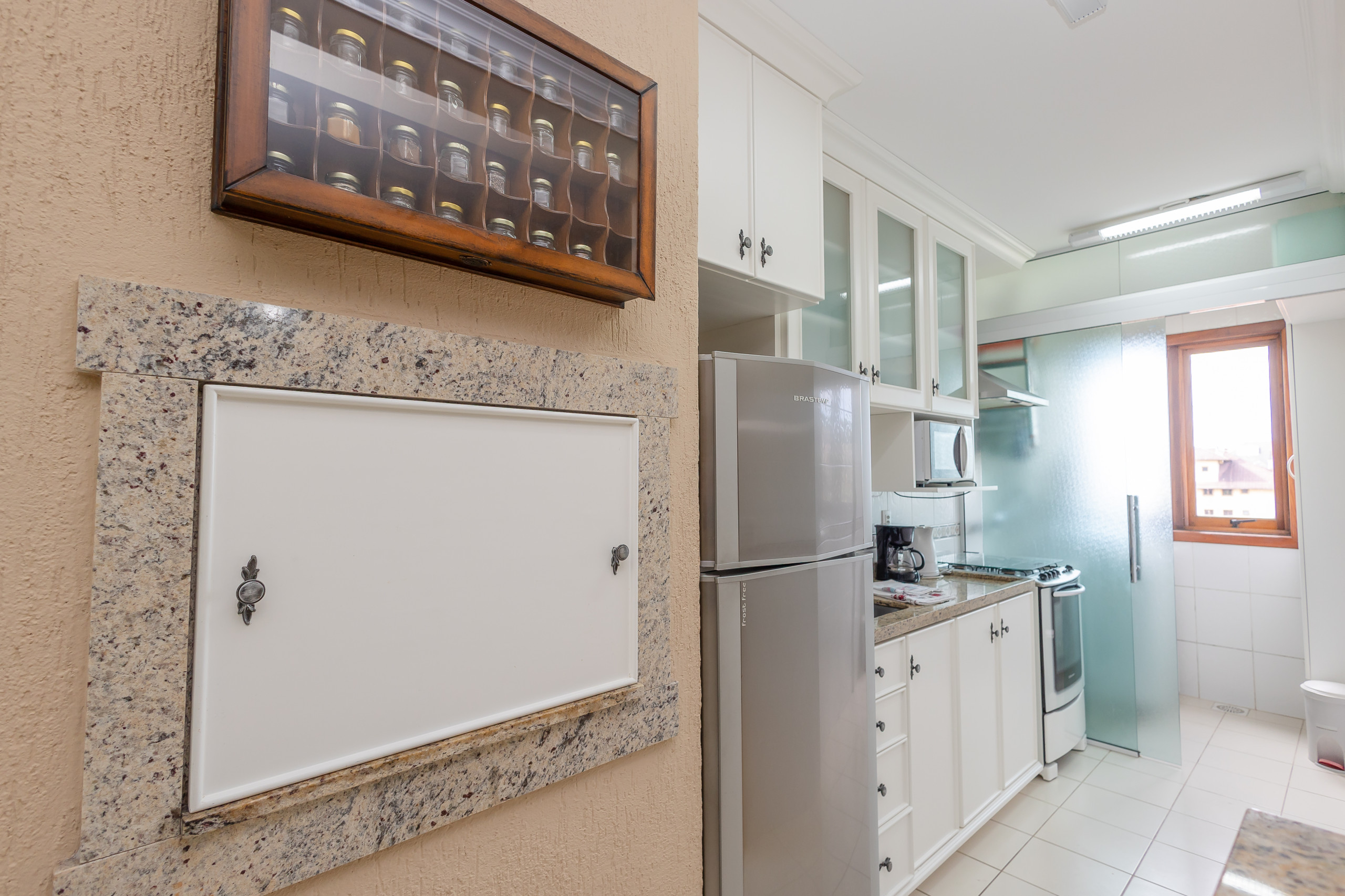 The complete kitchen has a barbecue, refrigerator, coffee maker, sandwich maker, microwave, oven and stove. At the table, up to 06 guests can sit for meals or to simply enjoy a hot chocolate. The apartment also has a laundry area with a tank and counter with two more seats.
