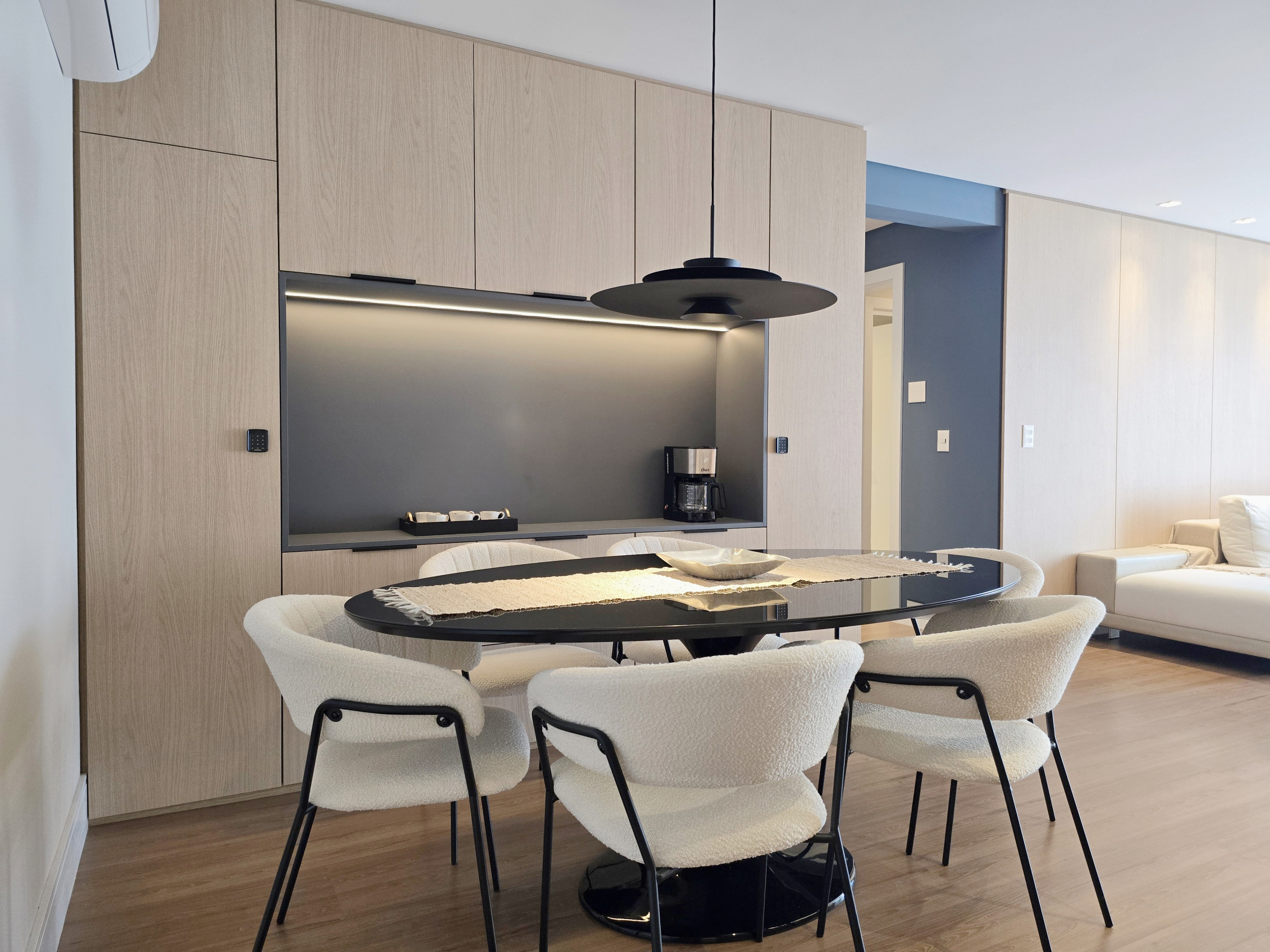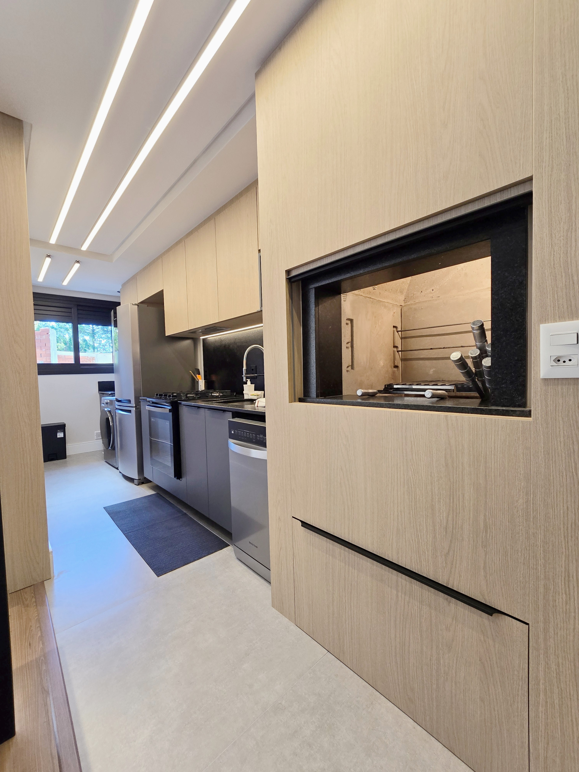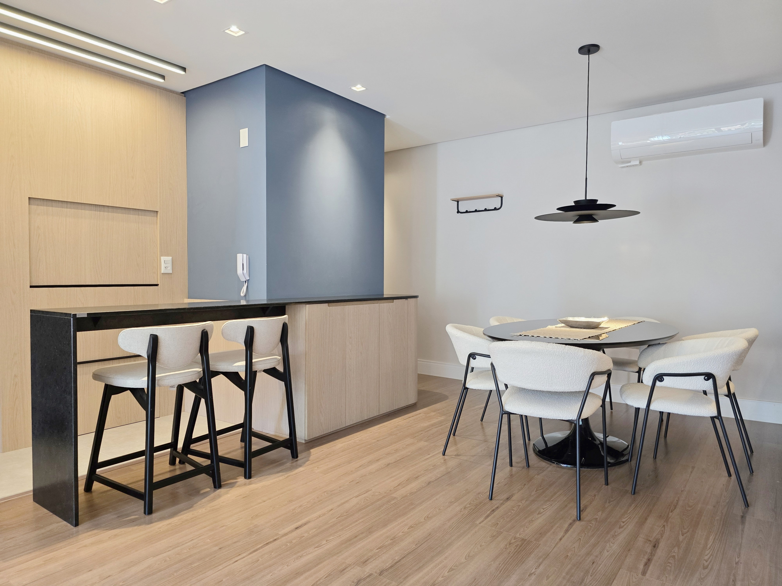 The complete kitchen has a dishwasher, barbecue grill, refrigerator, coffee maker, sandwich maker, microwave, blender and stove with oven. At the table, up to 06 guests can sit for meals or to simply enjoy a hot chocolate or a wine. The apartment also has a laundry with washer and dryer.