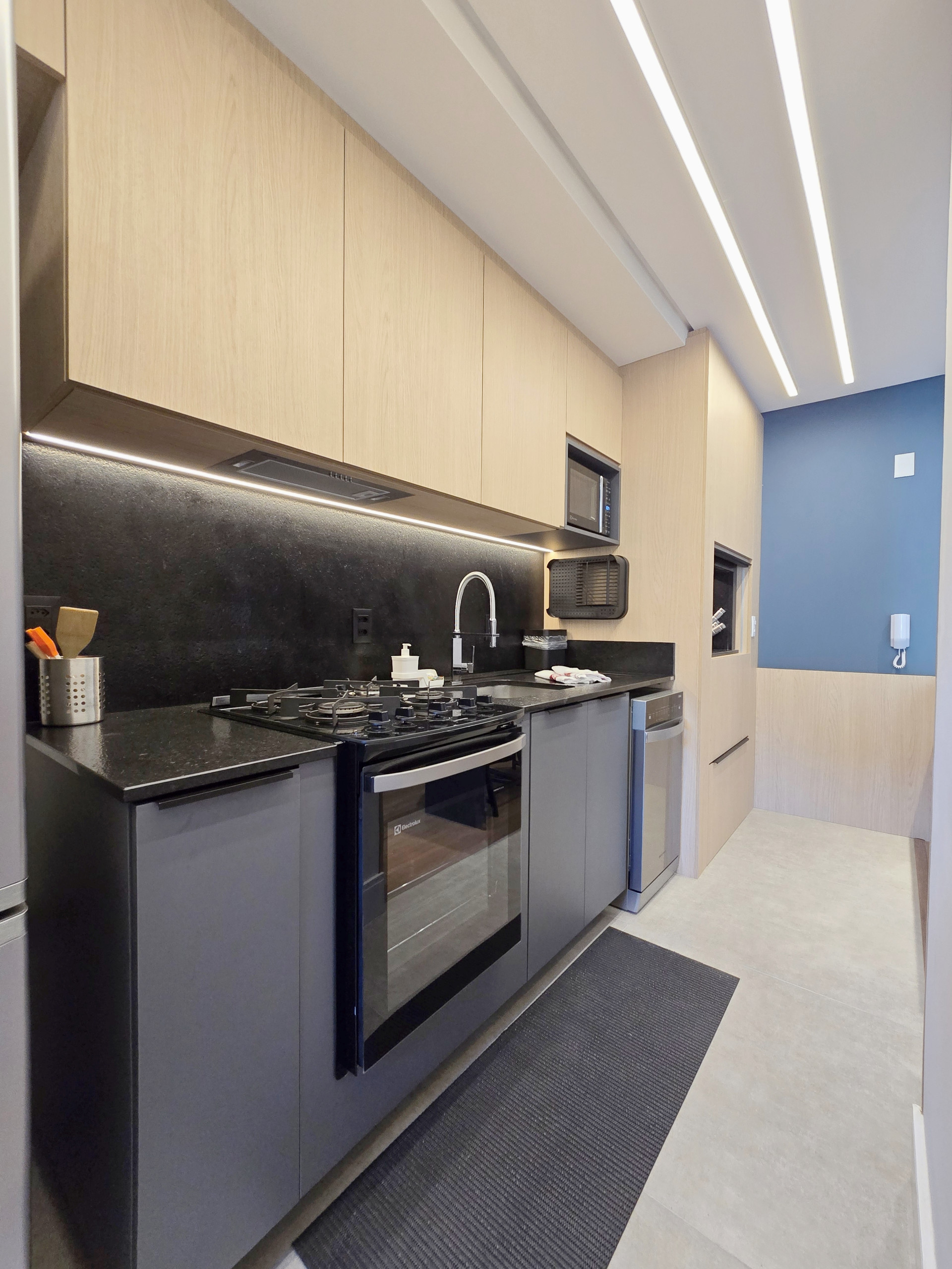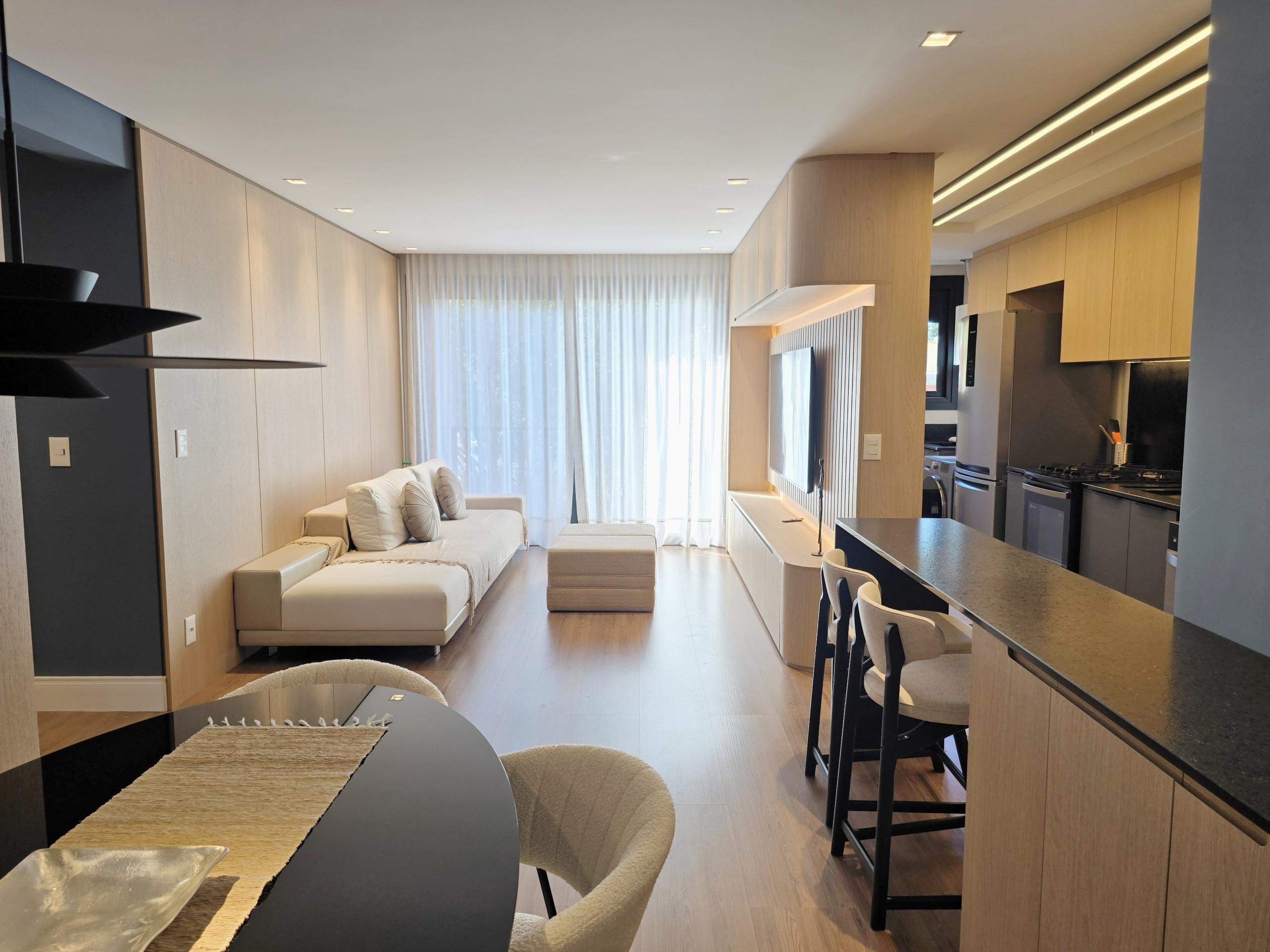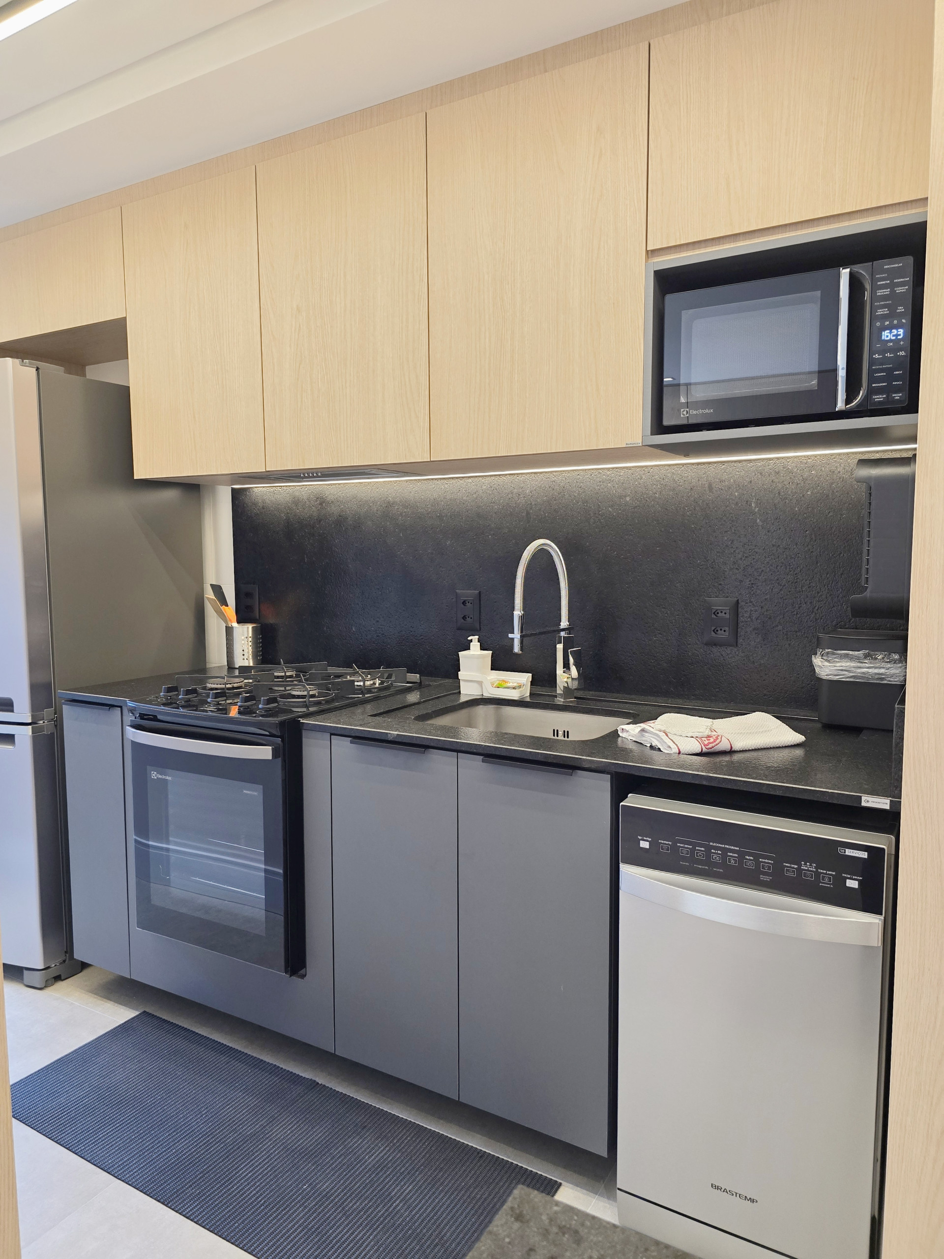 The complete kitchen has a dishwasher, barbecue grill, refrigerator, coffee maker, sandwich maker, microwave, blender and stove with oven. At the table, up to 06 guests can sit for meals or to simply enjoy a hot chocolate or a wine. The apartment also has a laundry with washer and dryer.