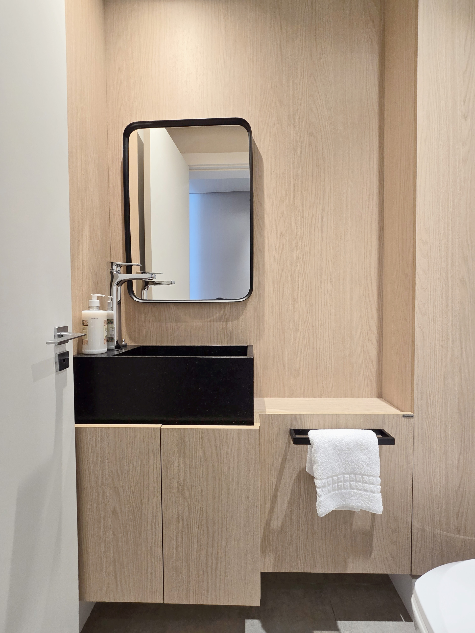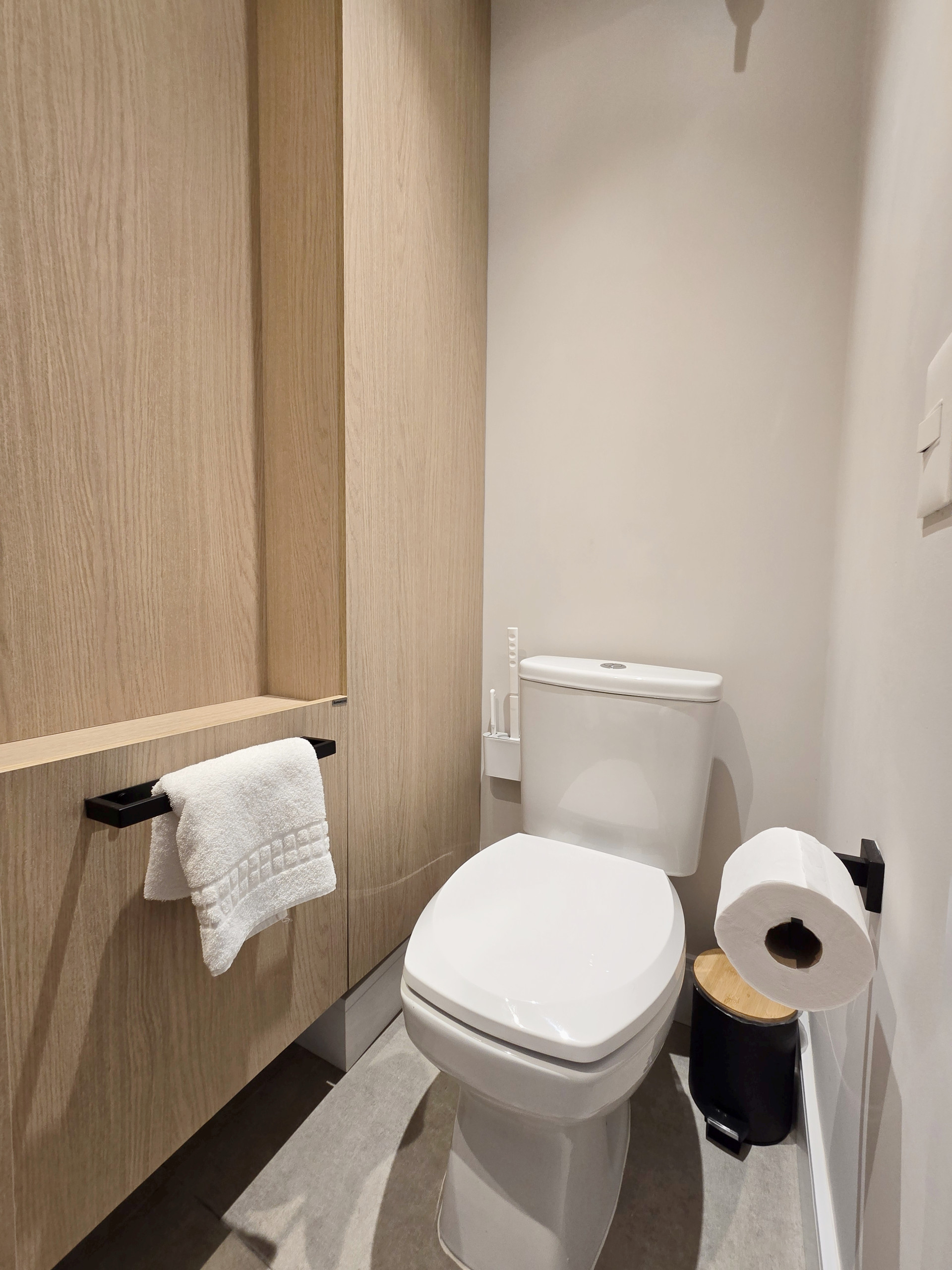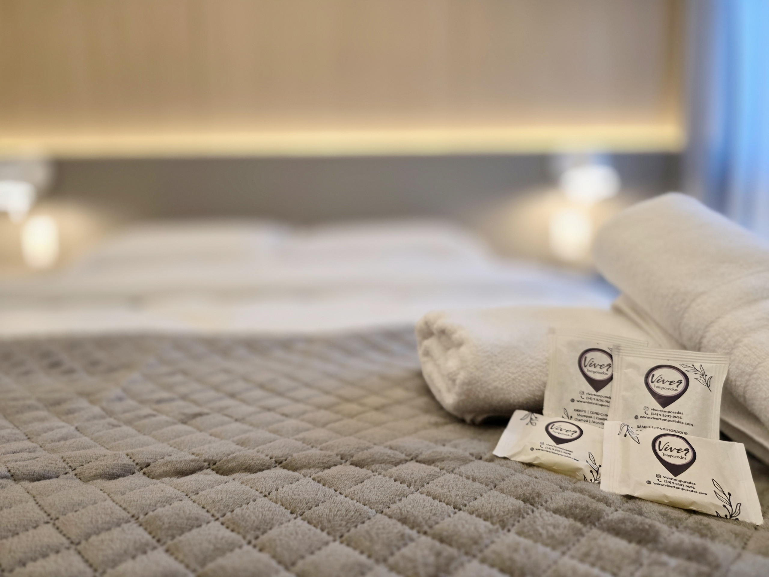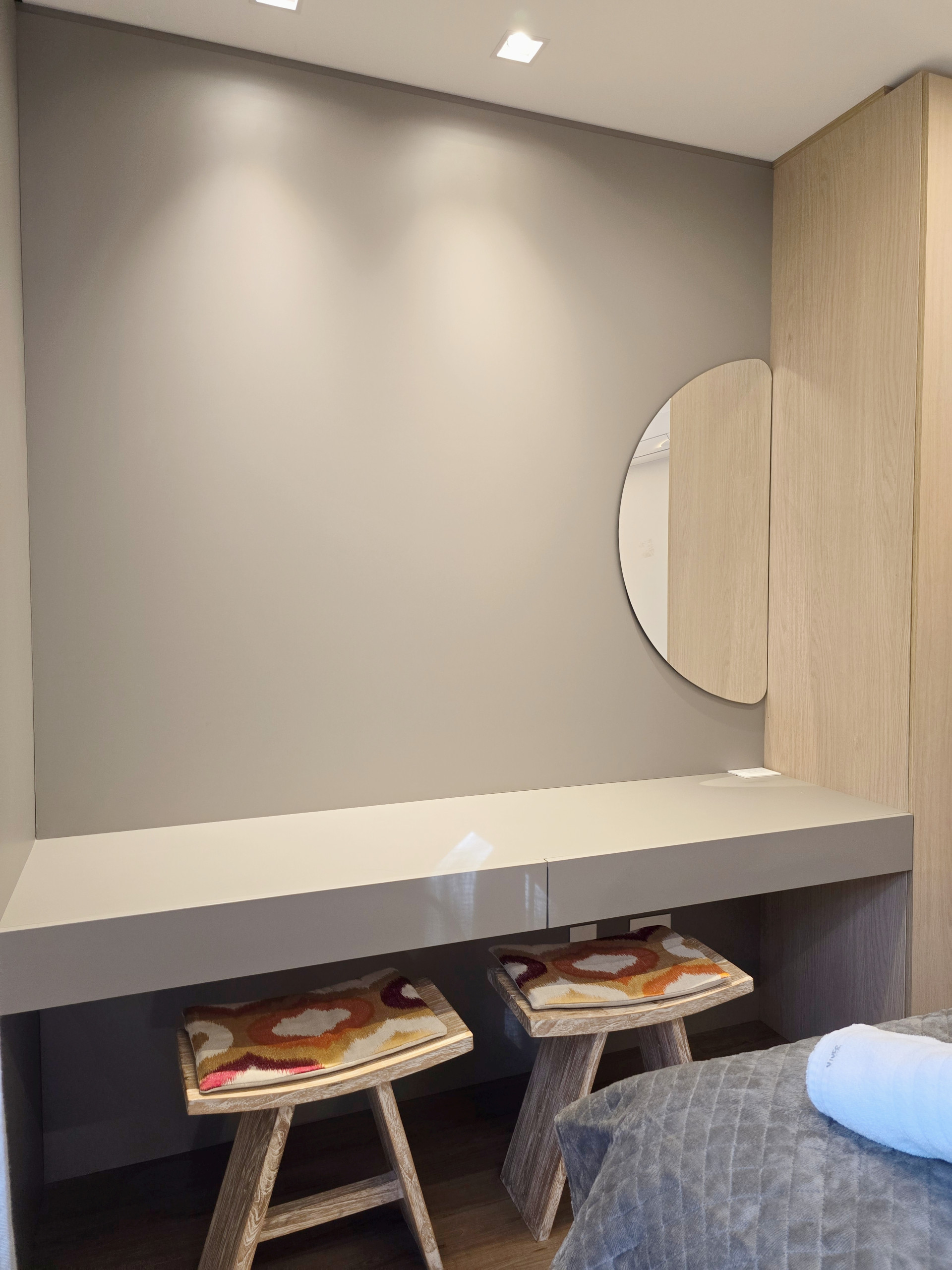 In the intimate area, we find two suites, each with split A/C, blackout blinds and curtains that bring cosiness. One of the suites has a queen bed and the other suite has a double bed.