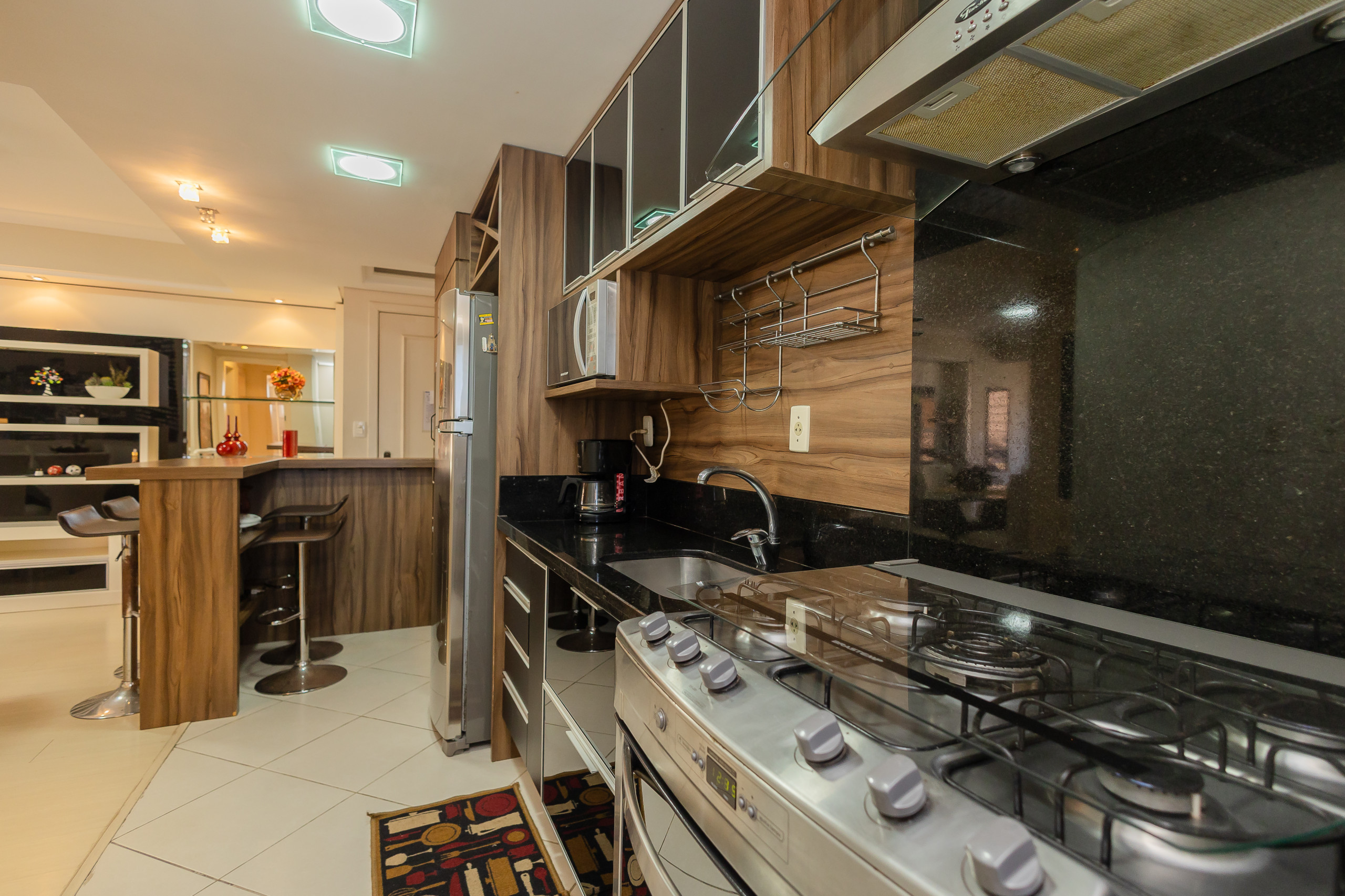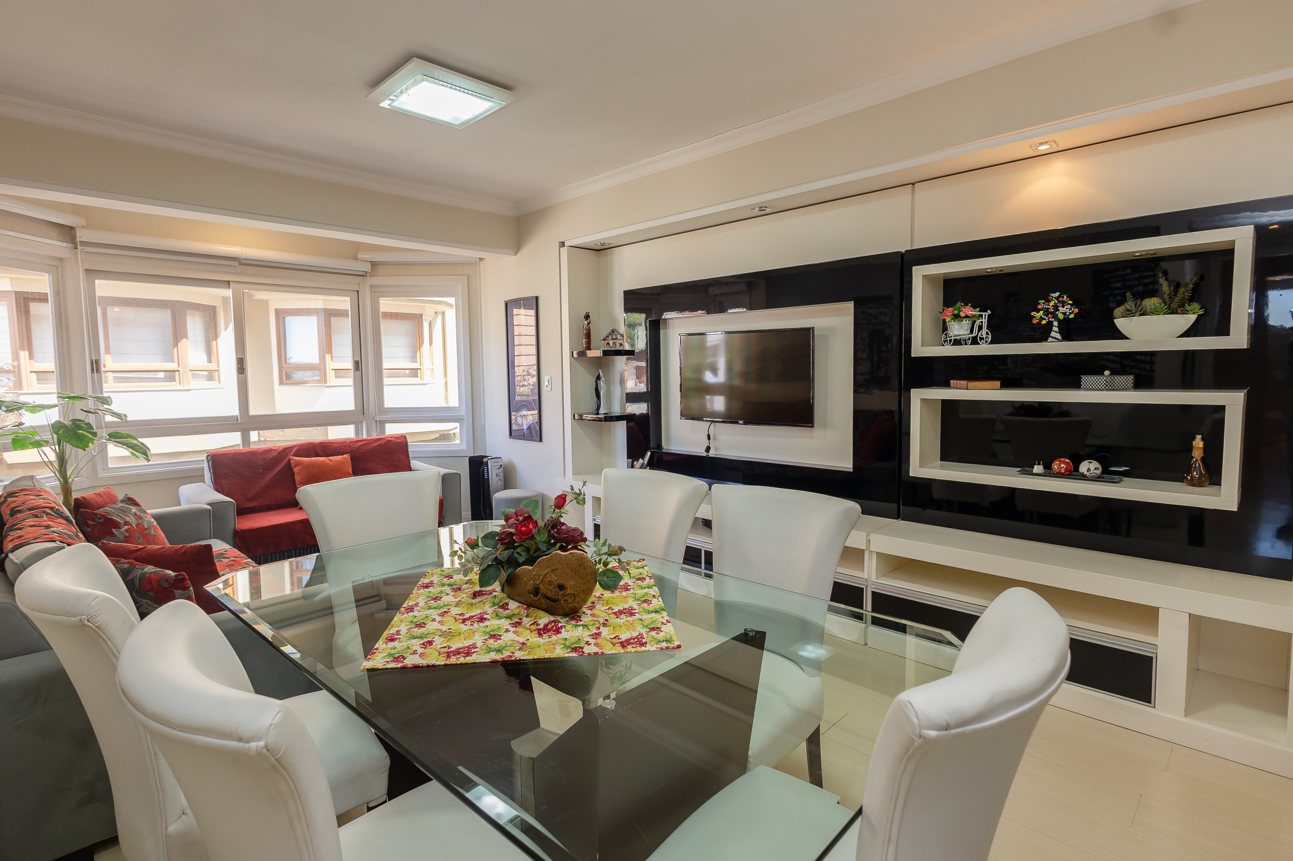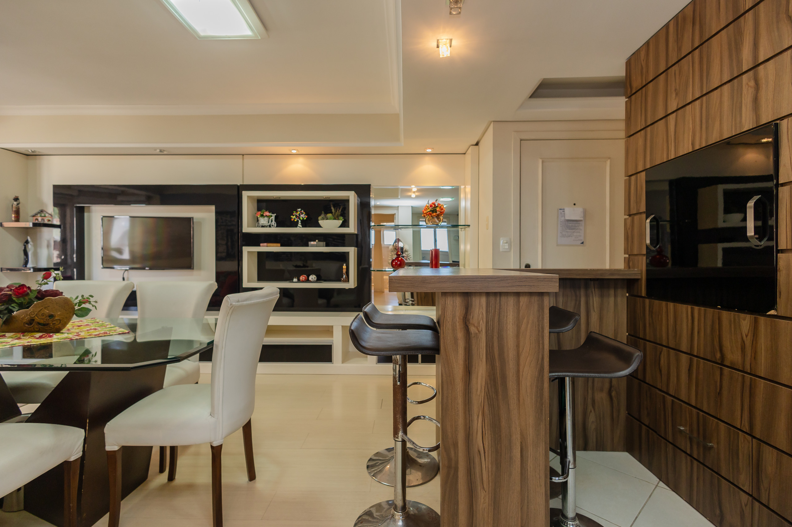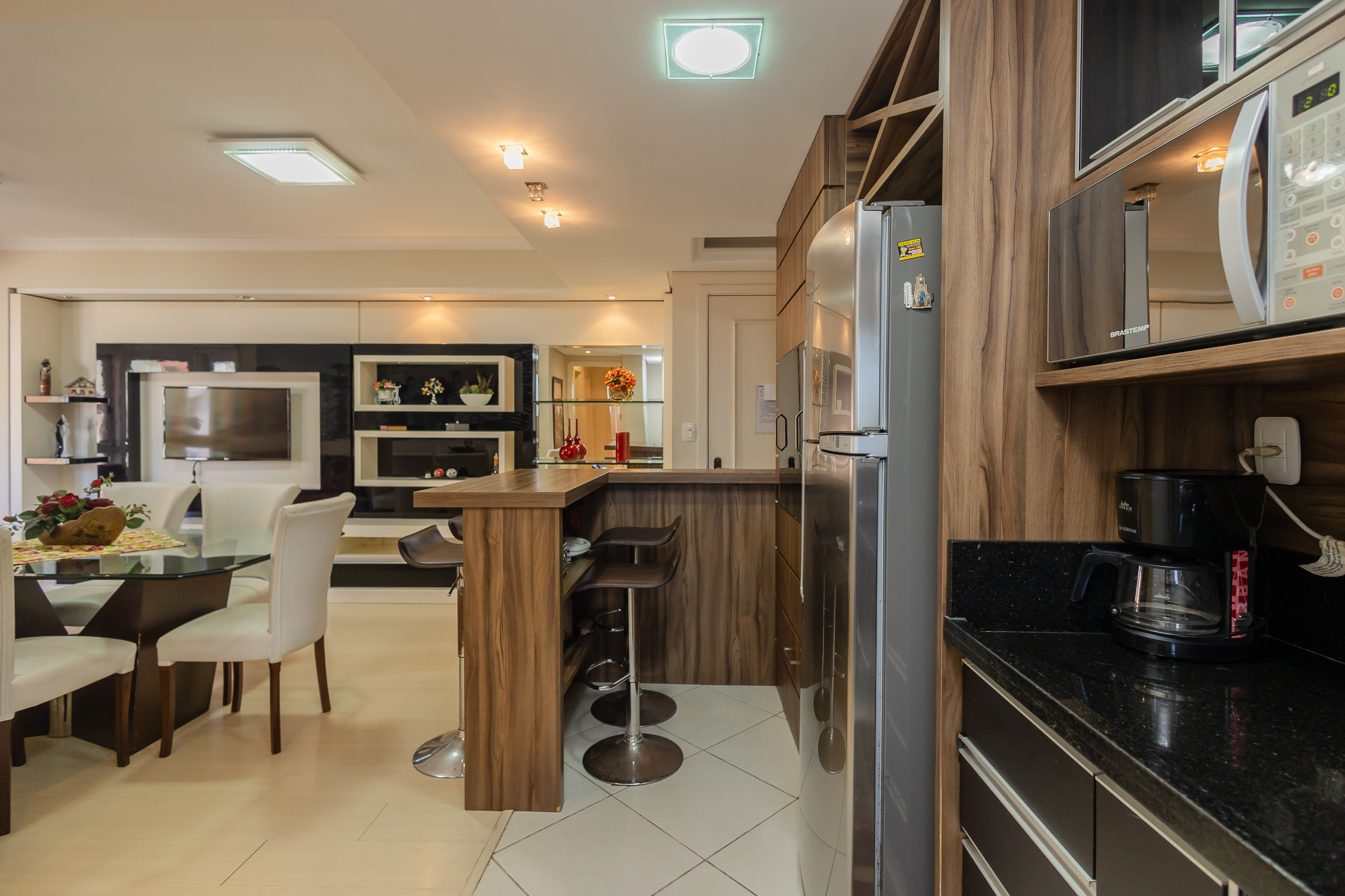 Modern apartment with 2 bedrooms, including one suite, spacious integrated living and dining area connected to the kitchen (fully equipped) and gourmet barbecue area. It also features a service area with a washing machine, complete social bathroom, 1 parking space, and full bed and bath linen for all guests during their stay. Located on one of the city's main avenues, approximately 1km from the covered street, you will find the best of life here without needing to take the car out of the garage.