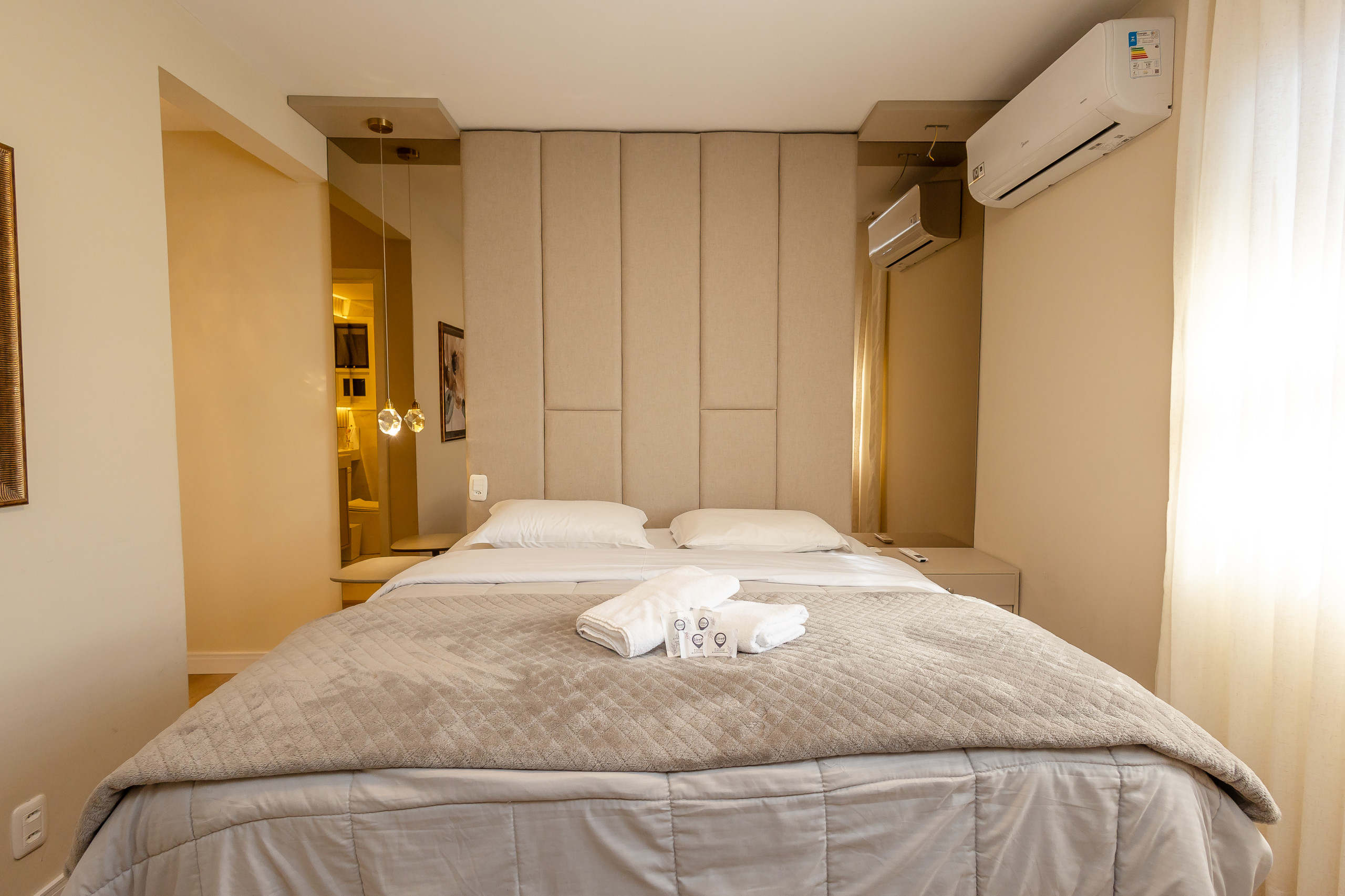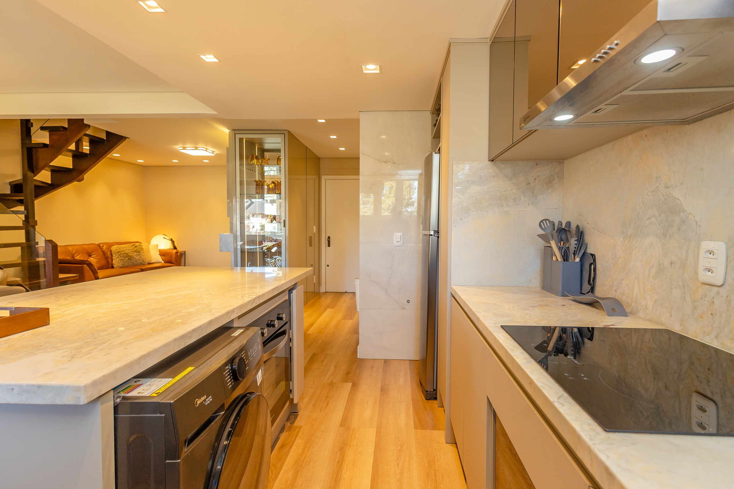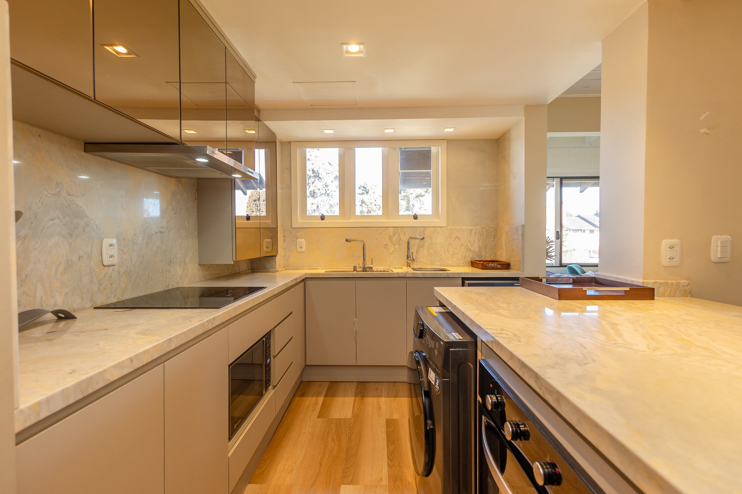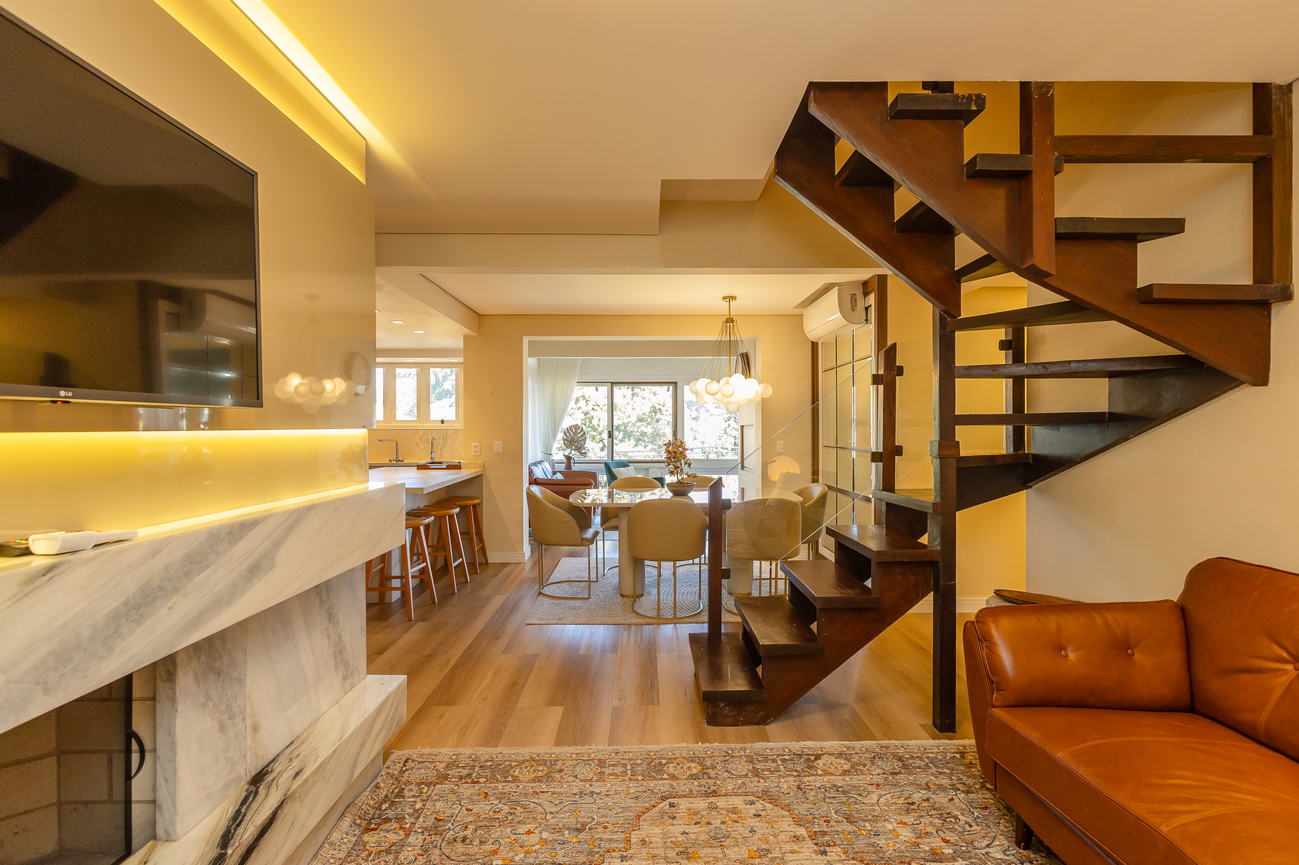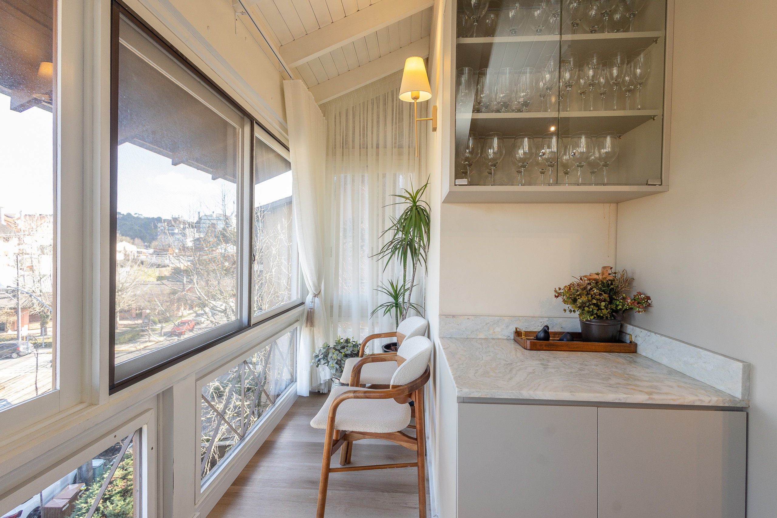 It has 4 bedrooms and 4 bathrooms (3 suites, one bedroom, and 1 full social bathroom) air-conditioned with hot/cold split and smart TV. It also features a climatized living area with 4 environments (living room, dining room, fully equipped open-plan kitchen, and closed balcony with a view of the square) with fireplace and barbecue area. You will also have at your disposal washer and dryer, dishwasher, high-speed internet, and a complete high-standard linen set for your stay.