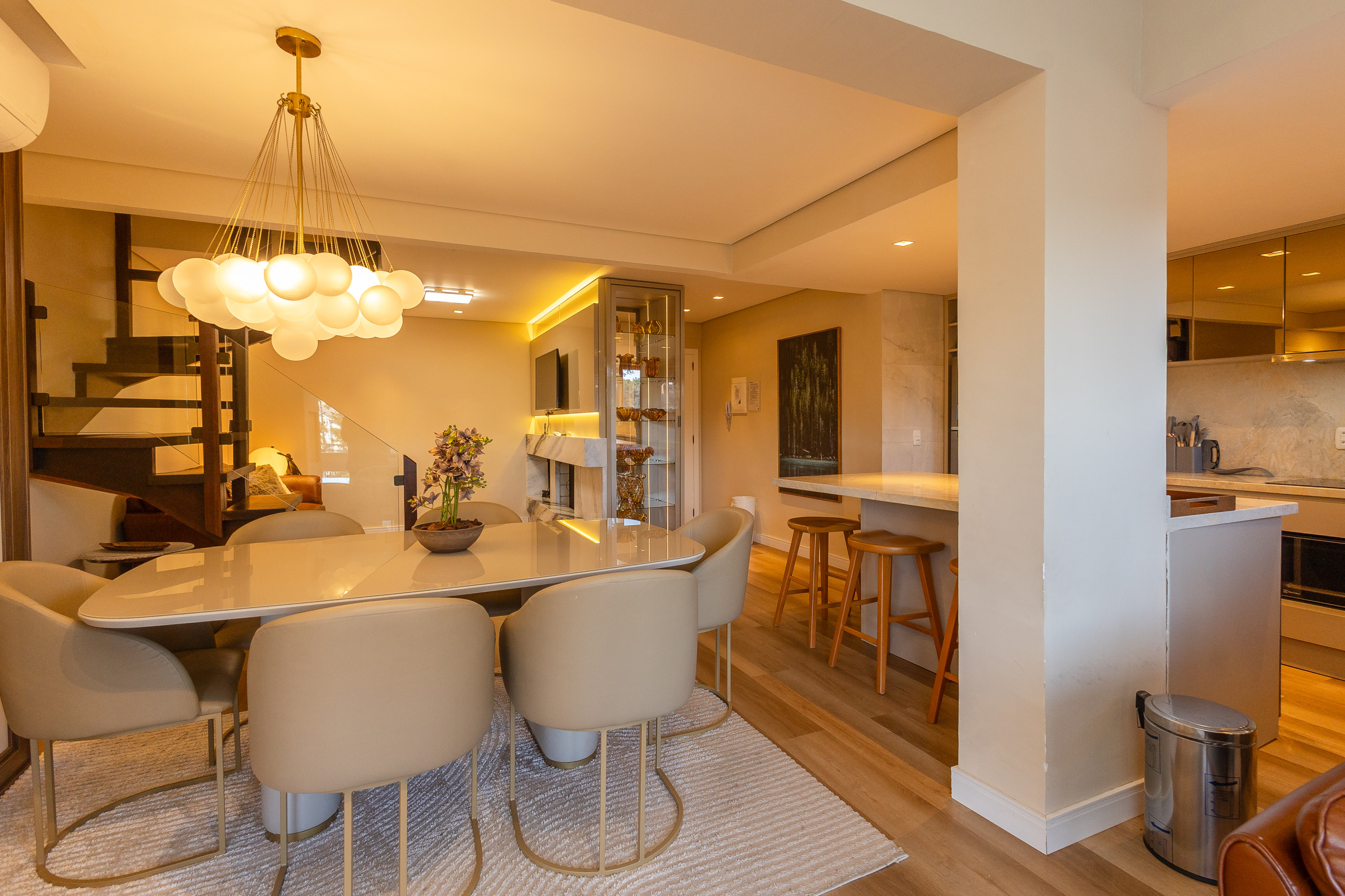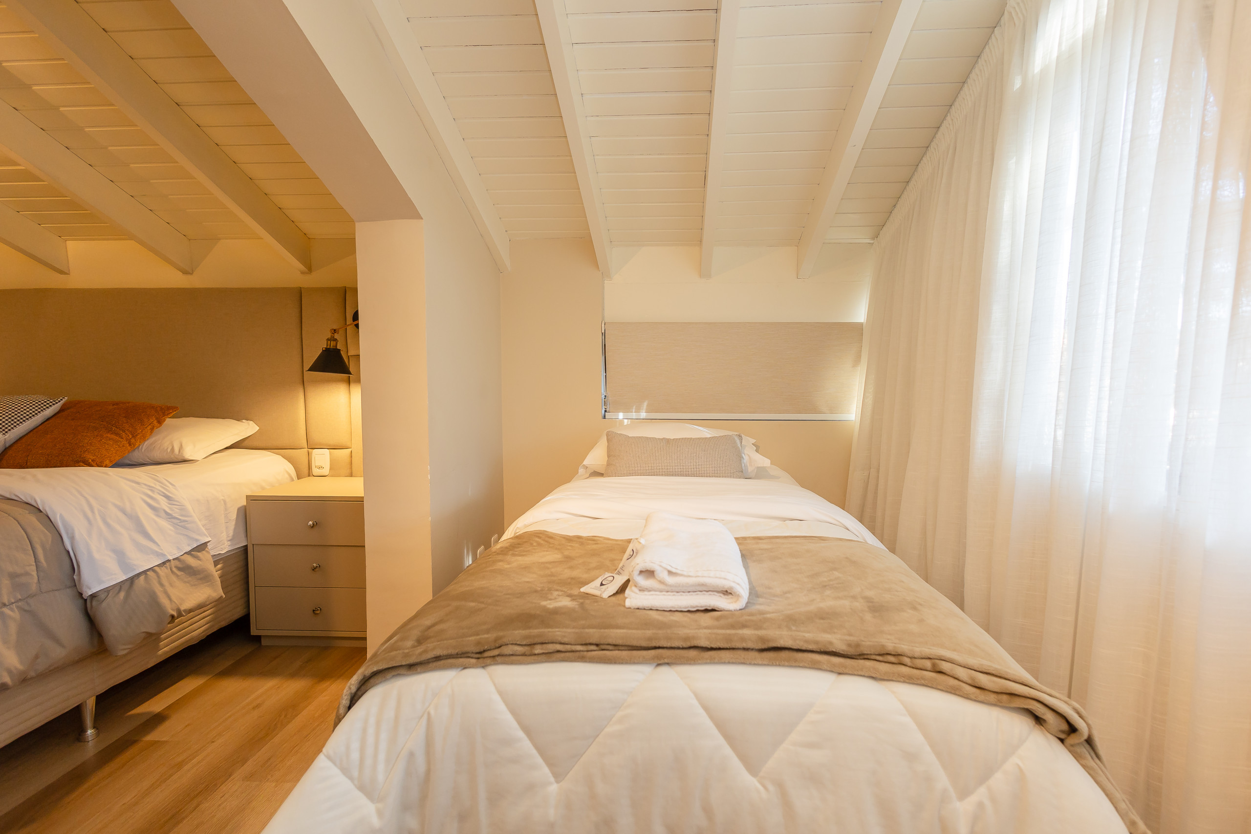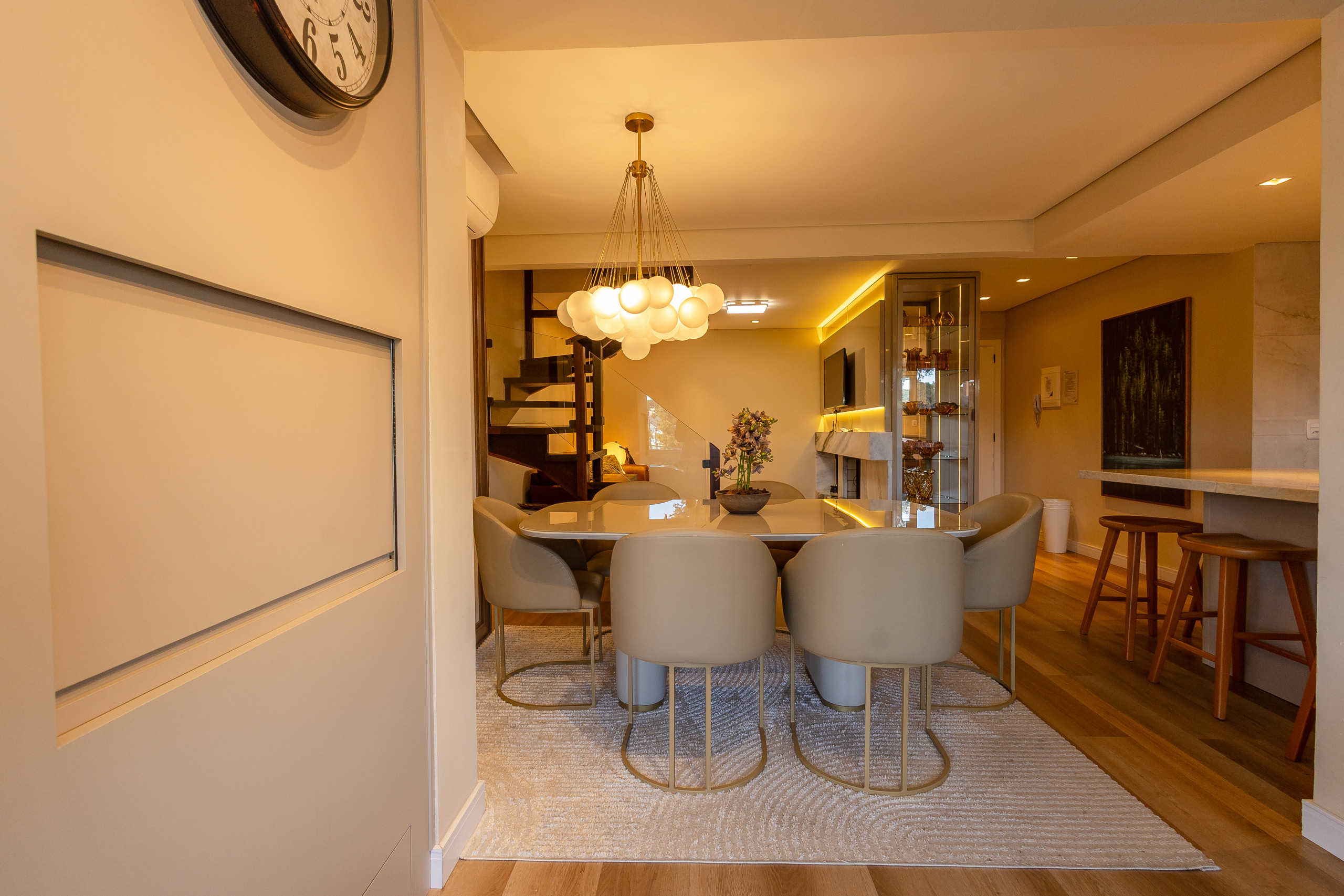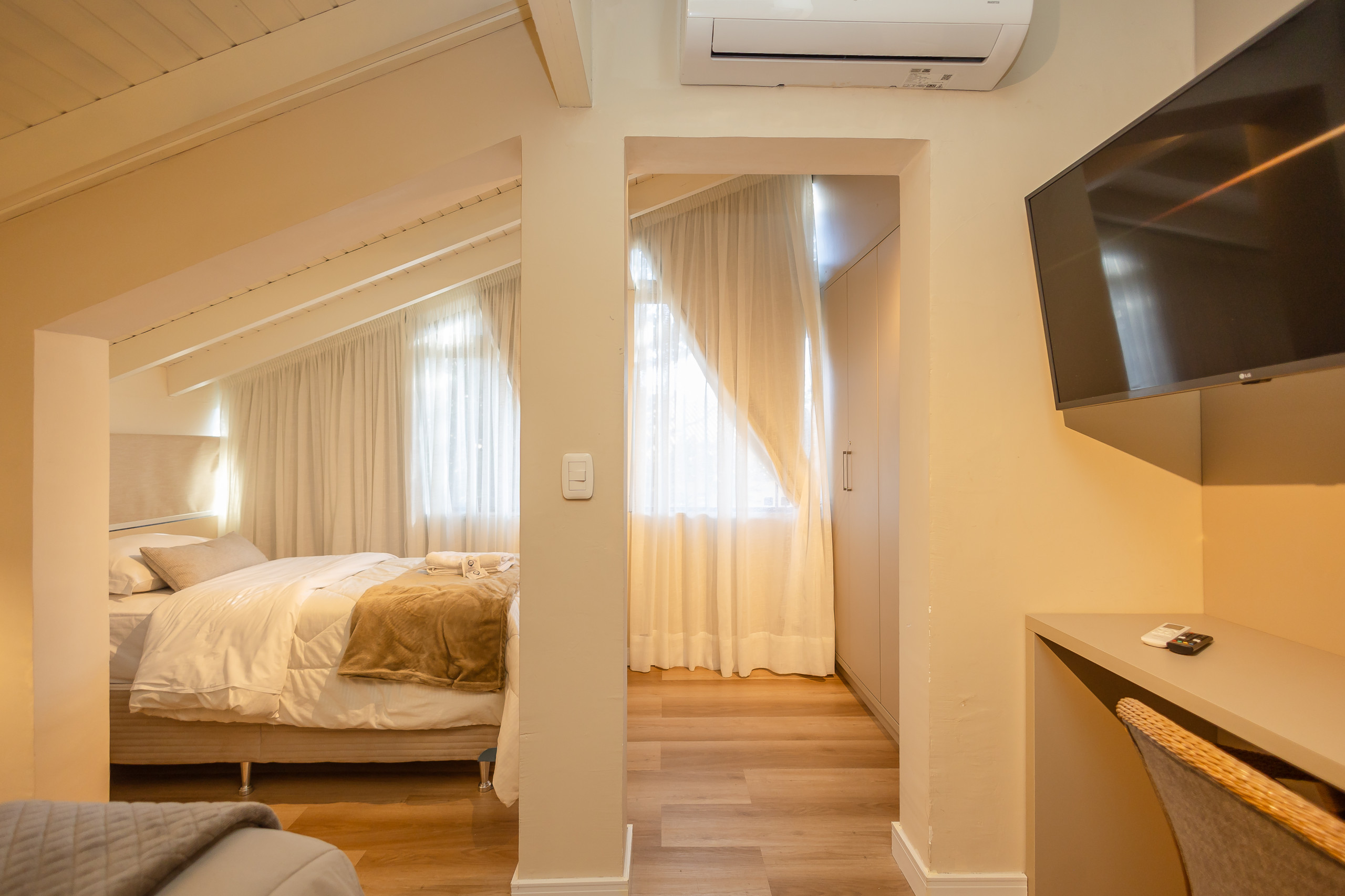It has 4 bedrooms and 4 bathrooms (3 suites, one bedroom, and 1 full social bathroom) air-conditioned with hot/cold split and smart TV. It also features a climatized living area with 4 environments (living room, dining room, fully equipped open-plan kitchen, and closed balcony with a view of the square) with fireplace and barbecue area. You will also have at your disposal washer and dryer, dishwasher, high-speed internet, and a complete high-standard linen set for your stay.