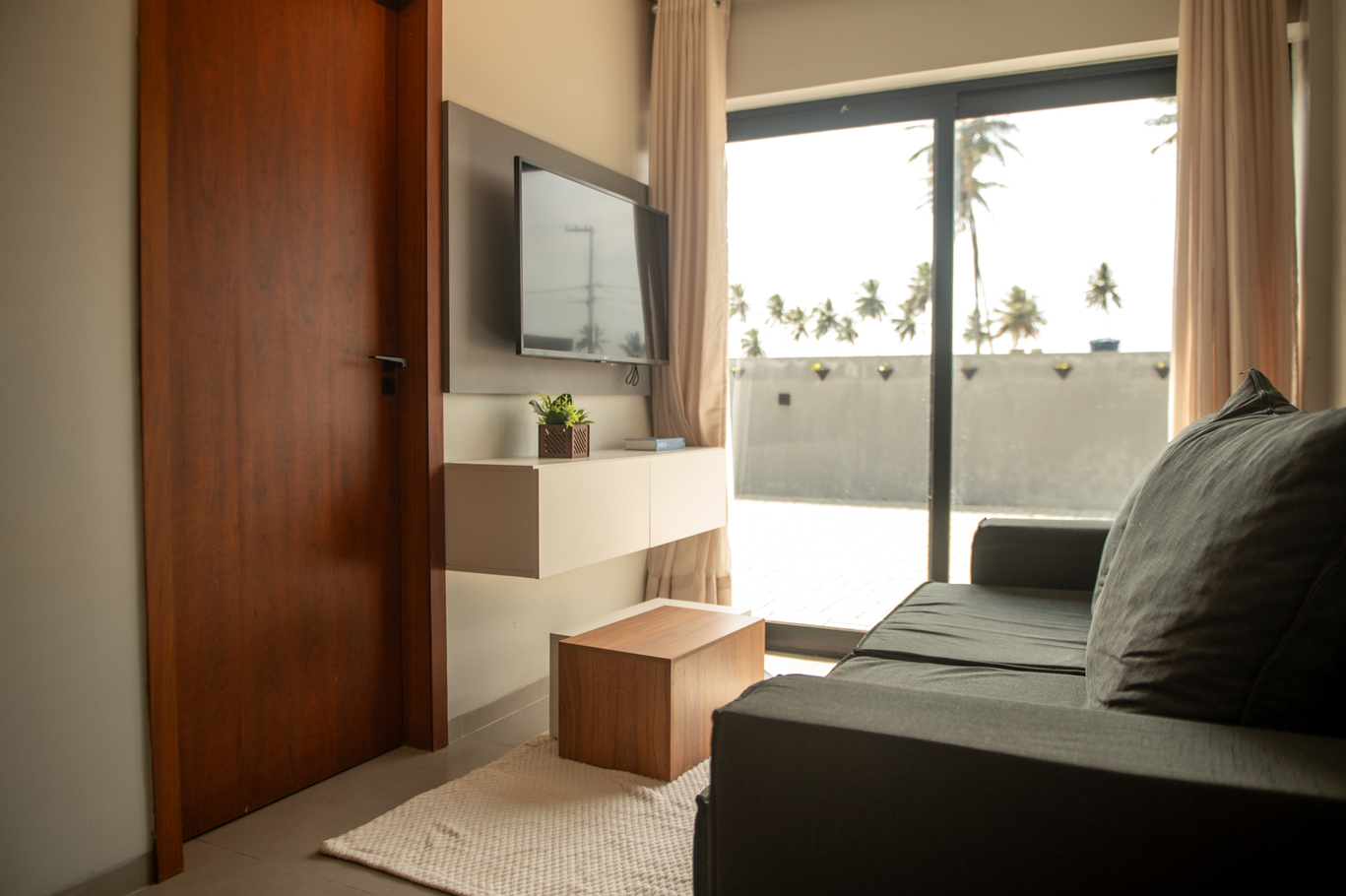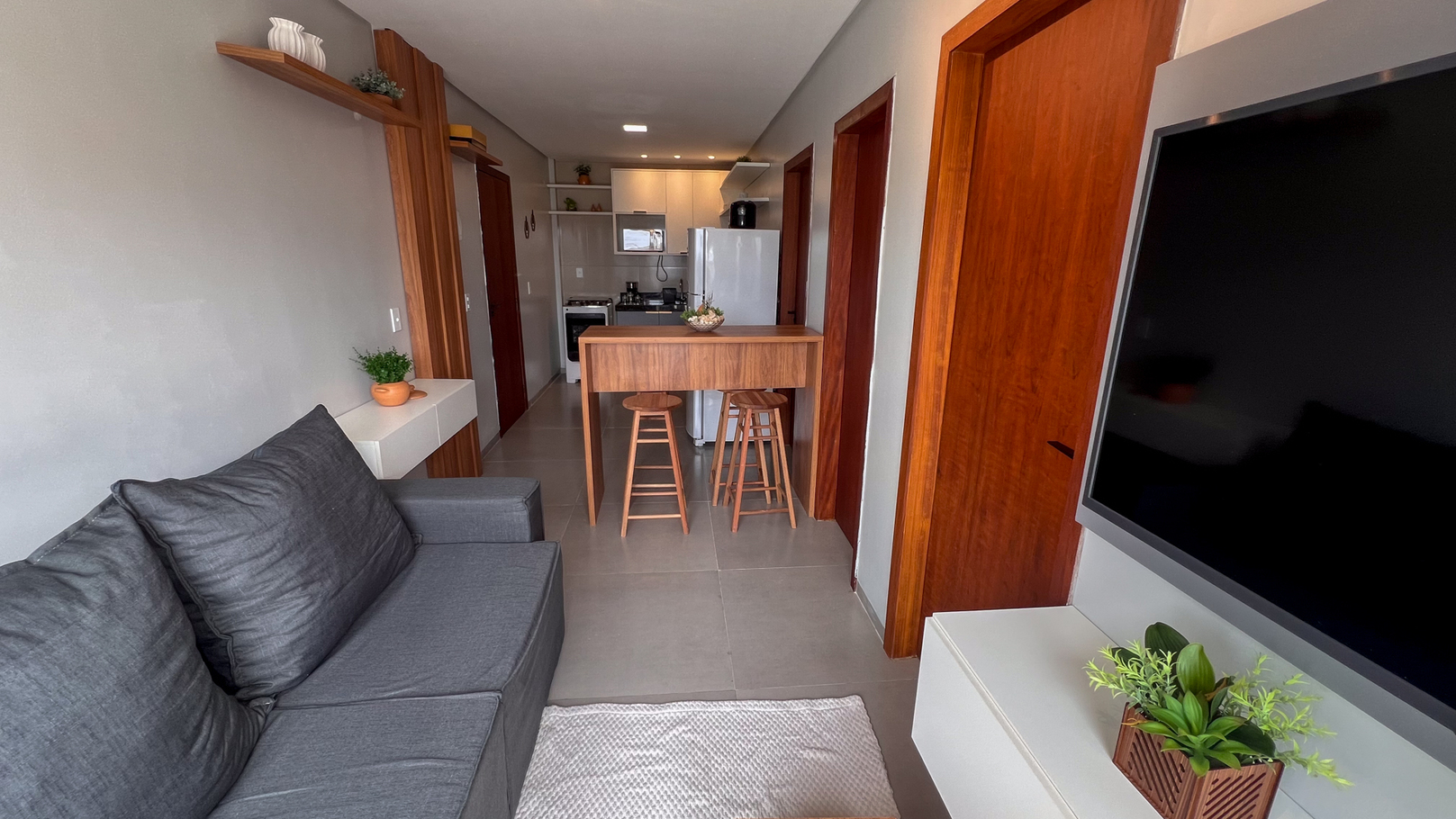 - Integrated living room and kitchen with sofa, Smart TV and balcony