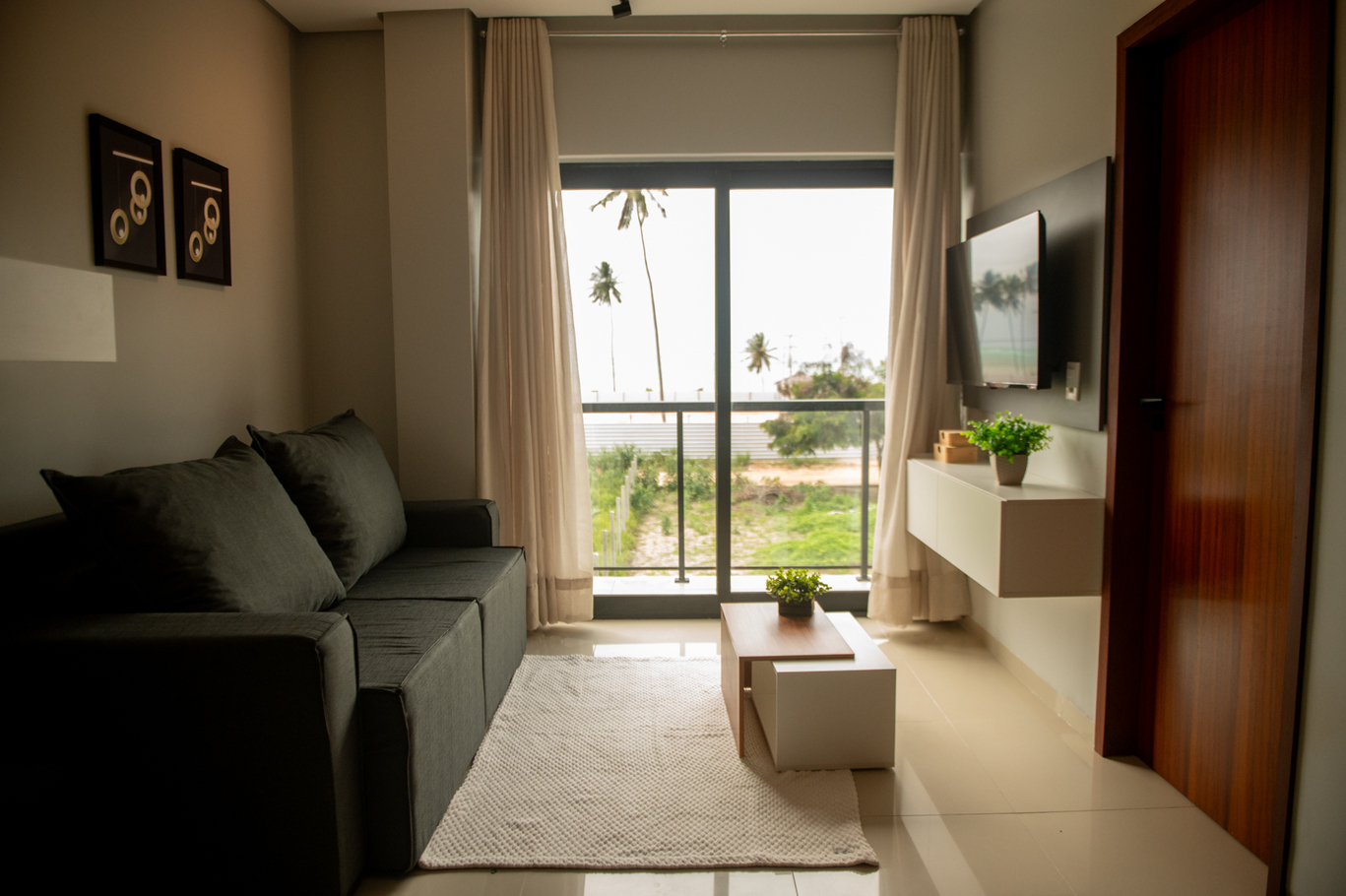 - Integrated living room and kitchen with sofa, Smart TV and balcony