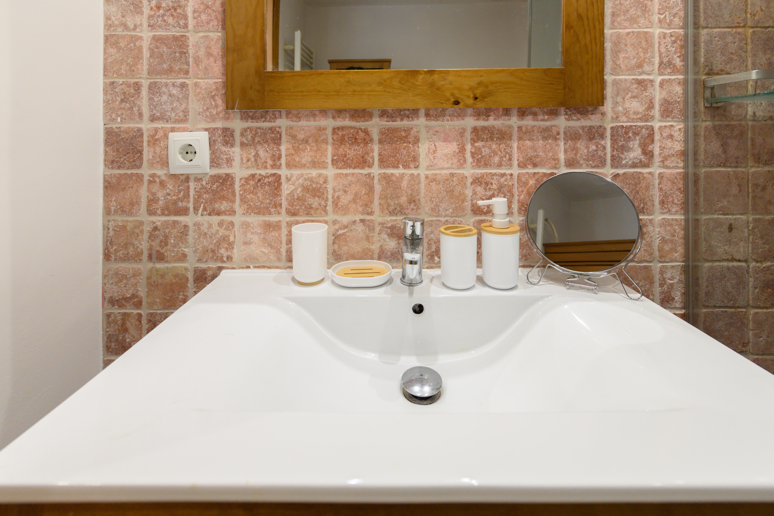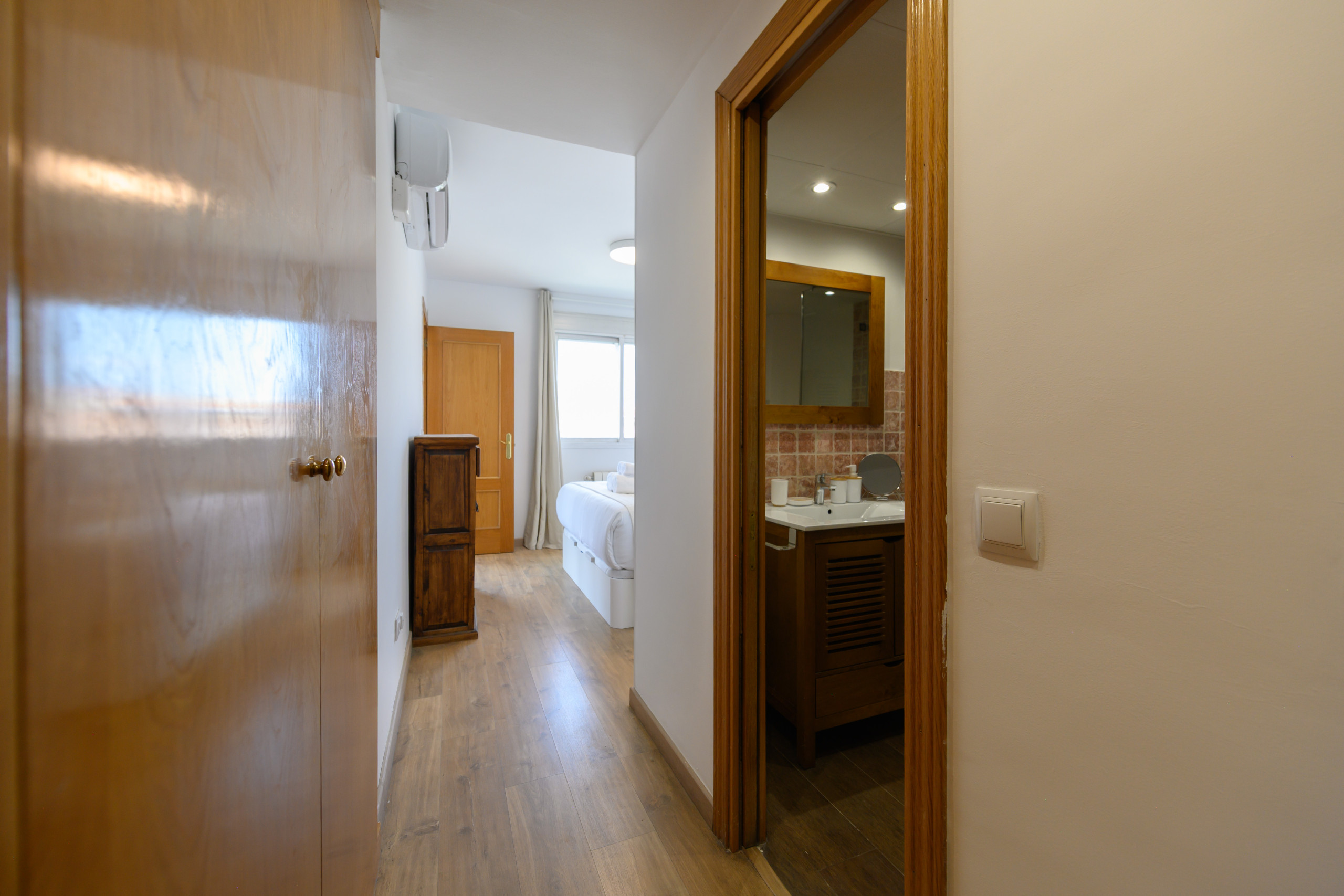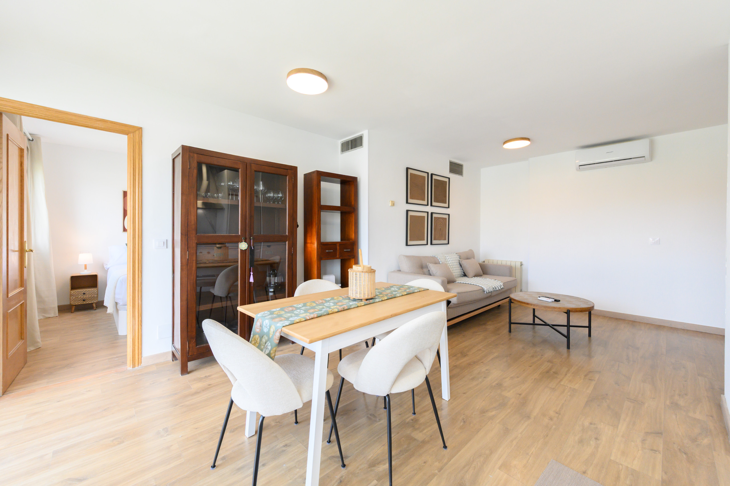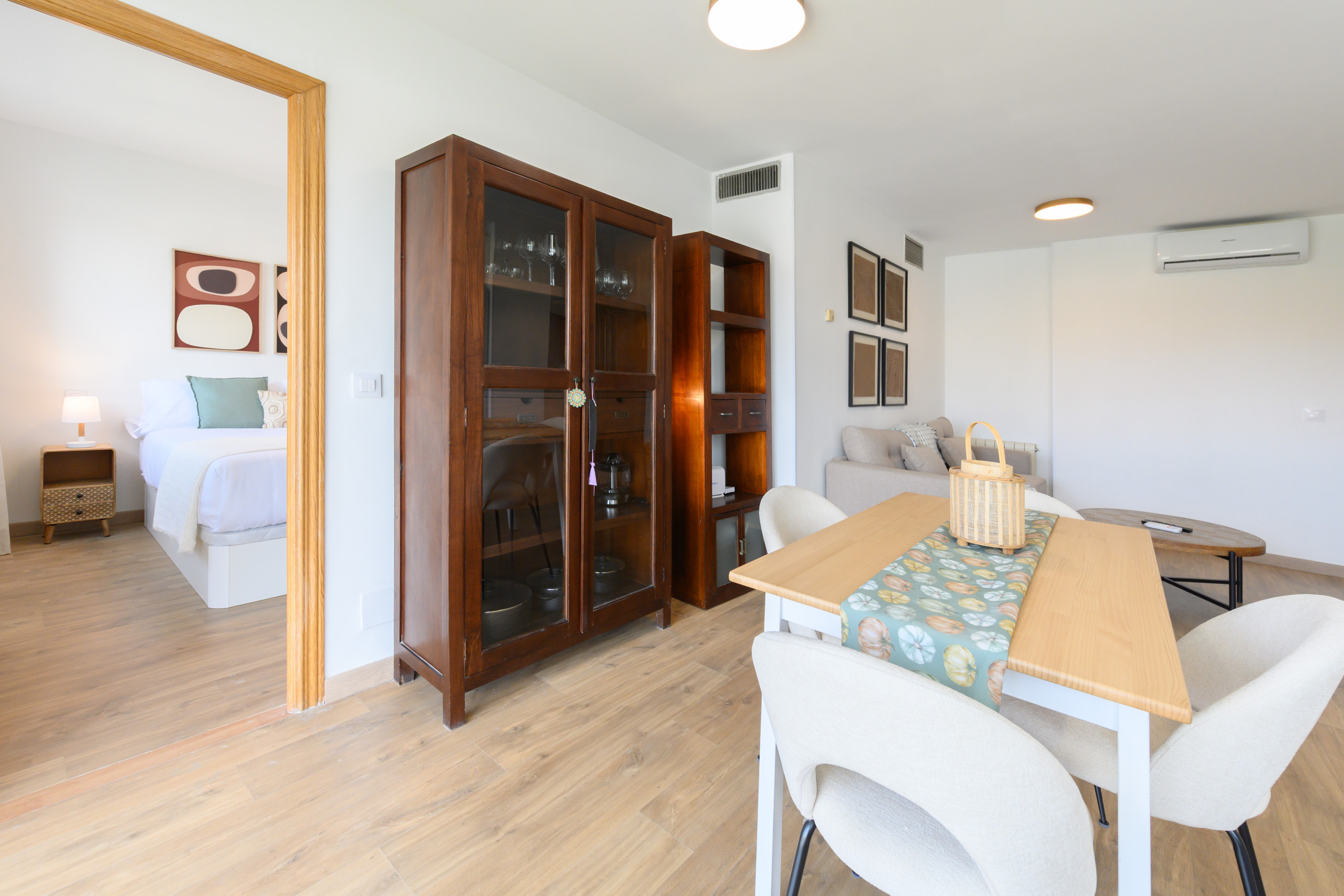 The kitchen, integrated into the main space, is fully equipped with all necessary appliances —fridge, oven, microwave, ceramic hob, extractor hood, dishwasher and washing machine— as well as having complete kitchenware and storage cupboards, which allows for enjoying a practical and pleasant culinary experience.