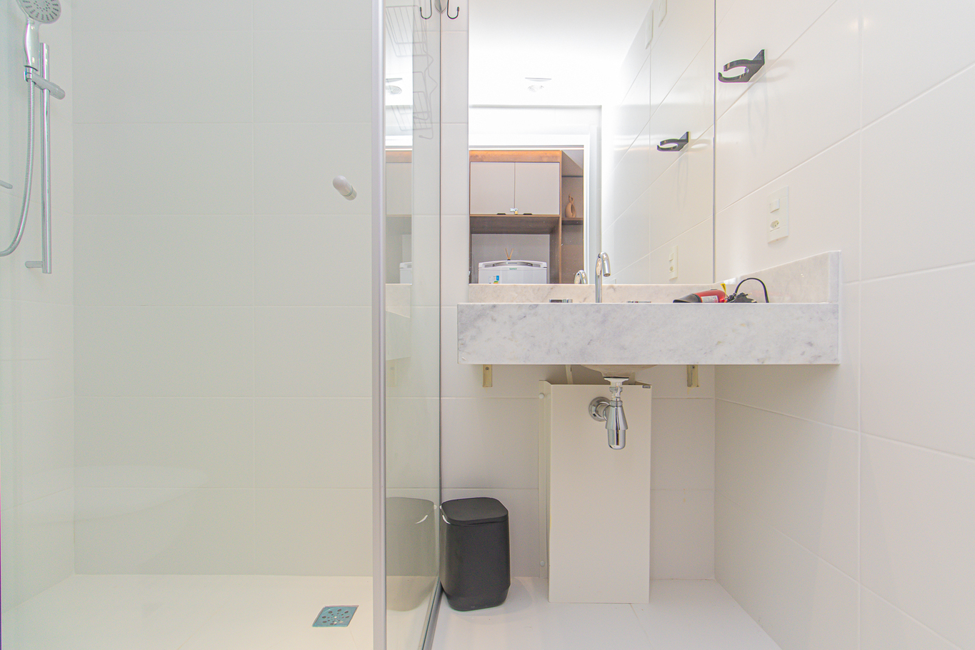 - The bathroom is modern and functional, with glass shower box, gas shower, bathtub and hair dryer