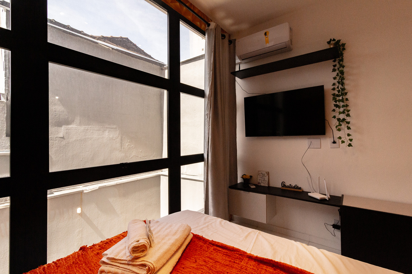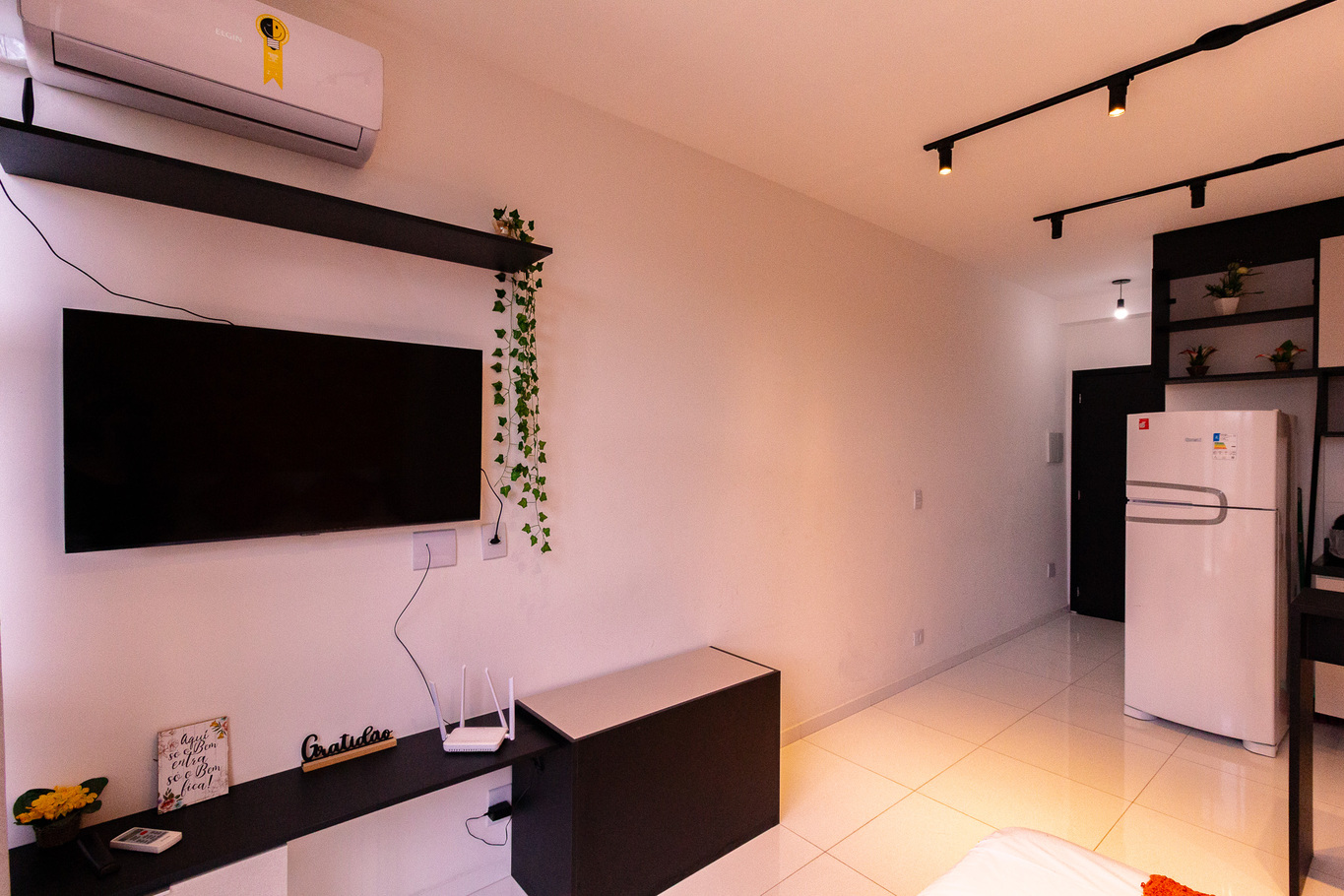 - Living room with smart TV, air conditioning and table