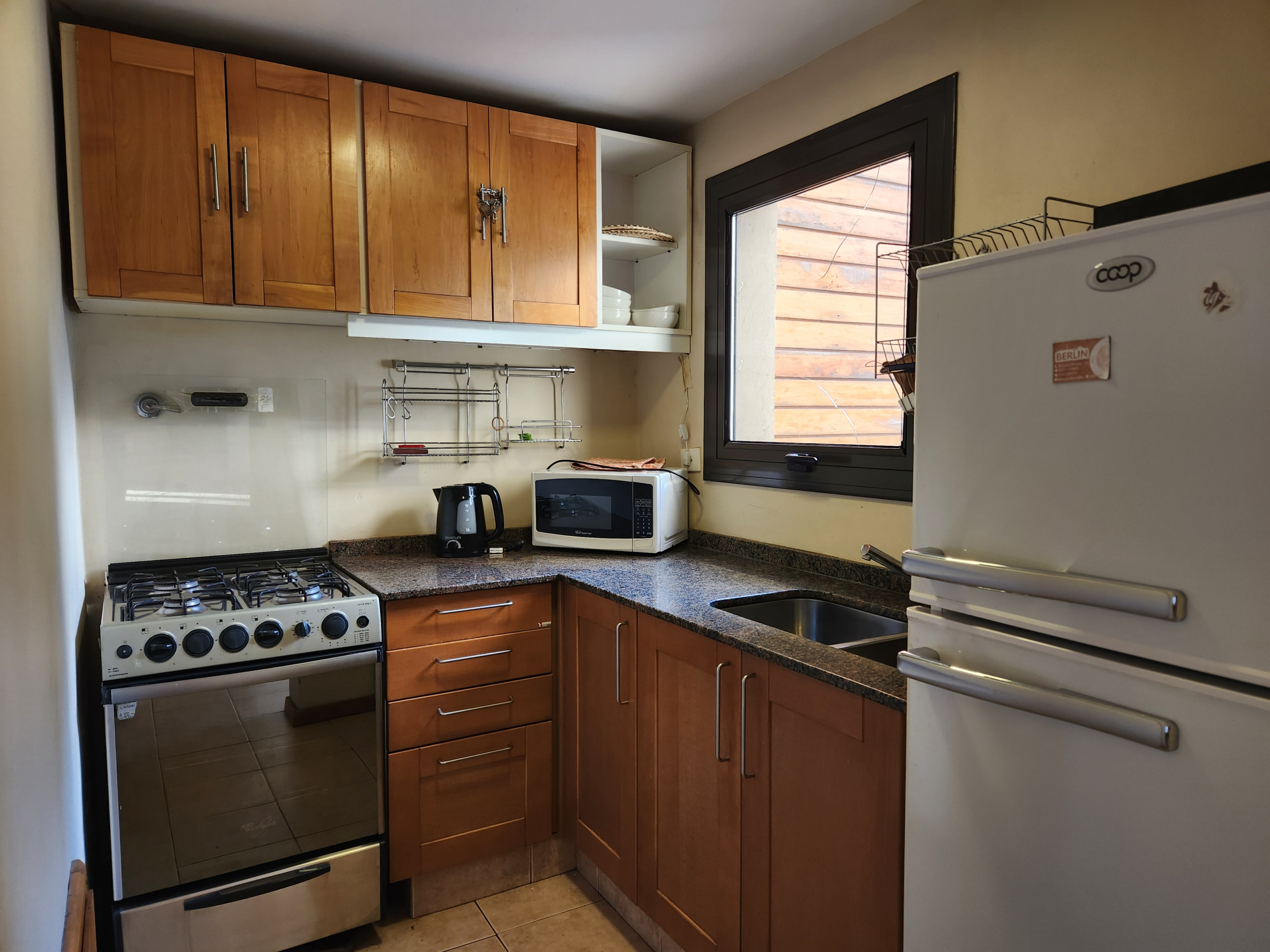 In the gas open plan kitchen, refrigerator, microwave, oven, freezer, dishes/cutlery, kitchen utensils, coffee machine, toaster and kettle are provided.
