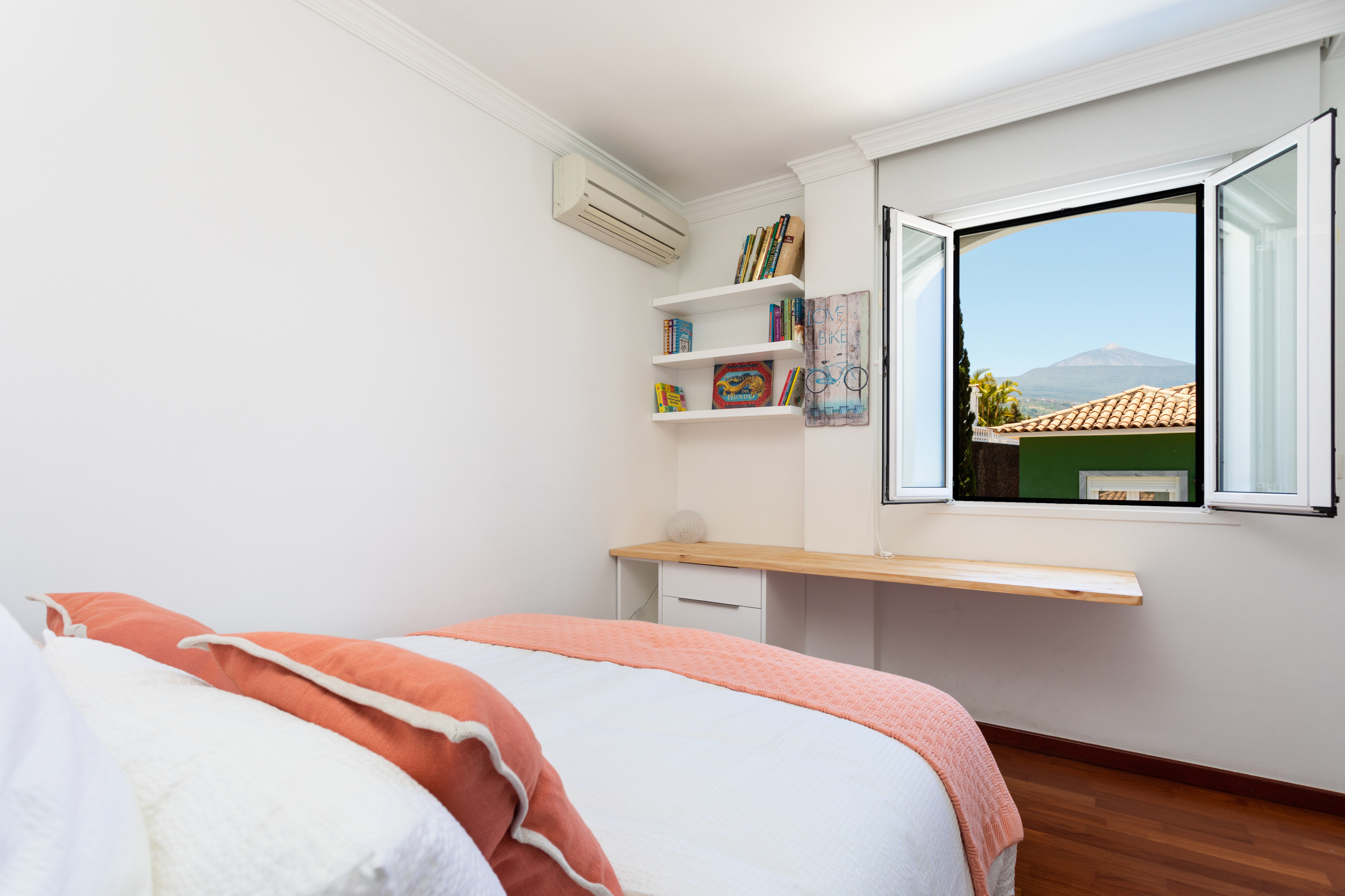 Going up to the upper floor, there are three bedrooms, all equipped with air conditioning, and two bathrooms, one of which is en suite. The main bedroom has a balcony with a spectacular view of Teide and the sea.