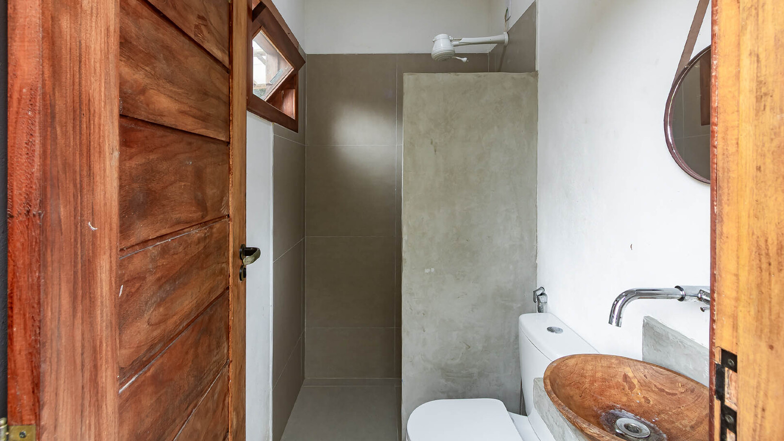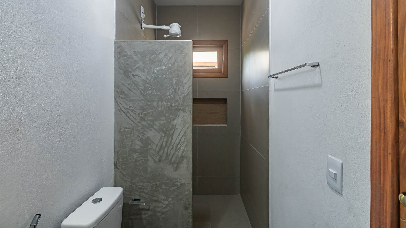 - Social bathroom (ground floor) with electric shower and burnt cement-style box