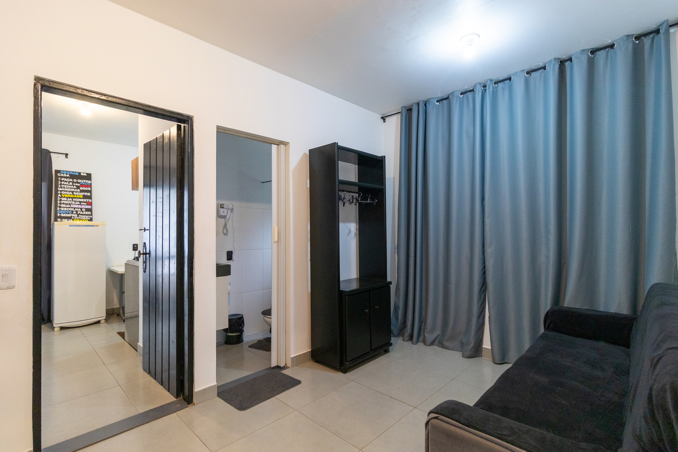 - Living room with integrated bedroom with double bed, sofa bed, Smart TV and ceiling fan