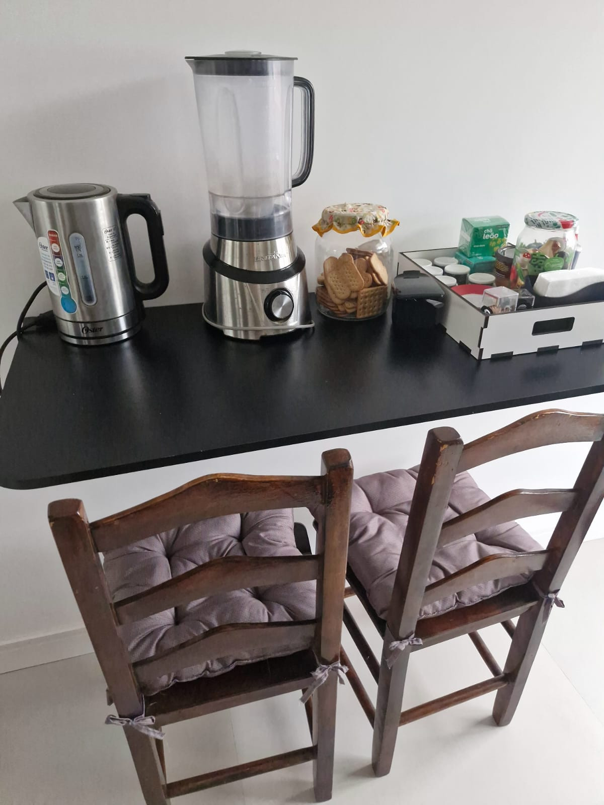 - The kitchen, on the ground floor, has an electric kettle, refrigerator, cooktop, oven with air fryer, blender, dishwasher, microwave, toaster, and water filter (except salt, pepper, and oil)
