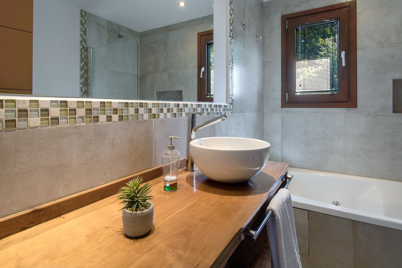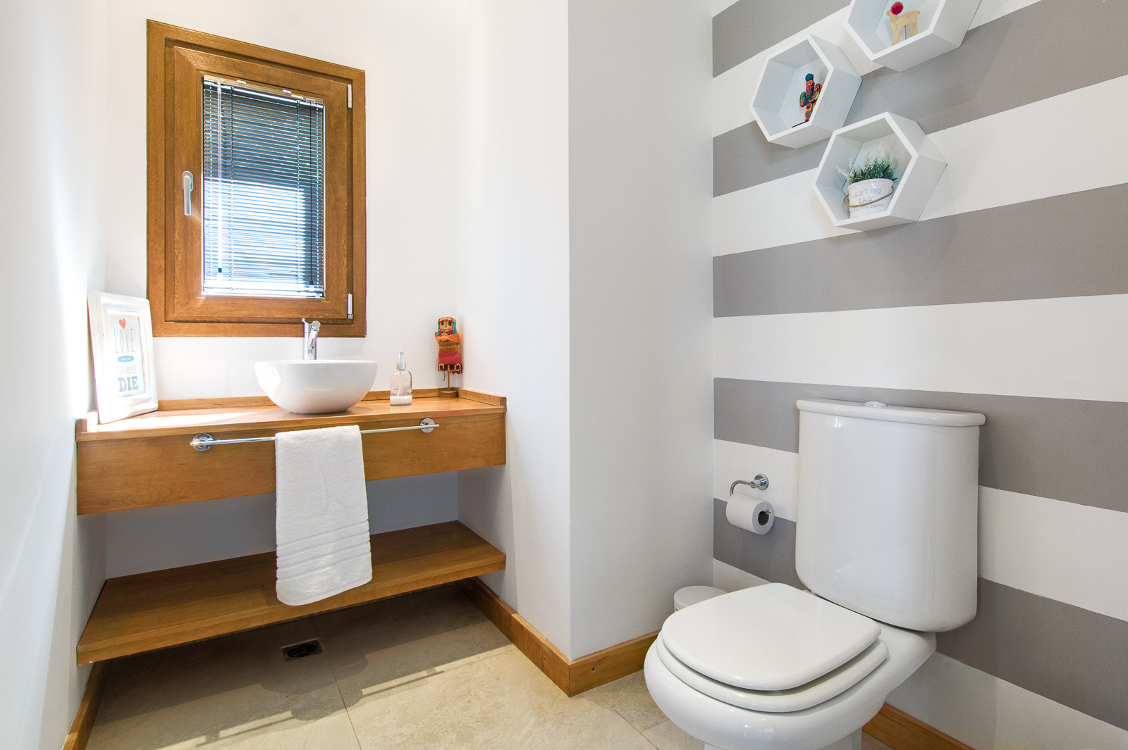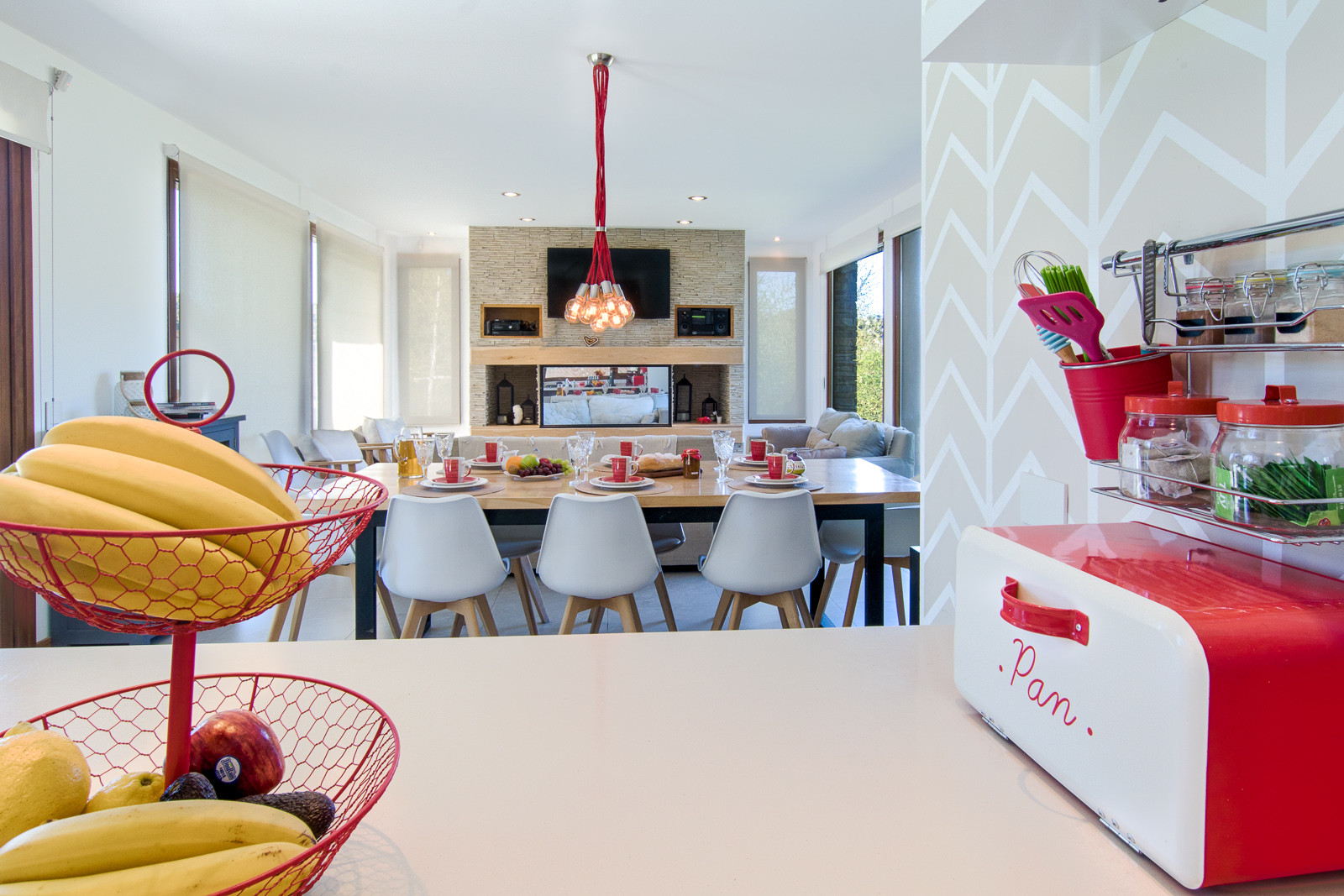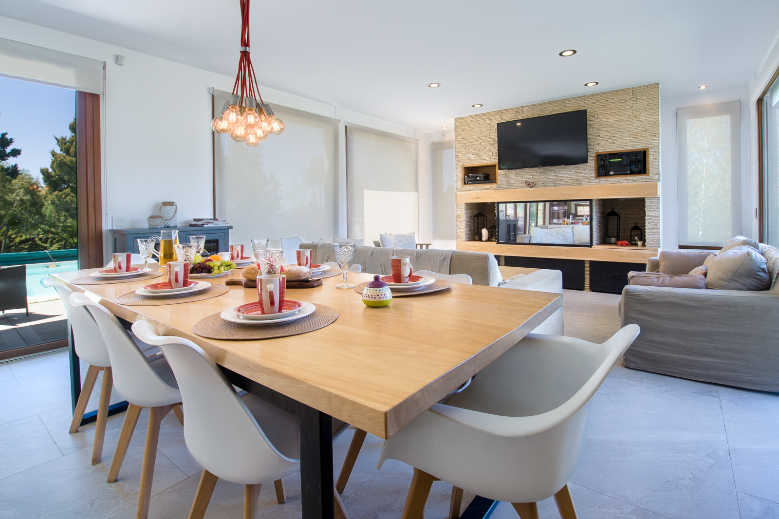 "Family Home is an ideal house for families, featuring 4 bedrooms: one with a double bed, one with a trundle bed, one with bunk beds, and one on the ground floor with a daybed (a bed with a pull-out trundle). It includes 2 full bathrooms, a half-bath, a fully equipped kitchen with a laundry area, washing machine, and dryer. The living and dining area has a grill concealed behind a mirror, which is really practical. The garden is perfect for enjoyment with a heated pool and children's play equipment."
