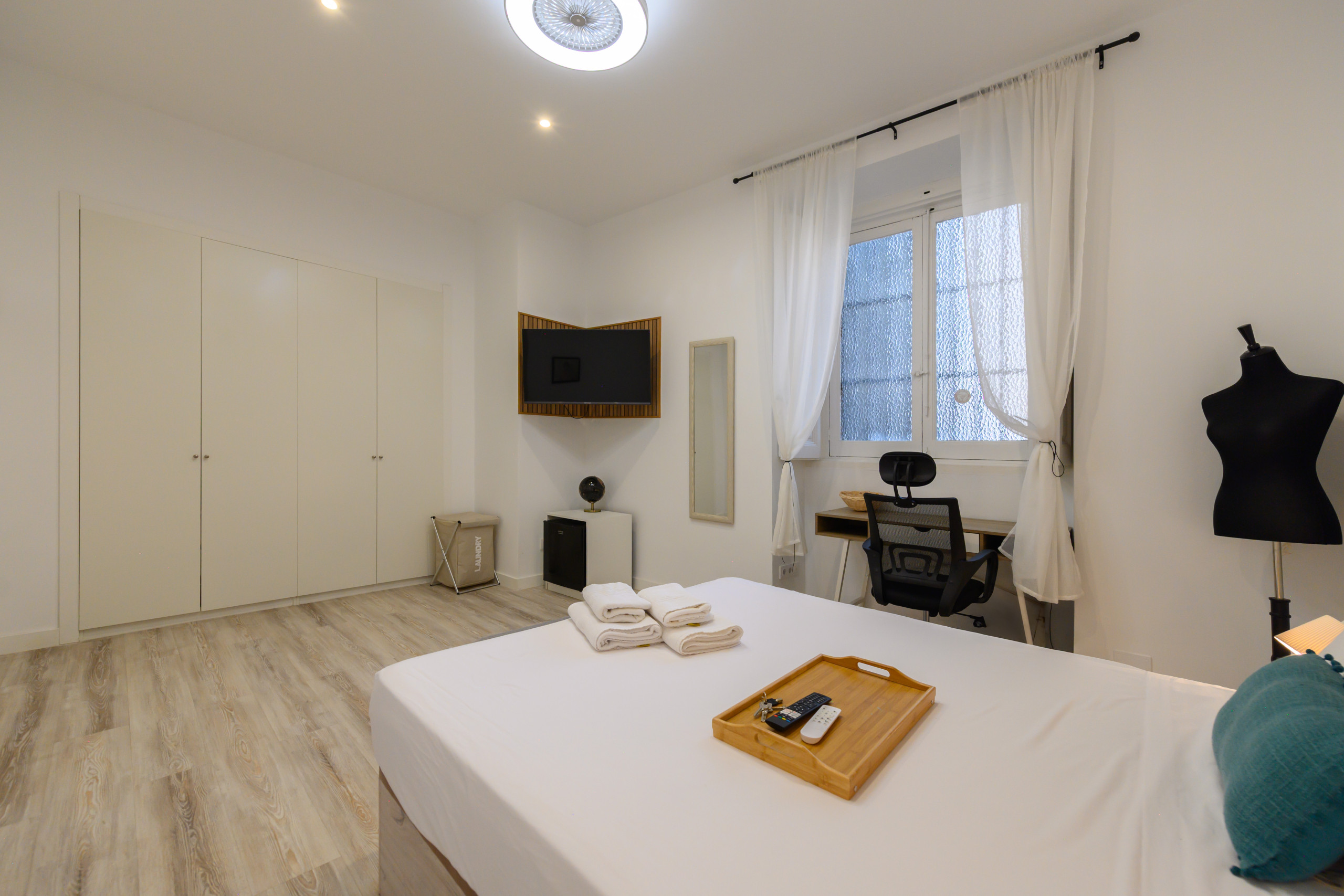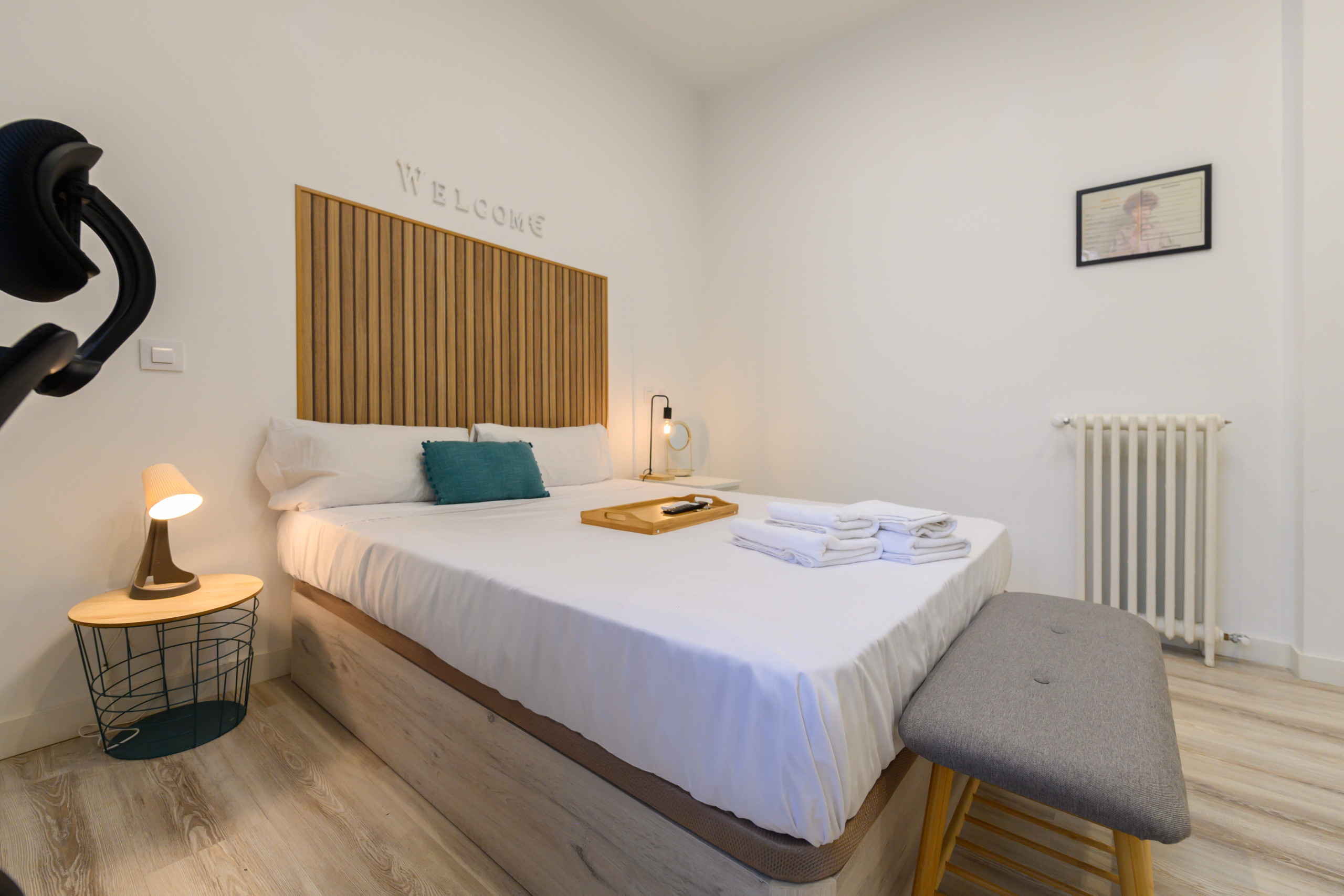 Temporary Rental Flat. Room 6 - Madrid: VIP PREMIUM Room with own walk-in wardrobe, inside the San Bernardo10 property. Strategically located, it offers all the amenities that any student might demand. From the bed with a premium mattress, storage bed base, desk + chair, to smart TV, air conditioning, safe, iron + ironing board, wireless charger, smart lock, 2 sets of towels and sheets.