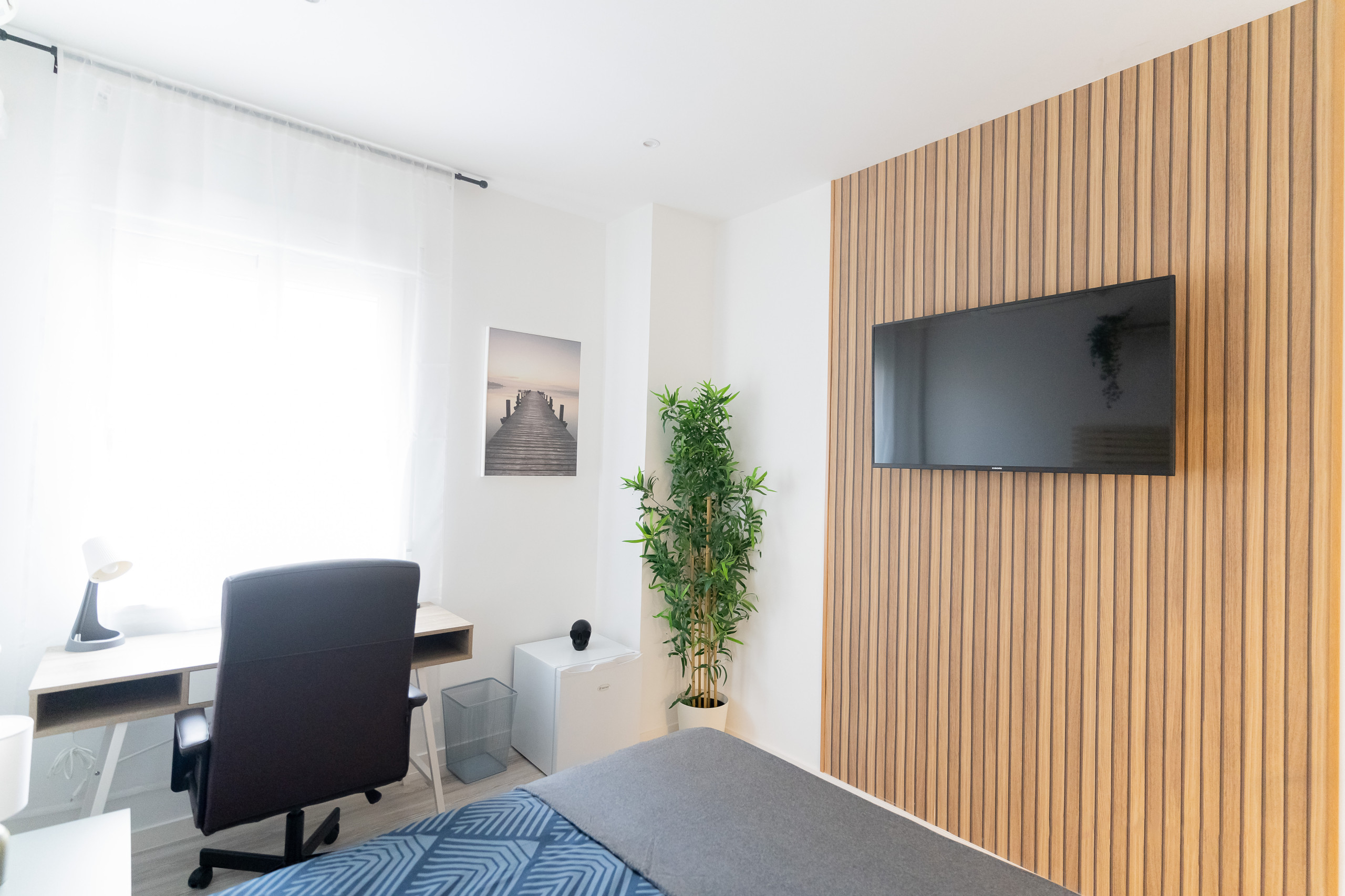 Paris Room: It has all the amenities, a bed with a premium 135 mattress, bed base with large storage, desk + chair, wardrobes, up to 42" flat smart TV, air conditioning, safe, High-Speed Internet Connection, Fridge, Safe, Bluetooth Speaker, Wireless Charger, Iron+board, Smart Lock, 2 sets of towels, sheets,