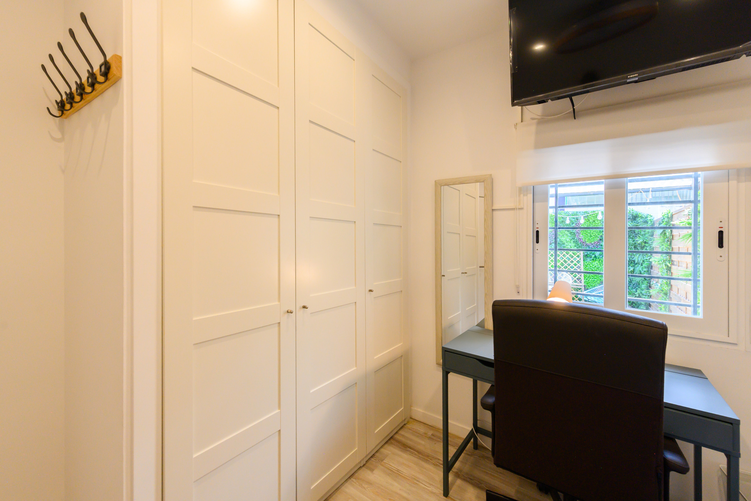 Room 3–Tarija: Relax room within the Hogar de Belén housing, equipped with all amenities from a bed with a premium 135 mattress, storage bed base, desk + chair, to smart TV, air conditioning, safe, etc safe, private bathroom inside the room, iron+ironing board, wireless charger, smart lock, 2 sets of towels, sheets.