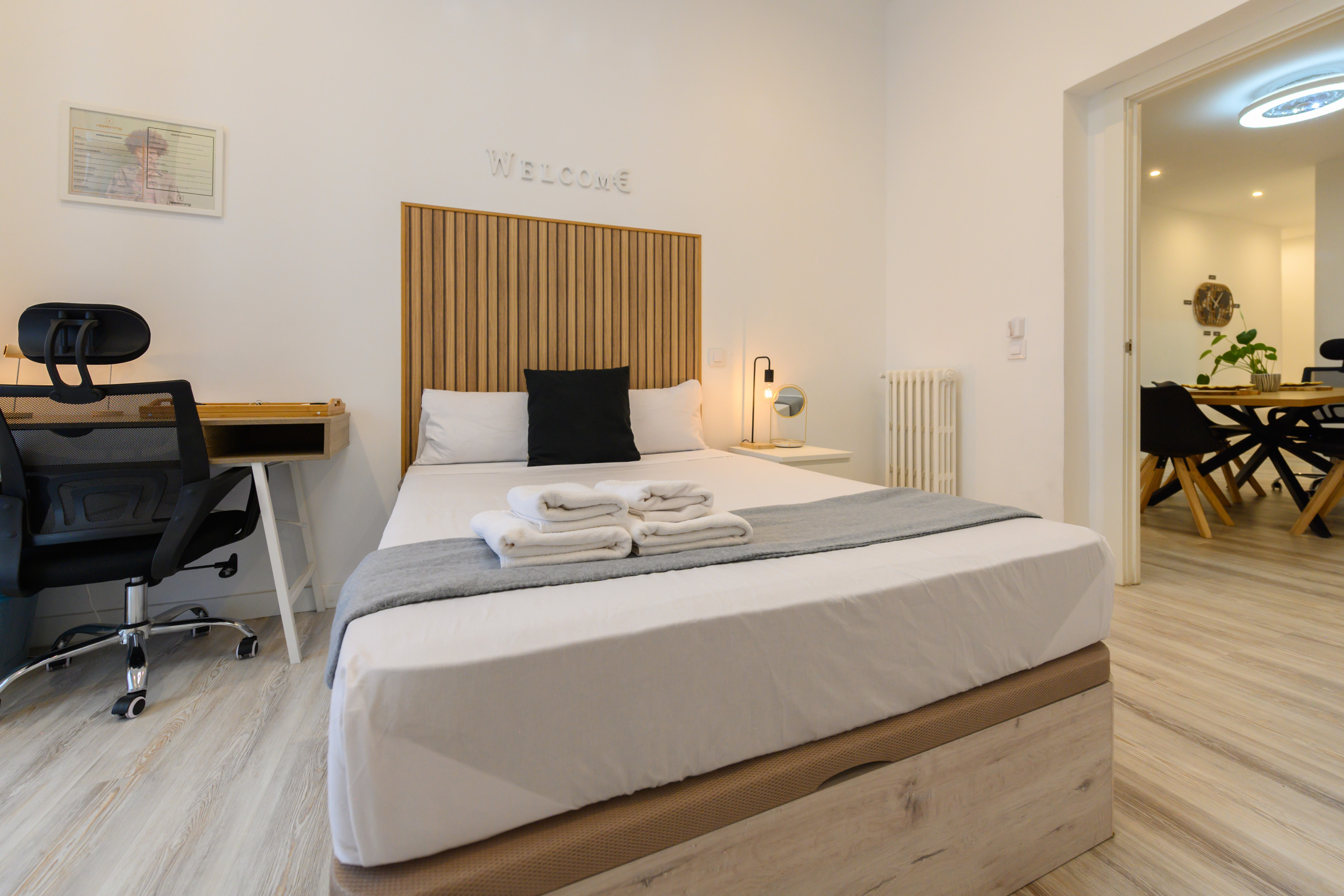 Temporary Rental Floor. Room 5 - Zurich: VIP PREMIUM Room with glazed balcony, with views. Located on the fifth exterior within the dwelling, it has all amenities, from the bed with a premium mattress, storage bed base, desk + chair, to smart TV, air conditioning, safe, iron+ironing board, wireless charger, smart lock, 2 sets of towels and sheets.