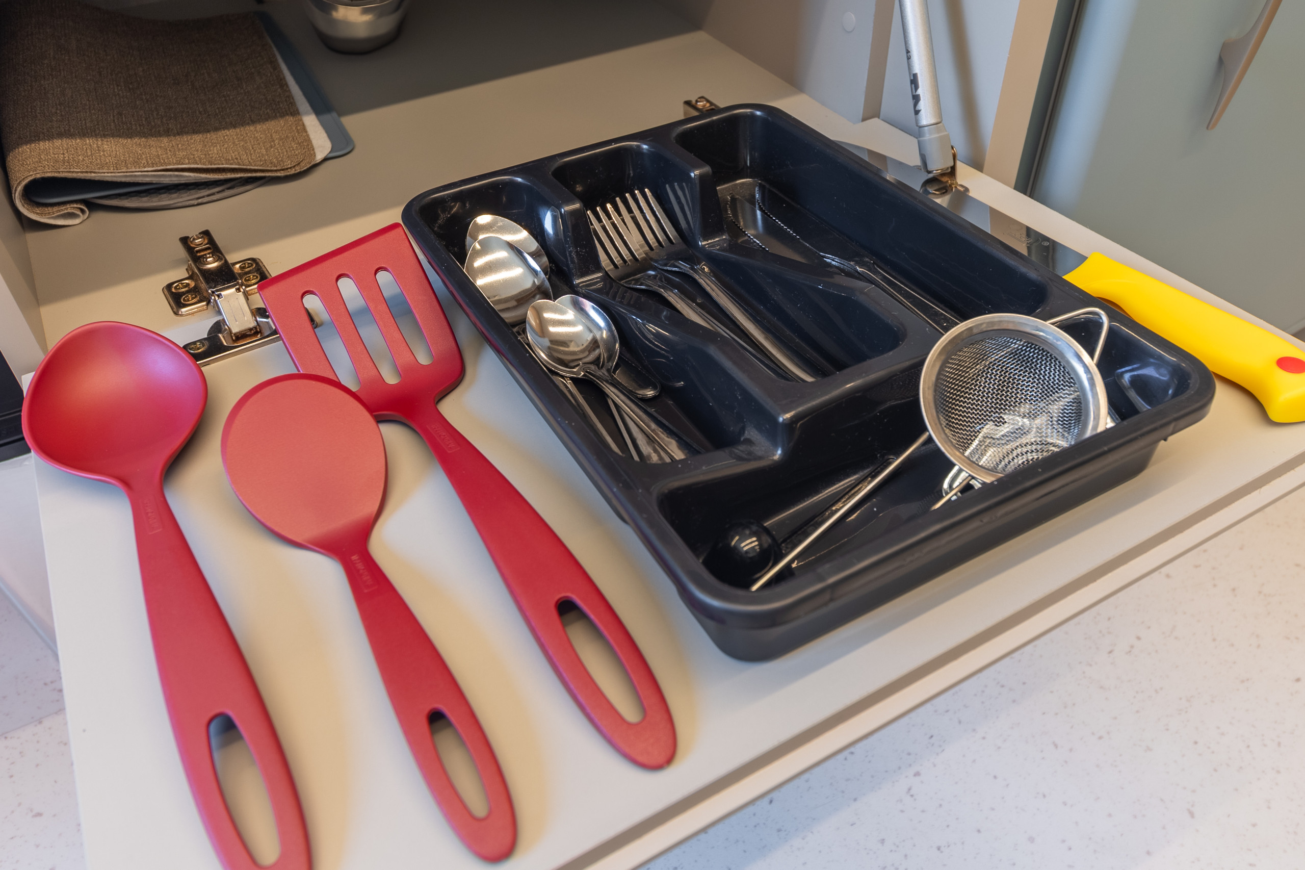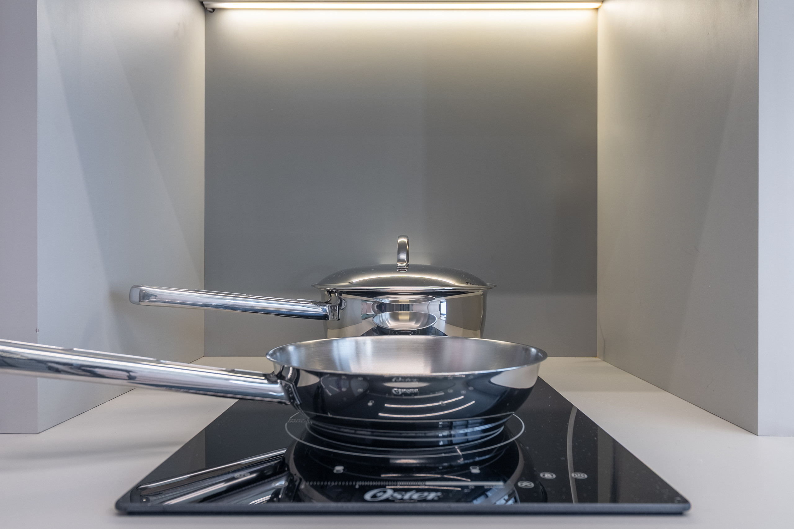 In the induction open plan kitchen, refrigerator, microwave, freezer, dishes/cutlery, kitchen utensils, coffee machine and toaster are provided.