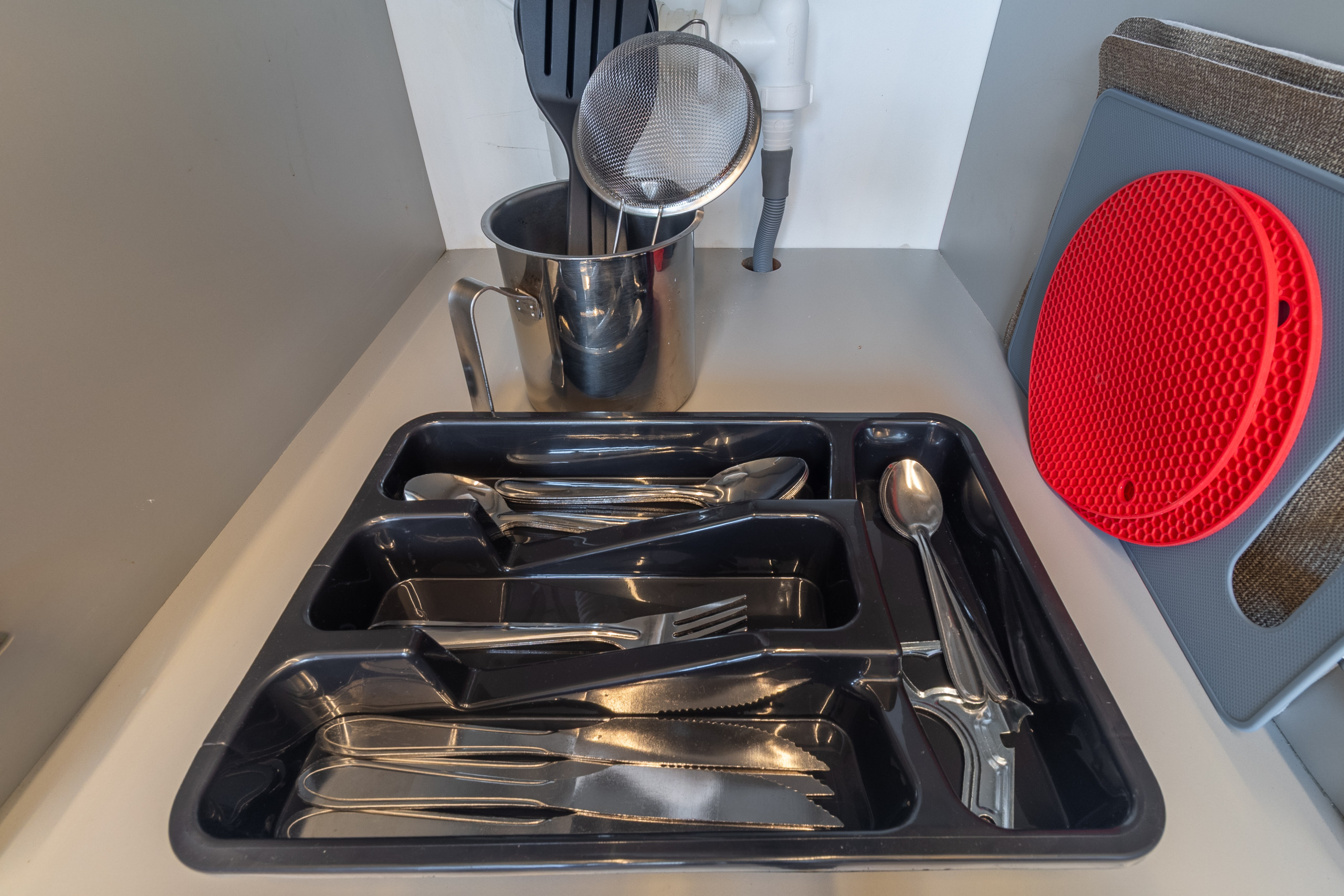In the induction open plan kitchen, refrigerator, microwave, freezer, dishes/cutlery, kitchen utensils, coffee machine and toaster are provided.