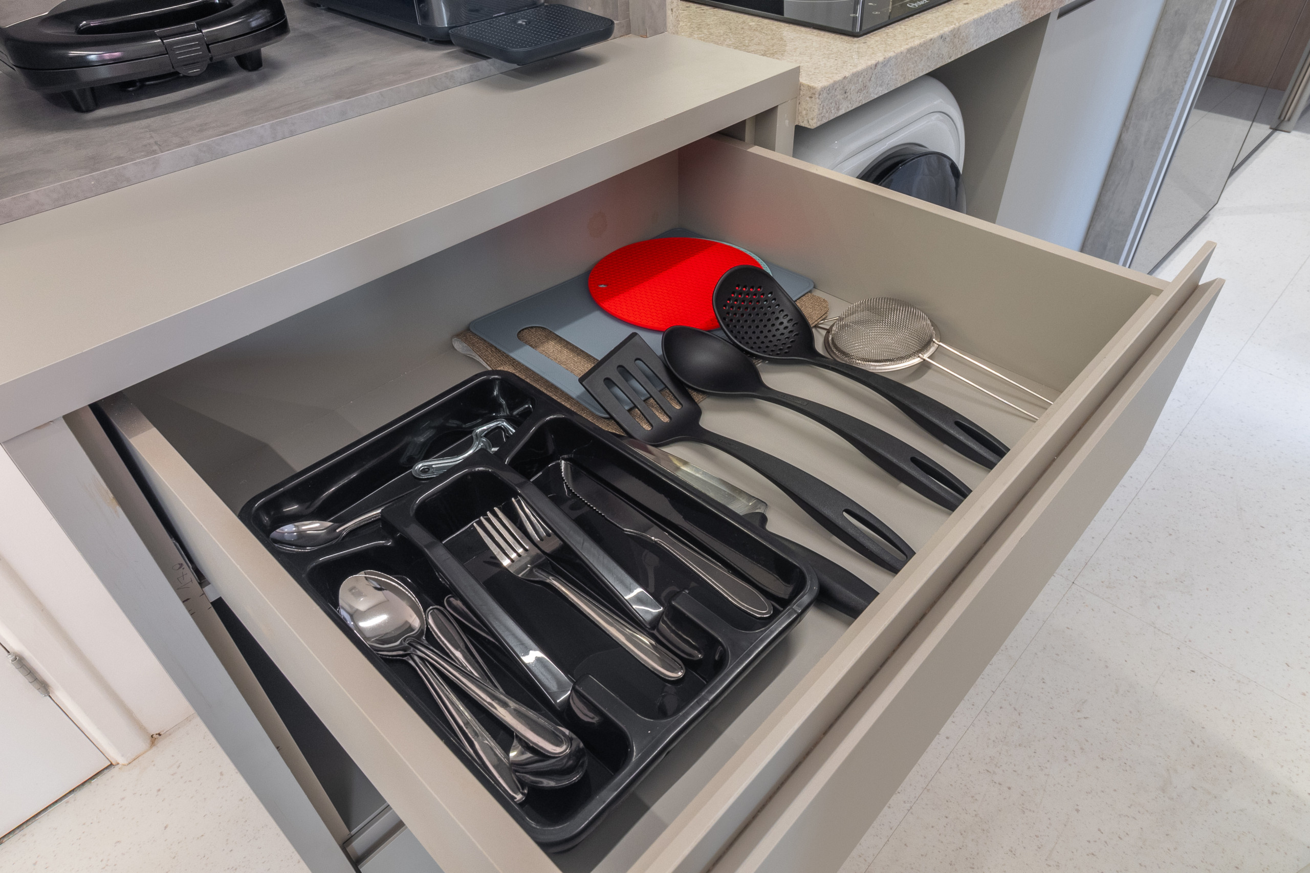 In the induction open plan kitchen, refrigerator, microwave, freezer, dishes/cutlery, kitchen utensils, coffee machine and toaster are provided.