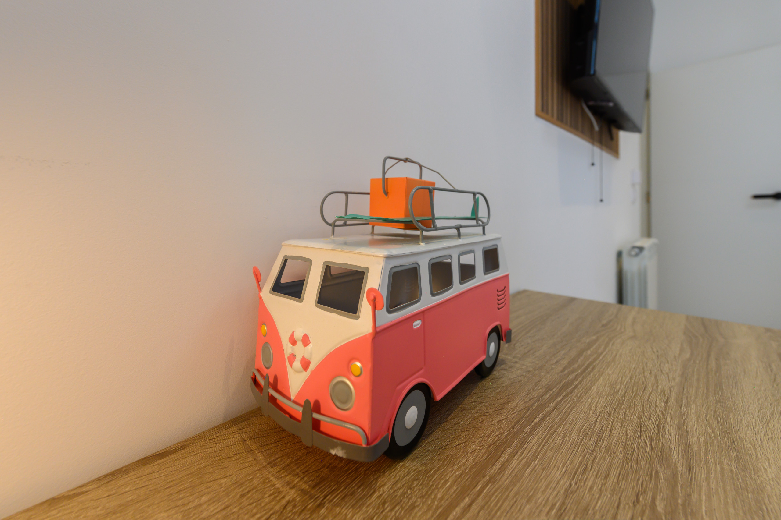 Habitación 3 –Barcelona: Habitación premium, con balcón. Situada la tercera exterior dentro de la vivienda, cuenta con todas las comodidades, desde la cama con un colchón premium, canapé con gran almacenaje, escritorio + silla, hasta smart TV, climatización, caja fuerte, fuerte plancha+tabla, cargador inalámbrico, cerradura inteligente, 2 juegos de toallas y sábanas.