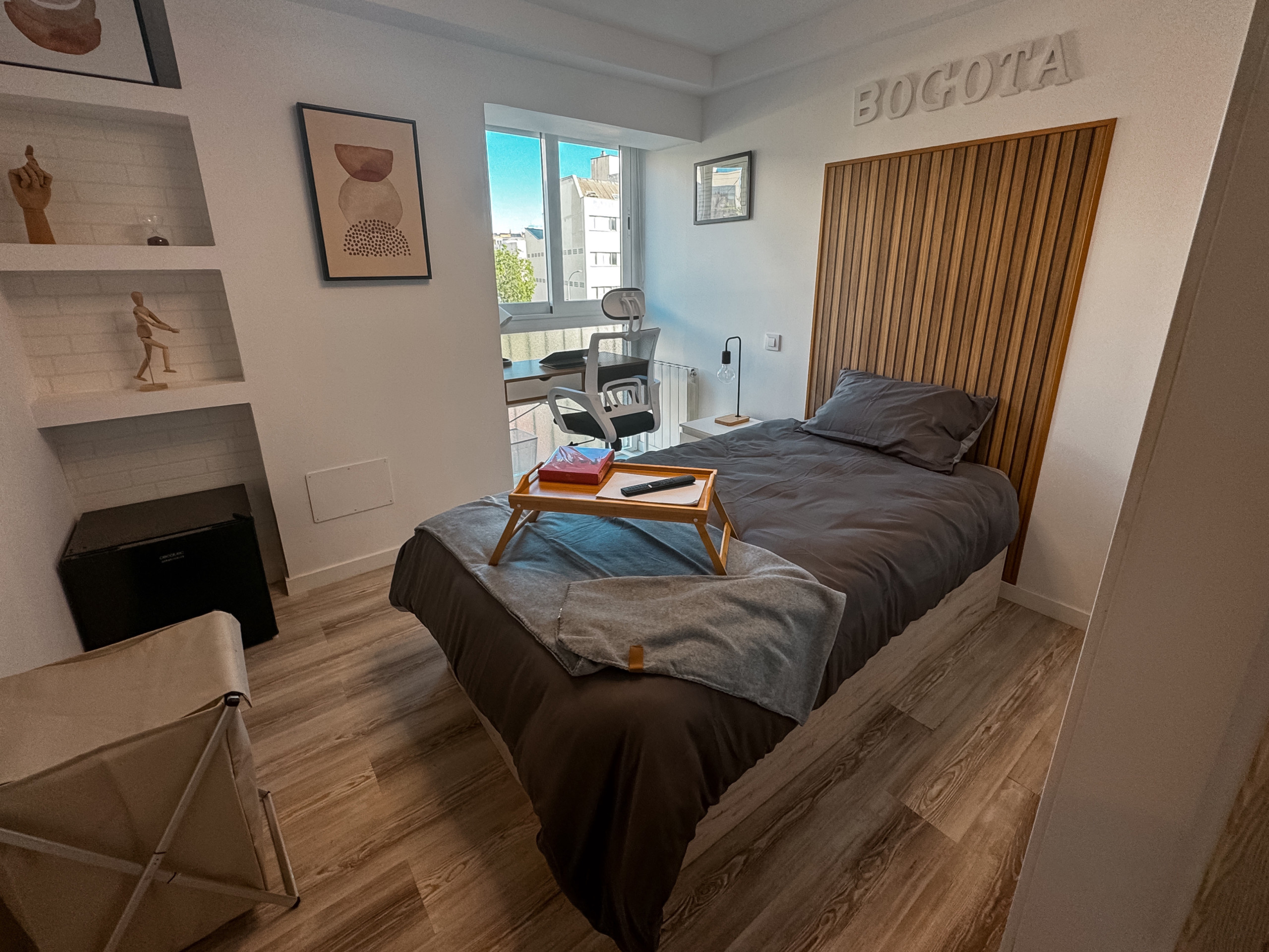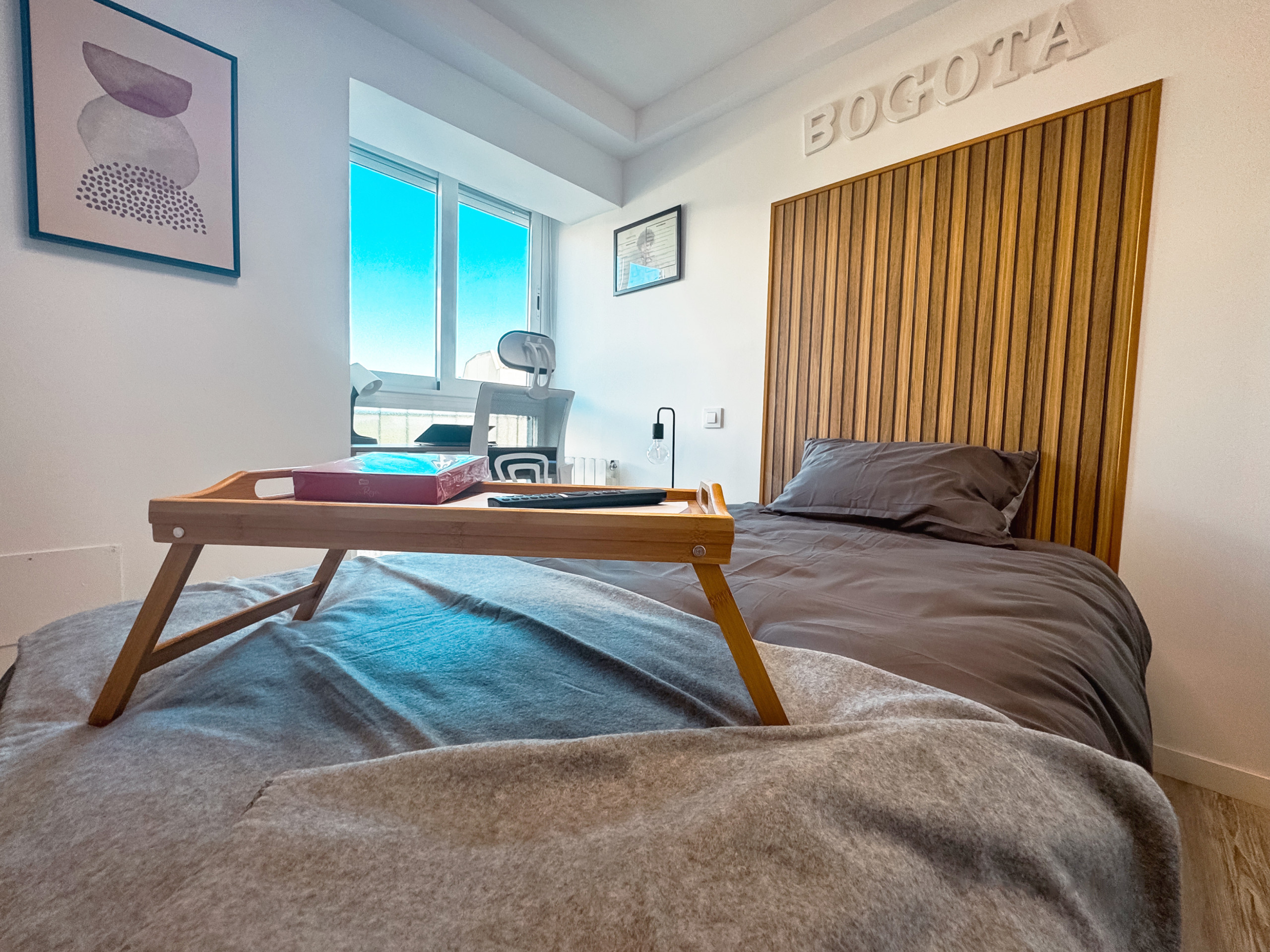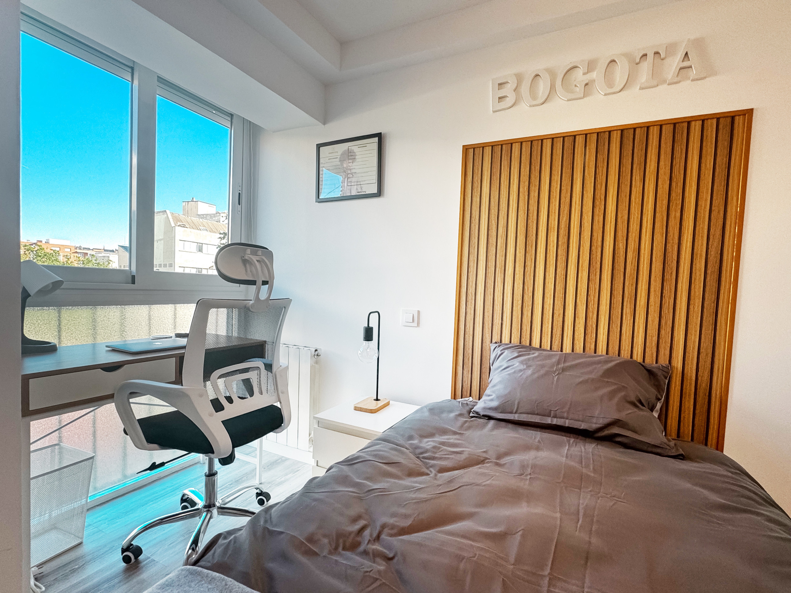 Habitación1– Bogotá: Habitación singular. Situada la primera al entrar a la vivienda, cuenta con todas las comodidades, desde la cama con un colchón premium, canapé con gran almacenaje, escritorio + silla, hasta smart TV, climatización, caja fuerte, plancha+tabla, cargador inalámbrico, cerradura inteligente, 2 juegos de toallas y sábanas.