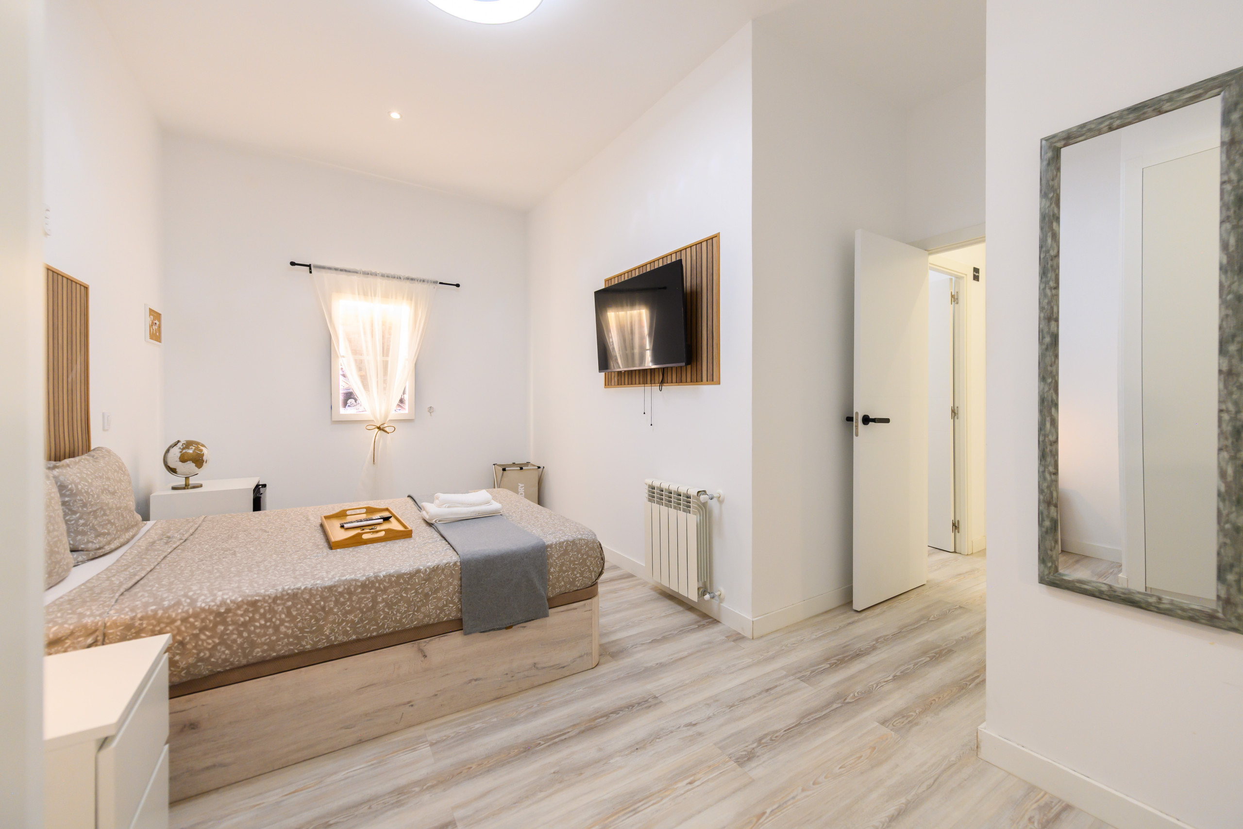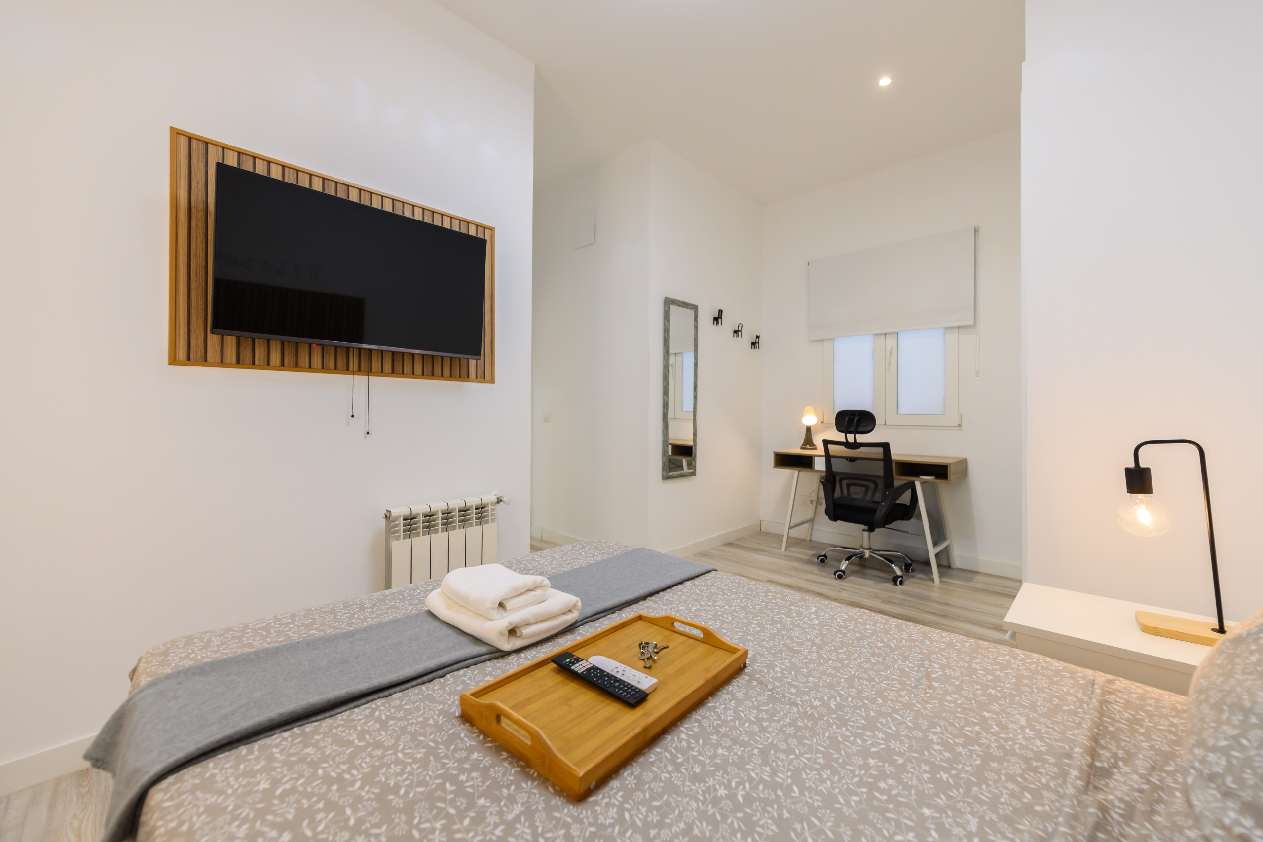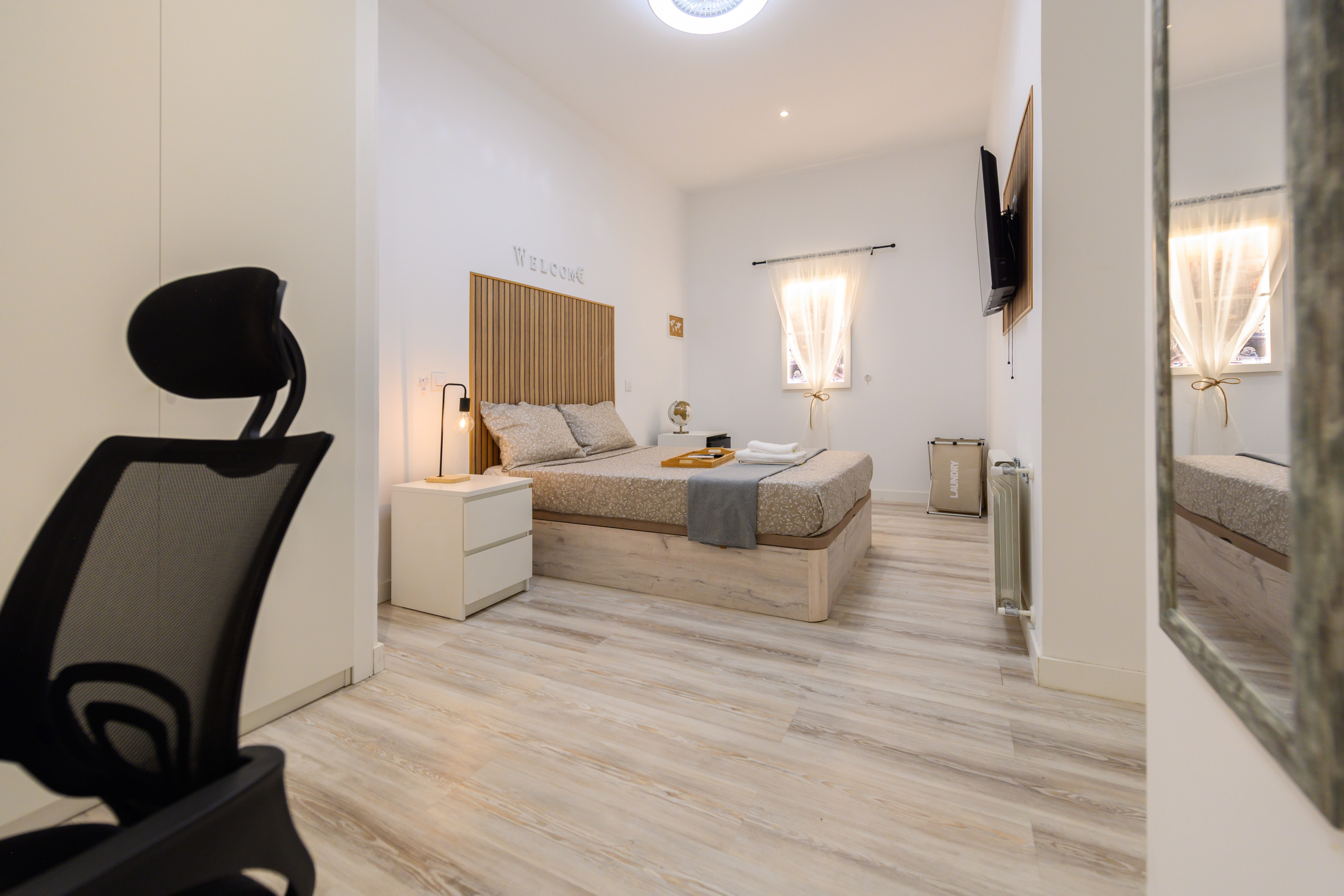 Habitación 8 – Roma: Habitación con encanto. Cuenta con todas las comodidades desde la cama con un colchón premium, canapé con gran almacenaje, escritorio + silla, hasta smart TV, climatización, caja fuerte, plancha+tabla, cargador inalámbrico, cerradura inteligente, 2 juegos de toallas y sábanas.