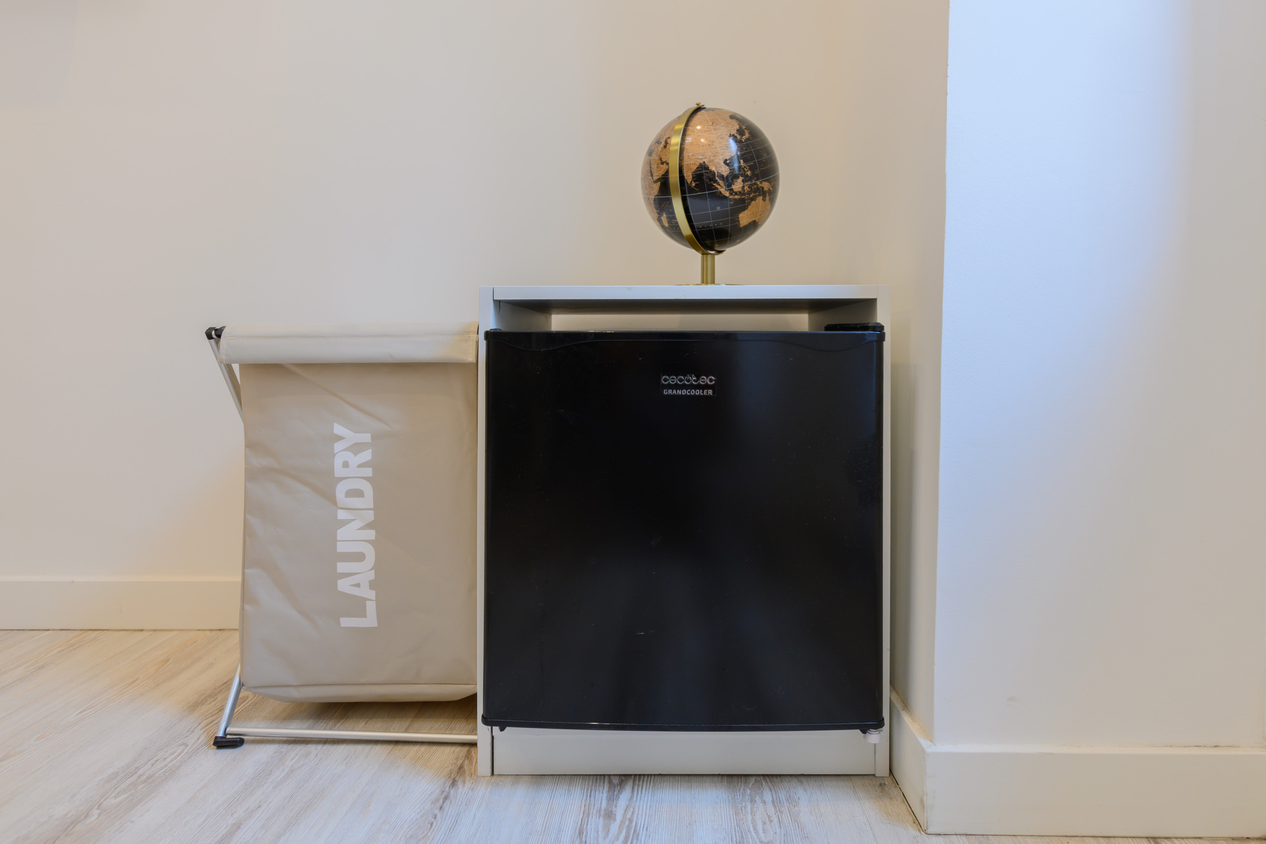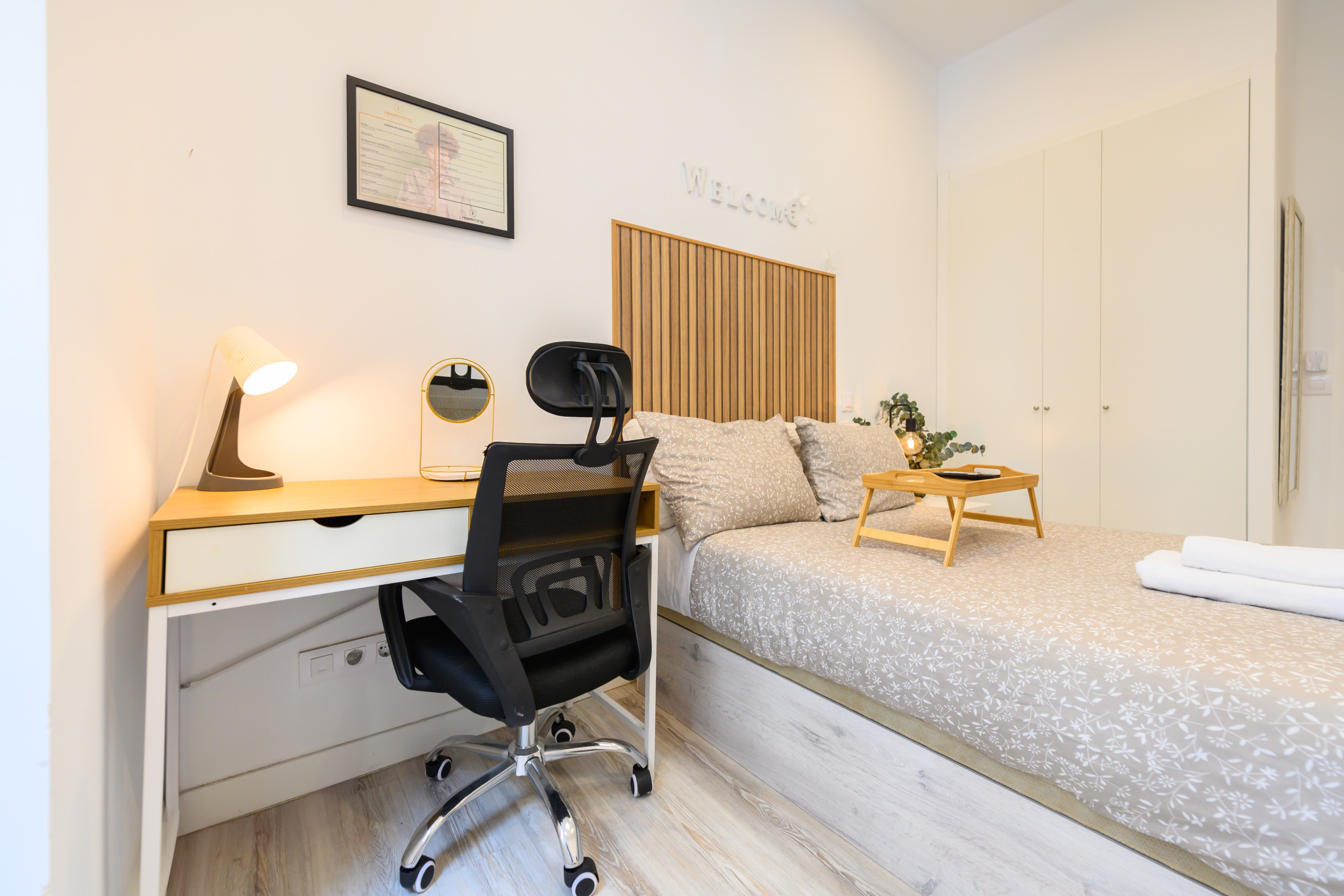 Piso de alquiler Temporal. Habitación 4 – Washington: Habitación con balcón. Situada la cuarta exterior dentro de la vivienda, cuenta con todas las comodidades que todo estudiante puede demandar. Desde la cama con un colchón premium, canapé con gran almacenaje, escritorio + silla, hasta smart TV, climatización, caja fuerte, plancha+tabla, cargador inalámbrico, cerradura inteligente, 2 juegos de toallas y sábanas.