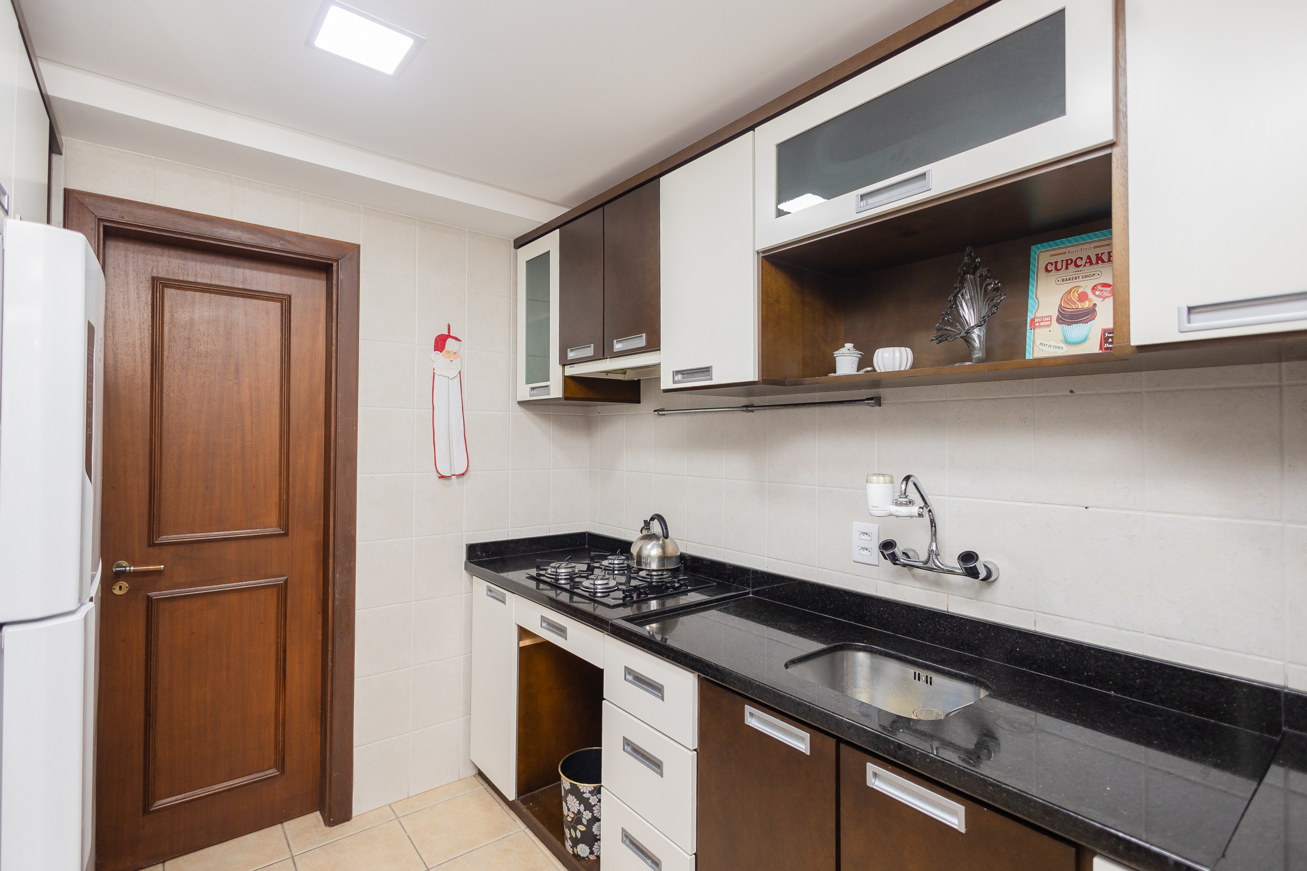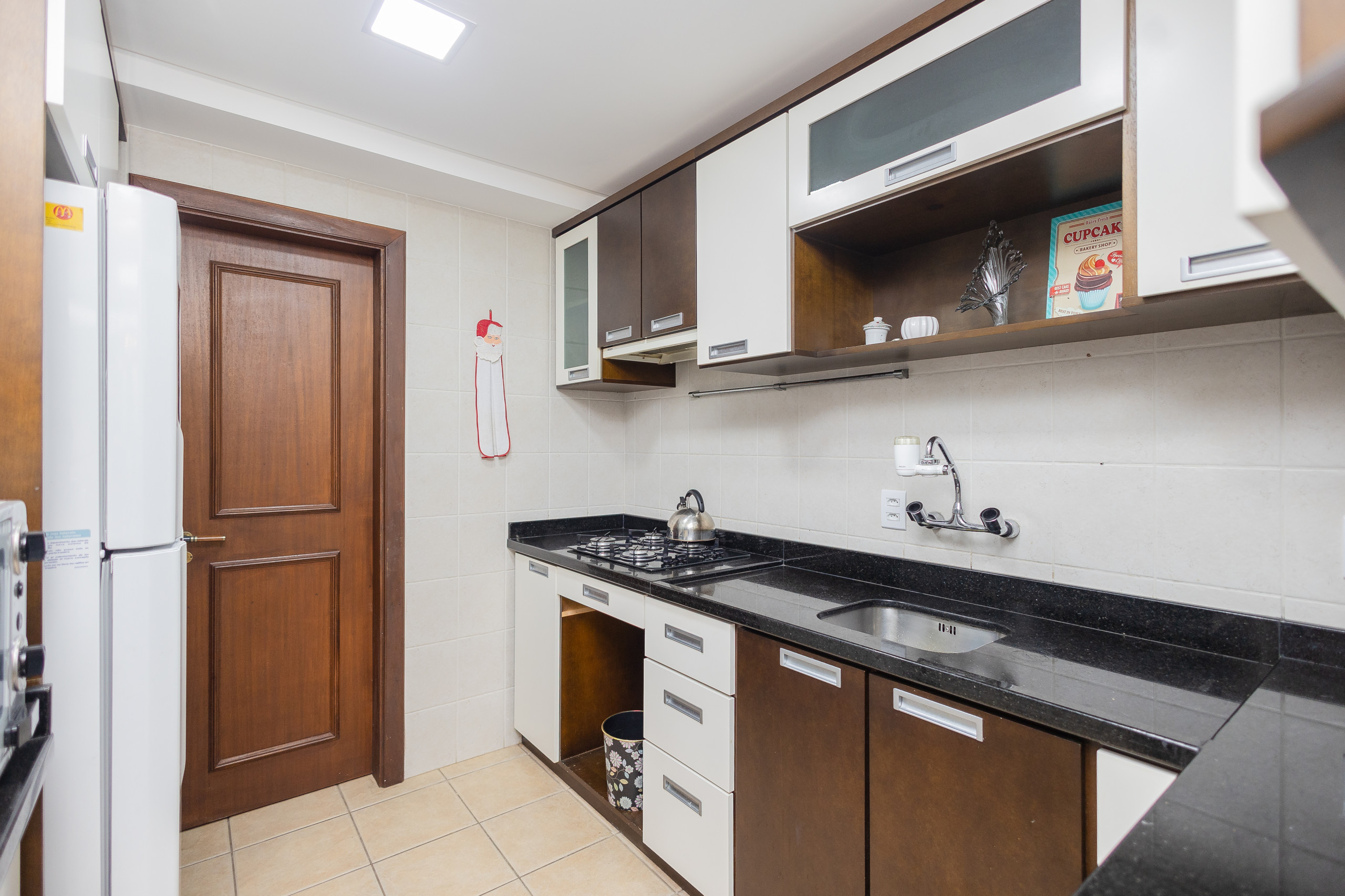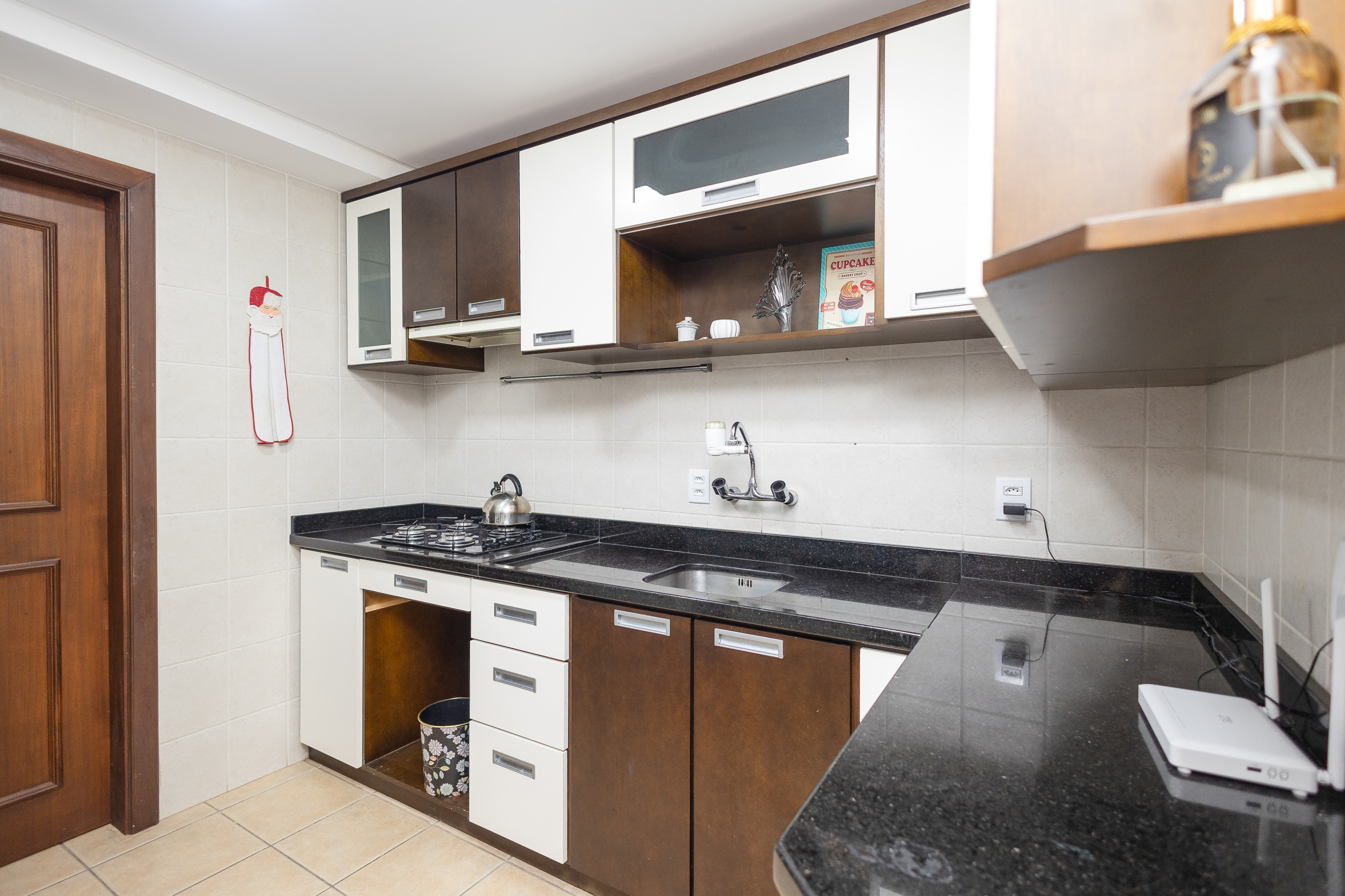 La cocina completa cuenta con nevera, cafetera, sandwichera, microondas, placa de cocina y cocina. En la mesa, podrán sentarse hasta 08 huéspedes para comidas o simplemente para disfrutar de un chocolate caliente o un vino. El apartamento también dispone de lavandería con lavadero.