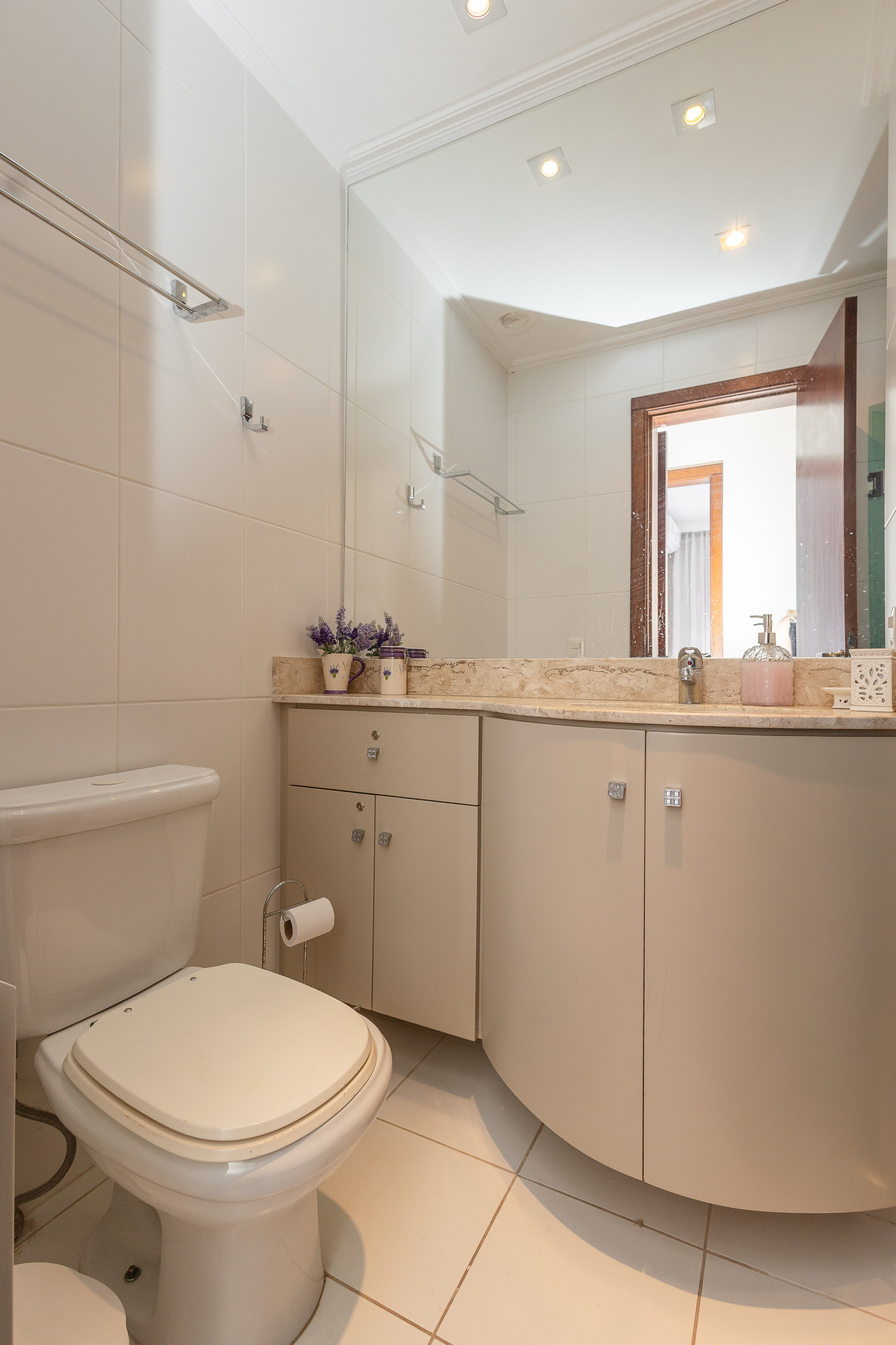 La cocina completa cuenta con nevera, cafetera, sandwichera, microondas, horno y cocina. En la mesa, podrán sentarse hasta 06 huéspedes para comidas o simplemente para disfrutar de un chocolate caliente o un vino. El apartamento también dispone de lavandería con lavadora y secadora.