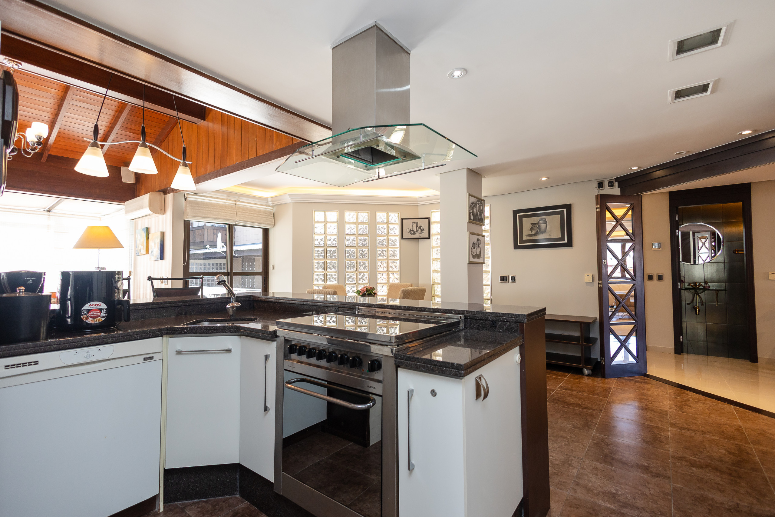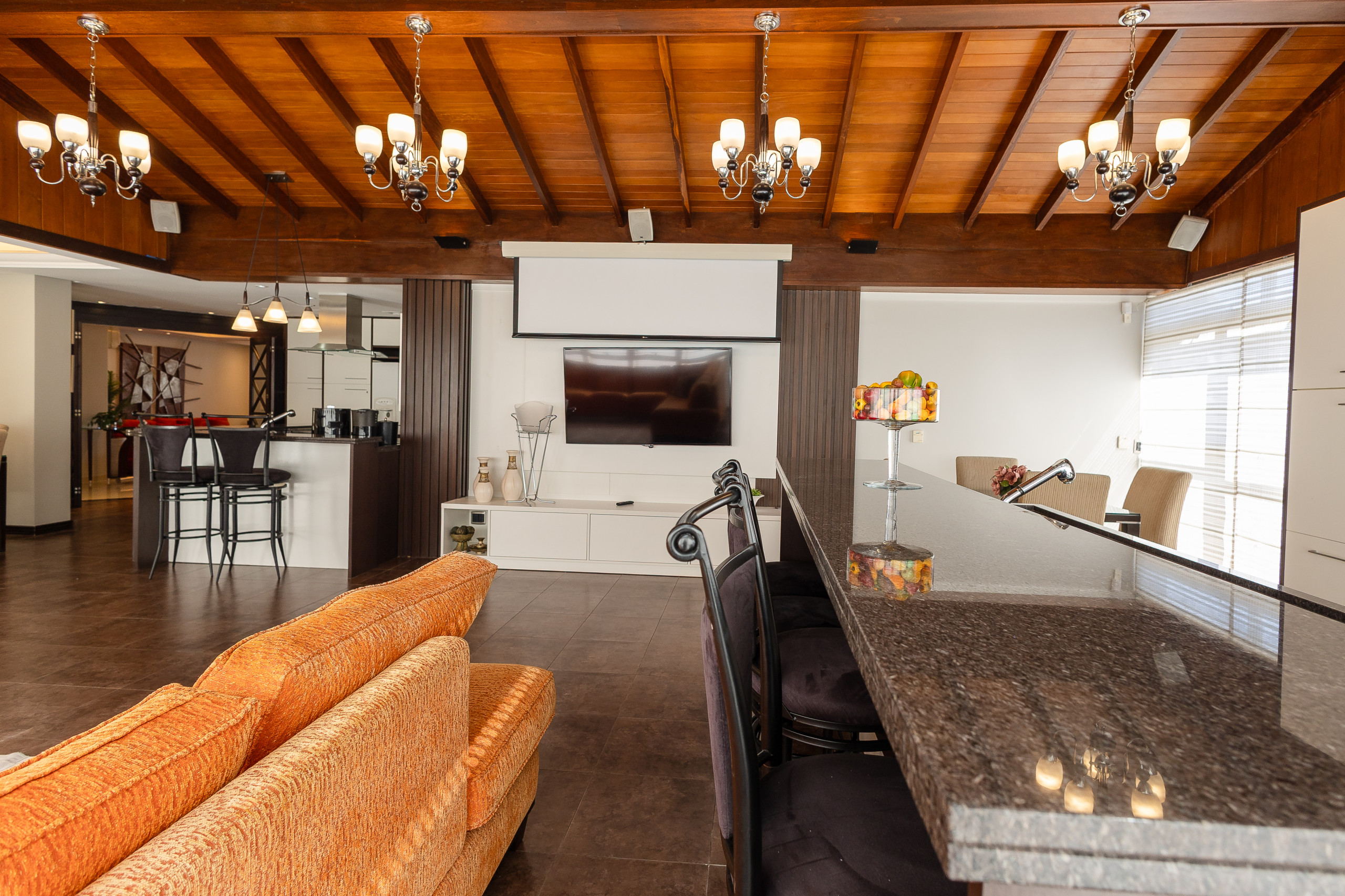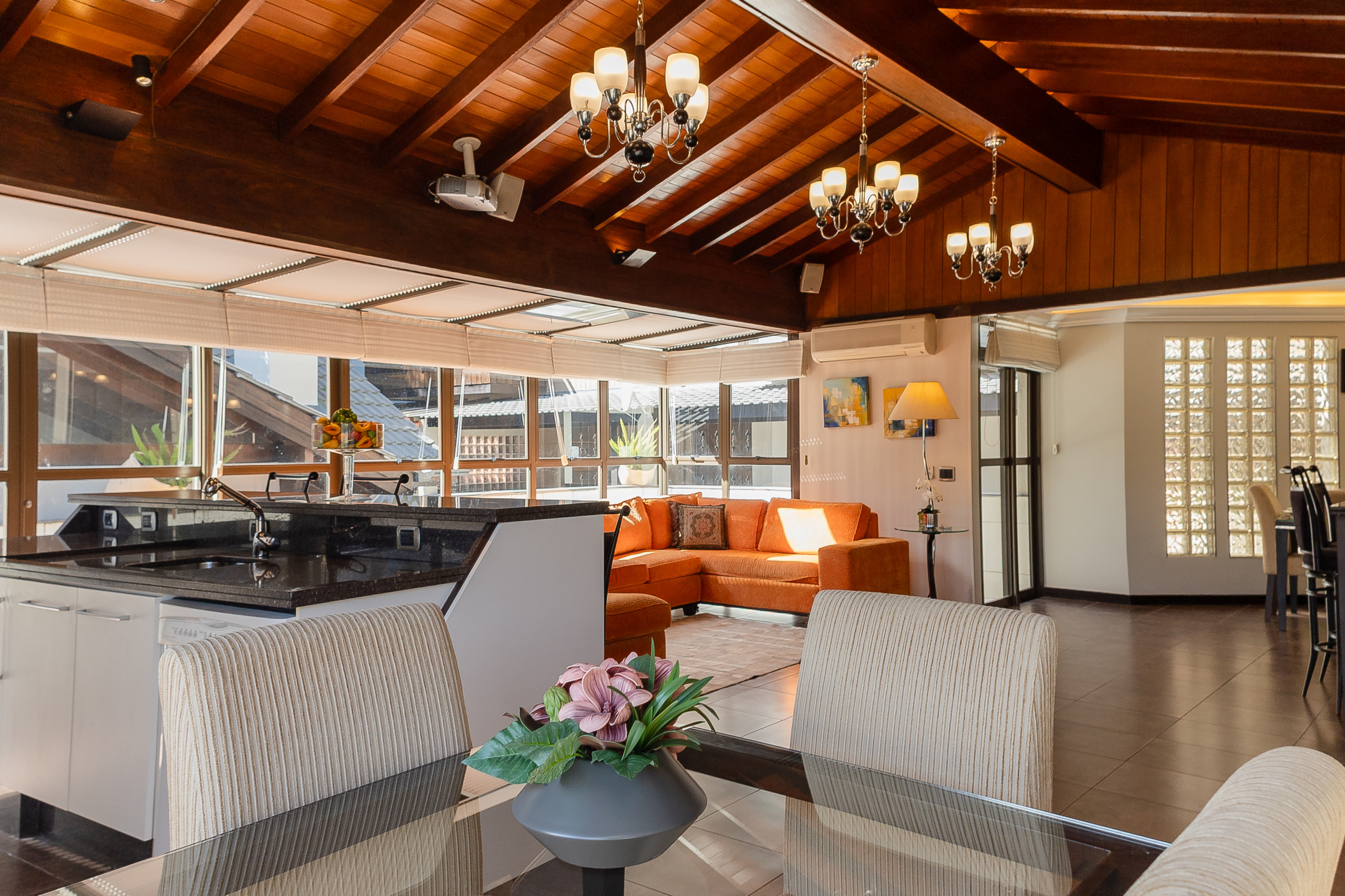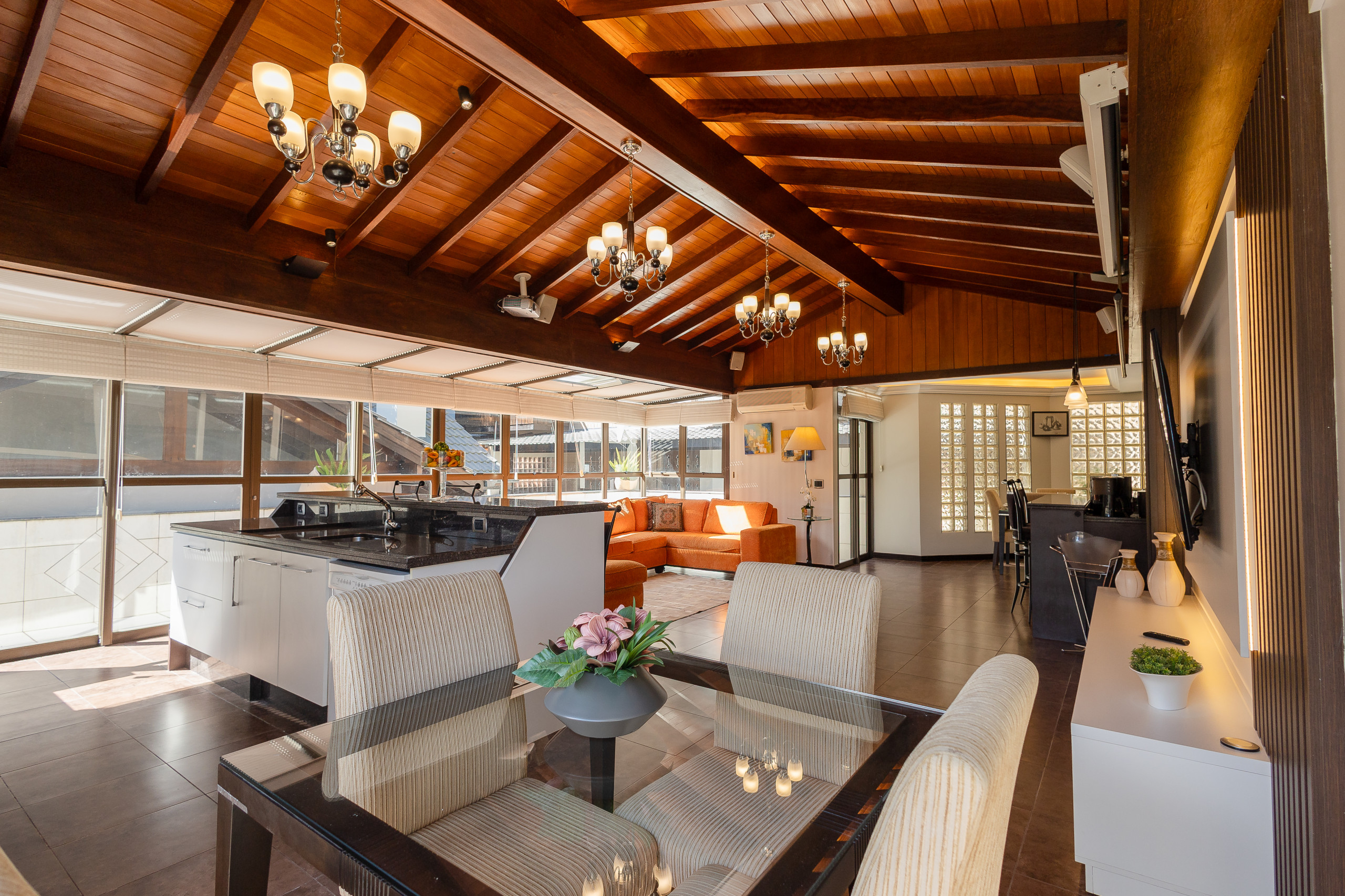 El apartamento cuenta con 3 dormitorios con vista a la principal avenida del centro, siendo una suite con walk-in closet, más dos baños sociales completos, un lavabo y lavandería completa con lavadora y secadora de ropa. Aún hay dos áreas sociales súper espaciosas, una con chimenea y otra con cocina americana completa, barbacoa gourmet y un gran y soleado balcón. El inmueble es completo y dispone de climatización por splits frío/calor en todas las habitaciones, incluso en los baños, y será preparado con ajuar completo para la estancia.