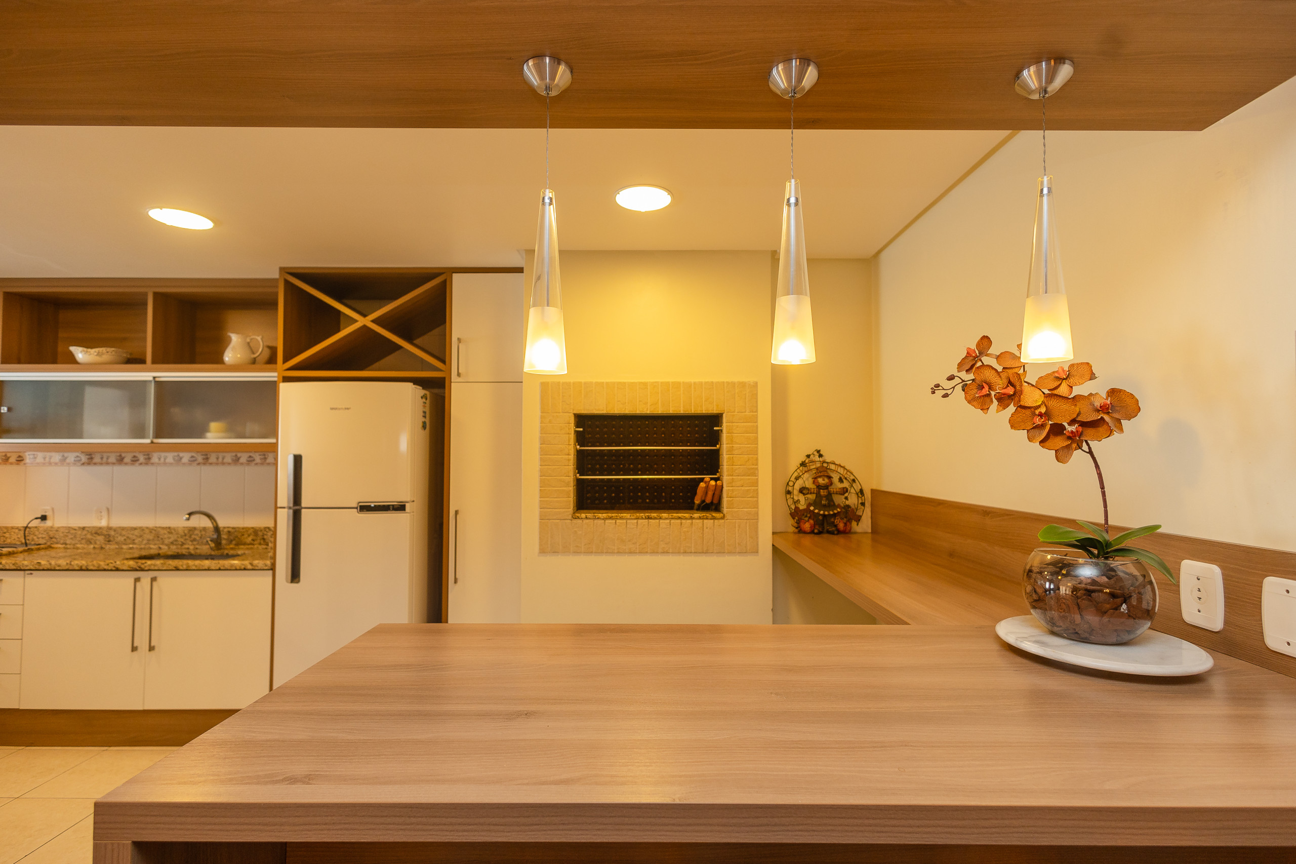 El amplio salón integra el área de estar y comedor con el espacio gourmet con barbacoa, pudiendo acomodar hasta 5 huéspedes con mucho espacio para comidas o simplemente para disfrutar de un chocolate caliente o un vino. La cocina completa cuenta con nevera, cafetera, sandwichera, microondas, placa de cocina y cocina.