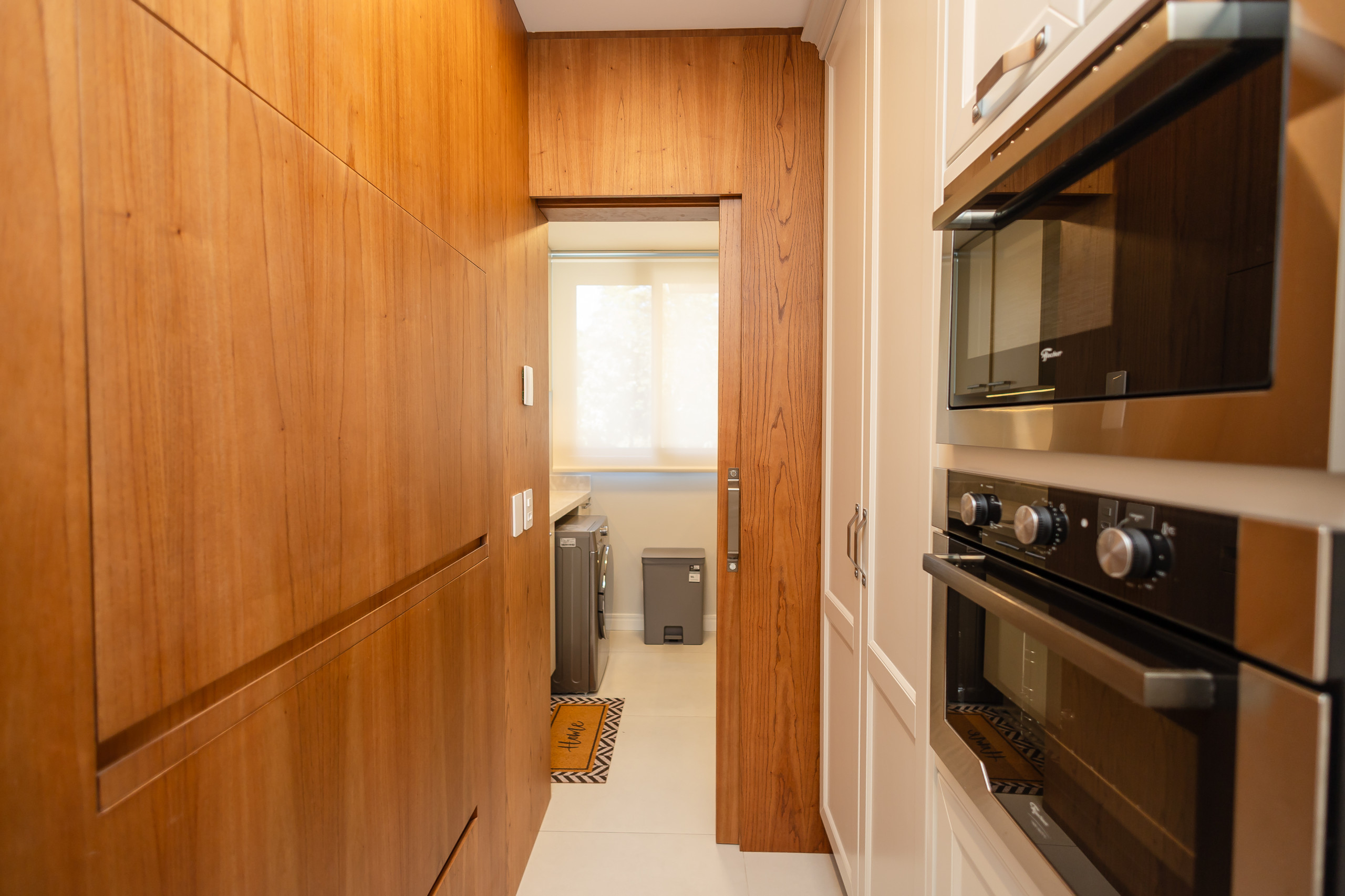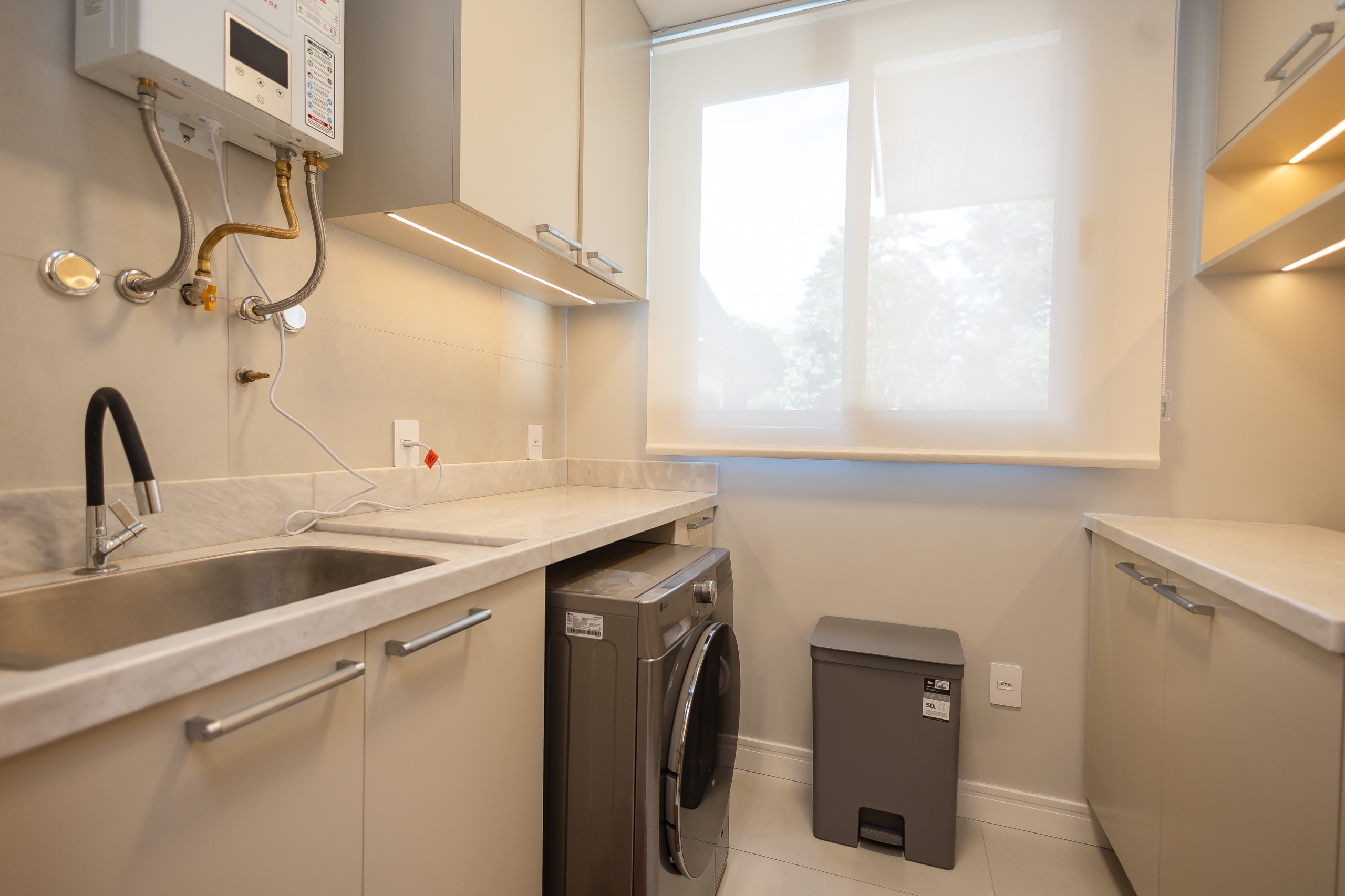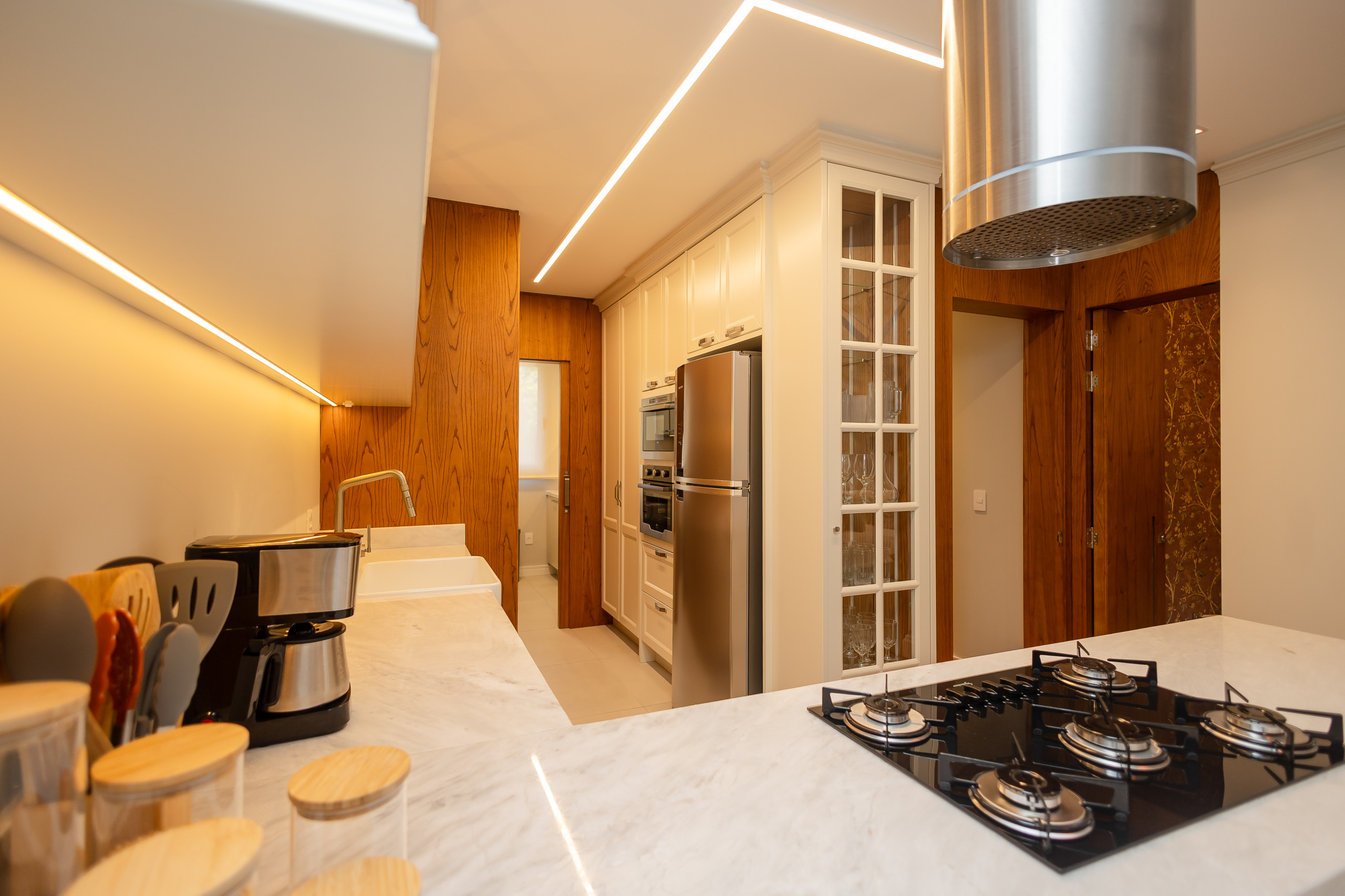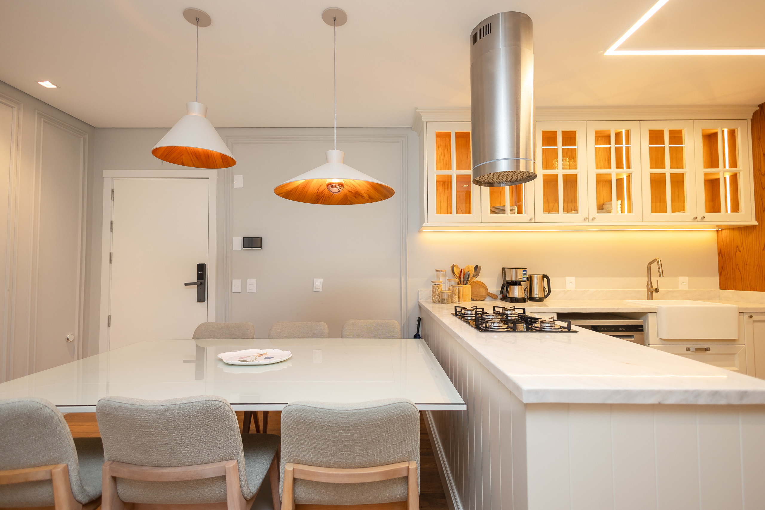 La cocina completa cuenta con lavavajillas, parrilla, refrigerador, cafetera, sandwichera, microondas, placa de cocina y estufa. En la mesa, podrán sentarse hasta 06 huéspedes para comidas o simplemente para disfrutar de un chocolate caliente o un vino. El apartamento también dispone de lavandería con lavadora y secadora.