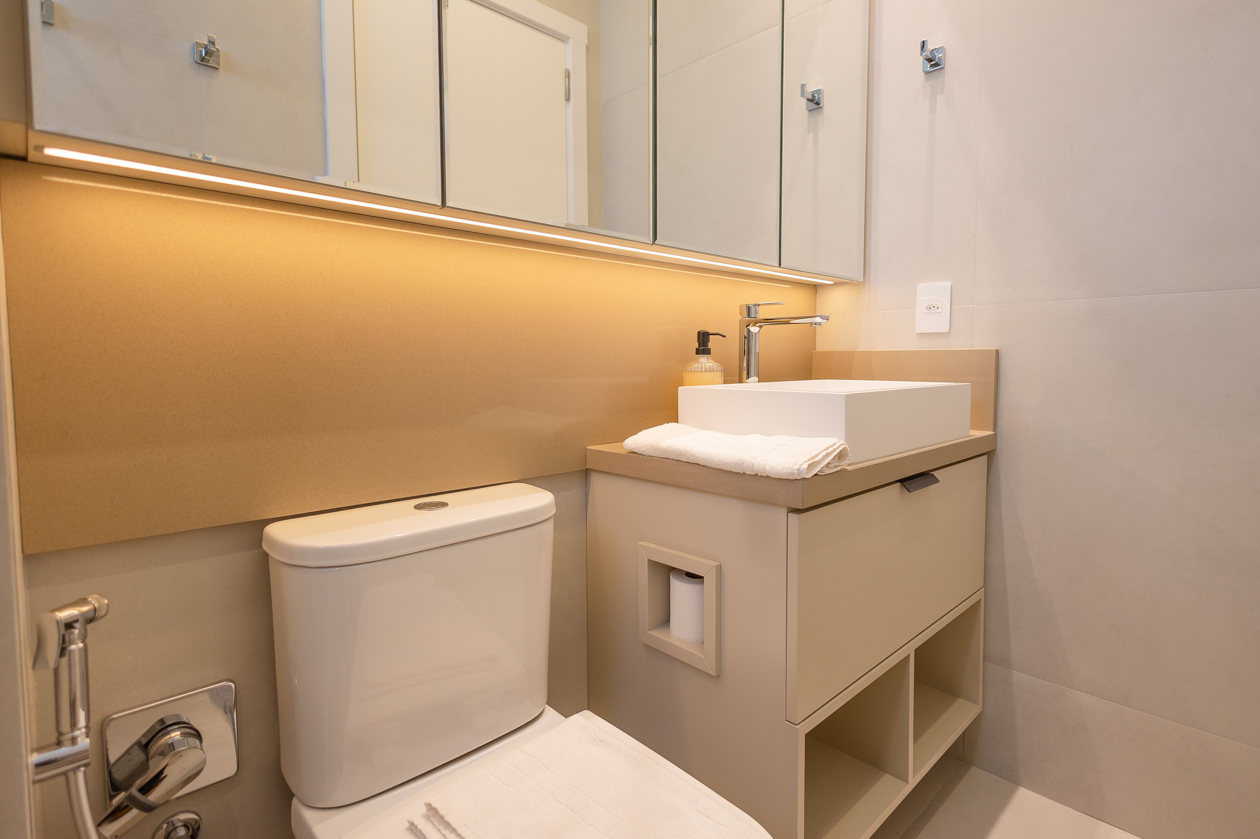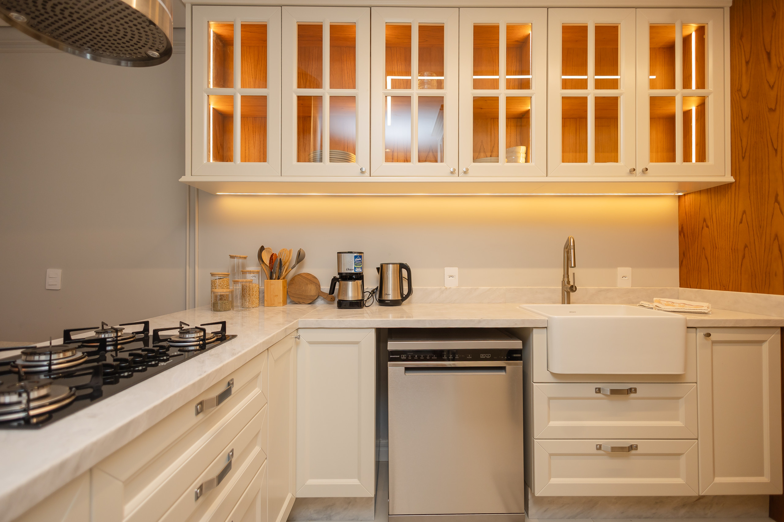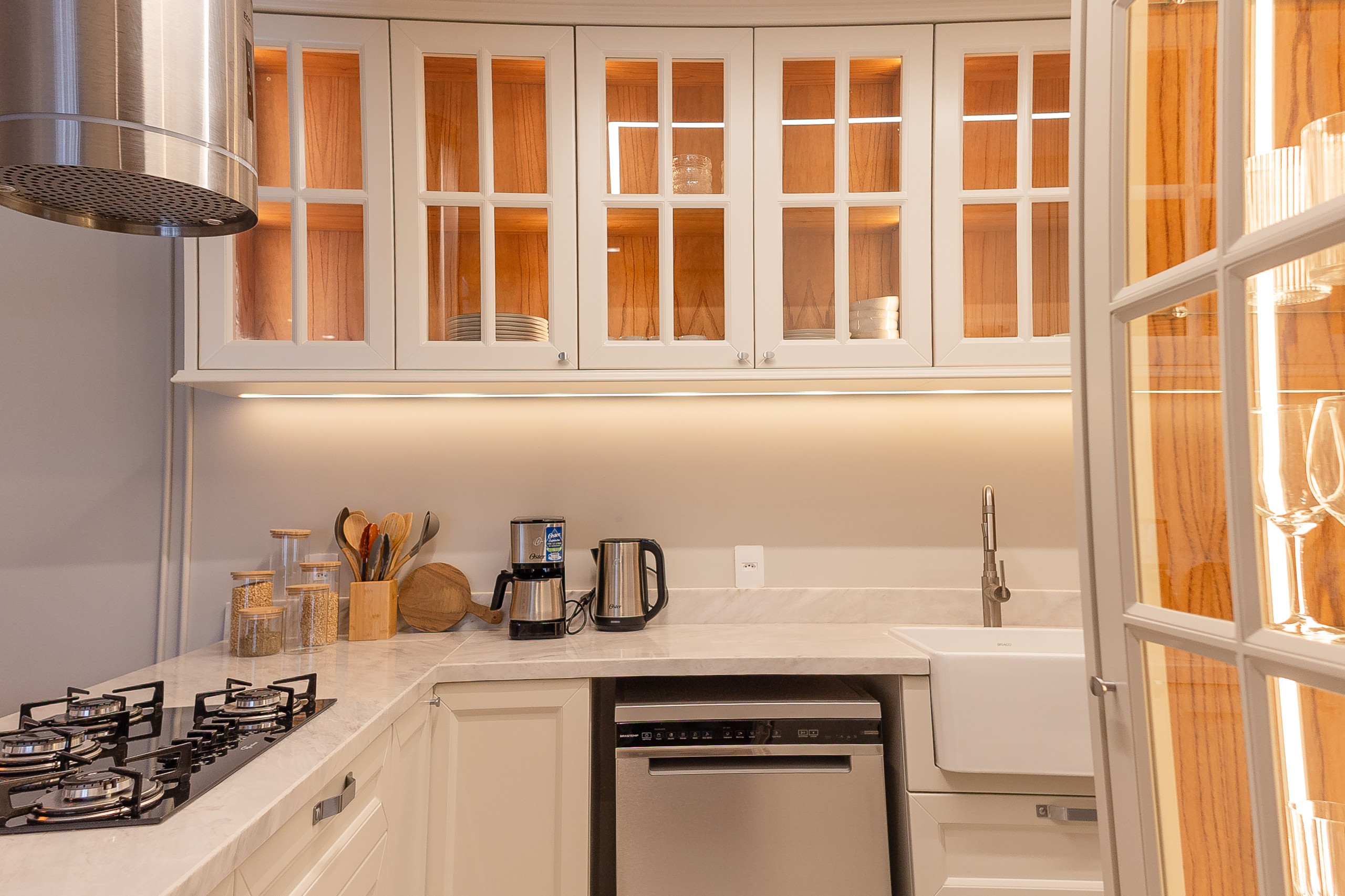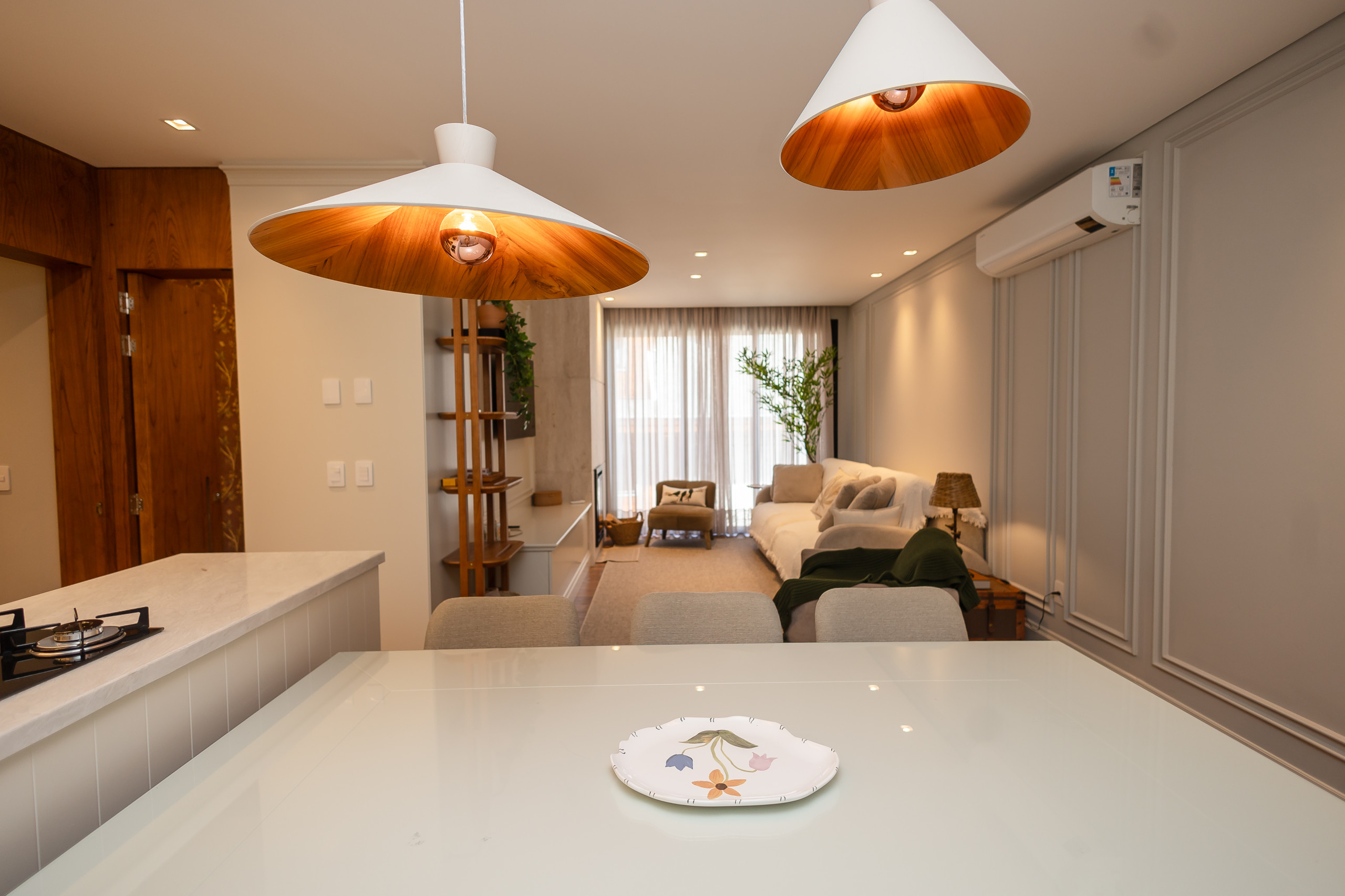 La cocina completa cuenta con lavavajillas, parrilla, refrigerador, cafetera, sandwichera, microondas, placa de cocina y estufa. En la mesa, podrán sentarse hasta 06 huéspedes para comidas o simplemente para disfrutar de un chocolate caliente o un vino. El apartamento también dispone de lavandería con lavadora y secadora.