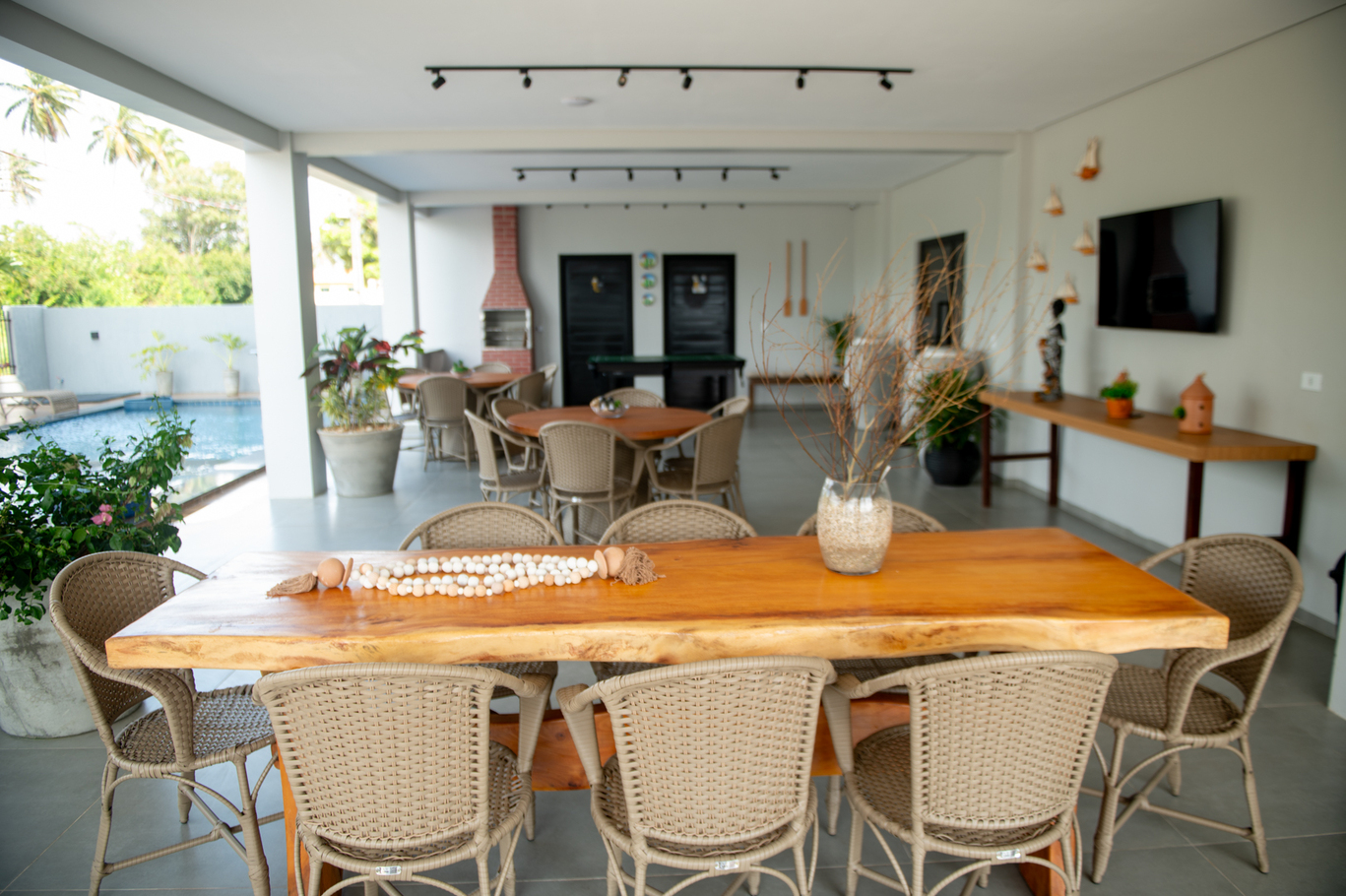 - Área de ocio con piscina, barbacoa, tumbonas, Smart TV y salón de juegos