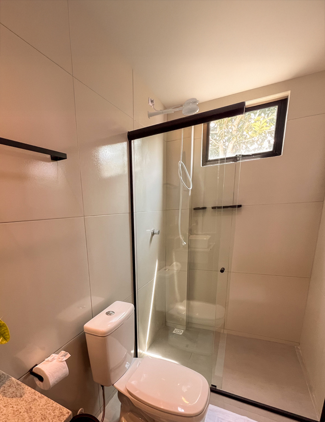 - Habitación 1 (suite): cama queen, aire acondicionado y baño con ducha de vidrio