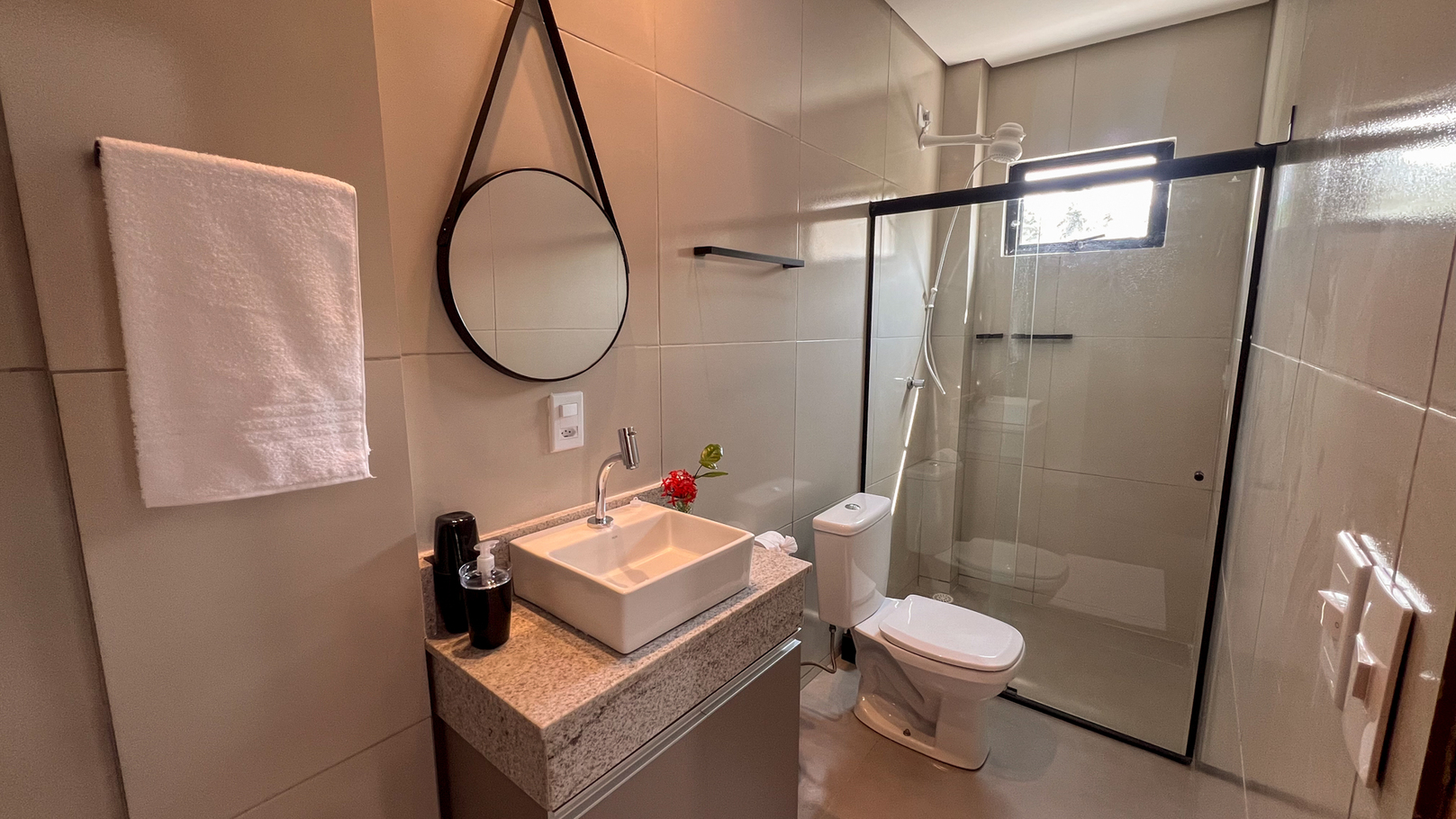 - Habitación 1 (suite): cama queen, aire acondicionado y baño con ducha de vidrio