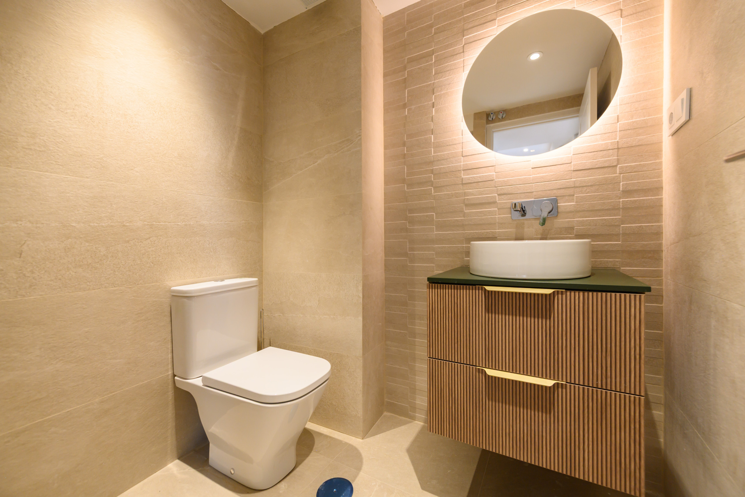 El baño completo está renovado y equipado con un plato de ducha moderno, espejo y un práctico mueble de lavabo que aporta capacidad de almacenamiento y comodidad en el uso diario. Su diseño combina funcionalidad con un estilo actual y cuidado.