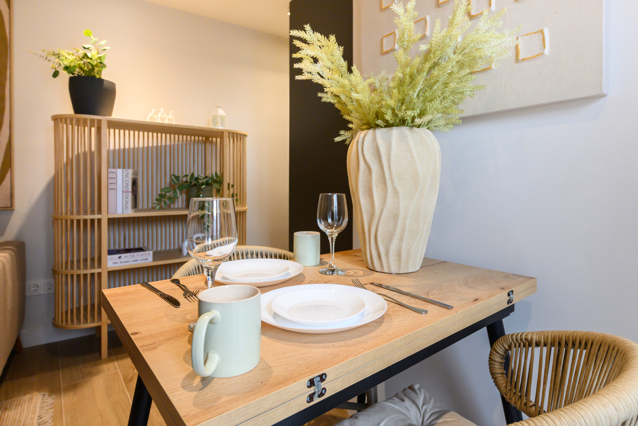 La cocina está completamente equipada, con todos los electrodomésticos y el menaje necesario para el día a día, lo que permite cocinar con comodidad sin necesidad de añadir nada más. Su diseño funcional aprovecha al máximo el espacio, manteniendo una estética moderna y ordenada.