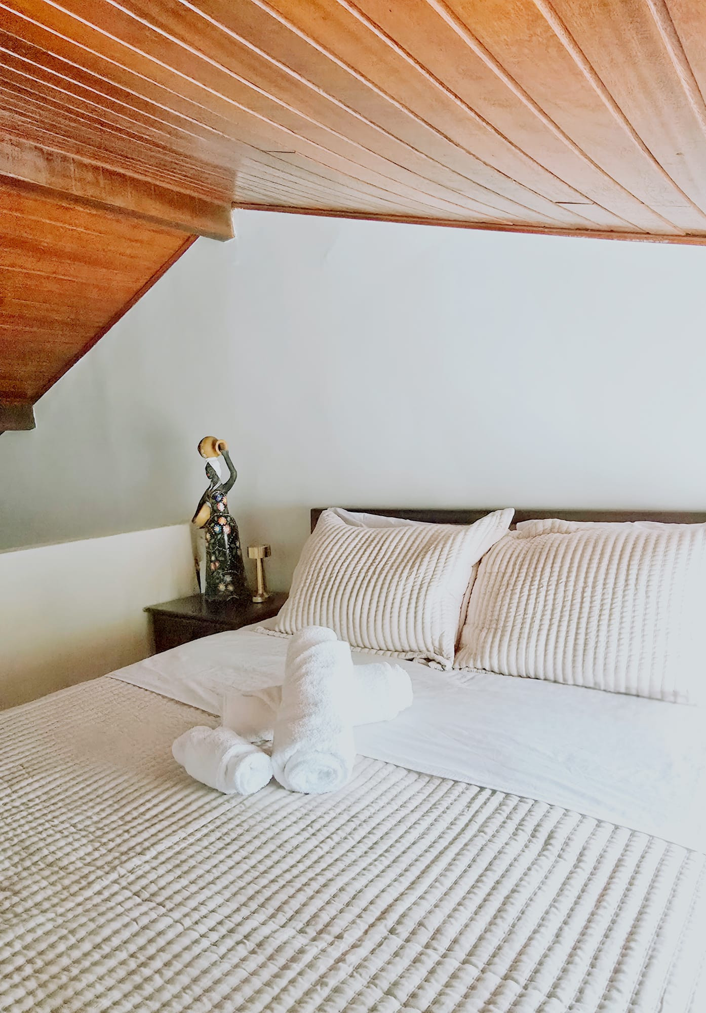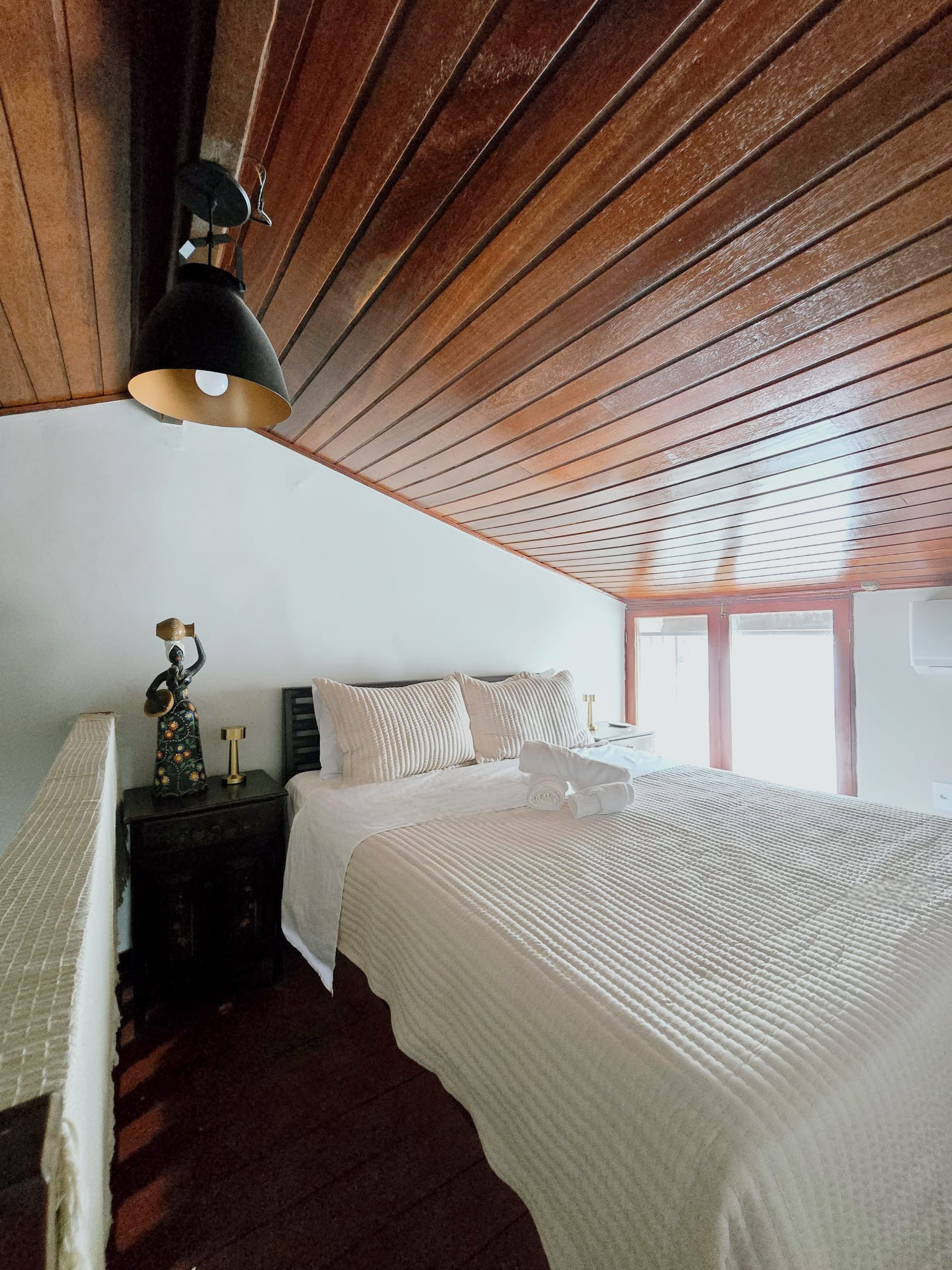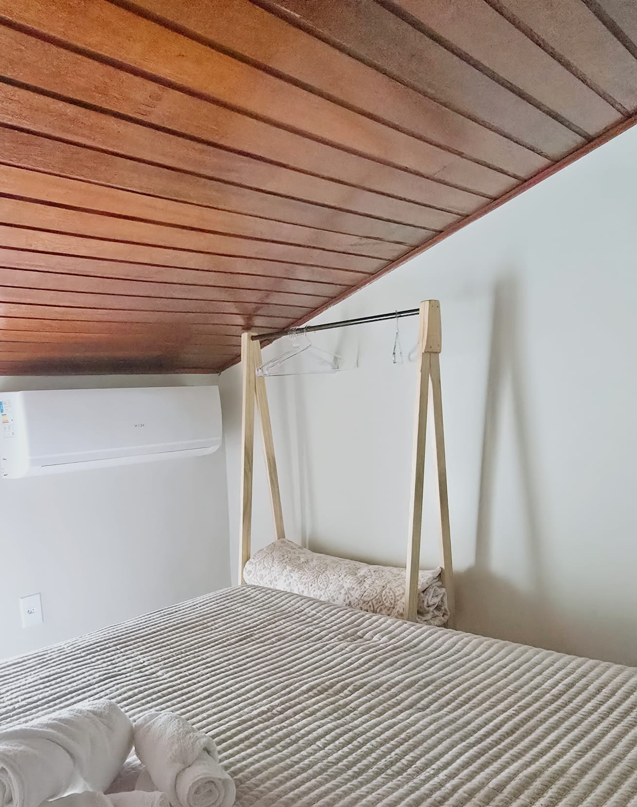 - Habitación/Mezanino: cama de matrimonio cómoda, perchero (caballete) para organizar sus artículos y ropa, edredón, protector de colchón e iluminación acogedora
