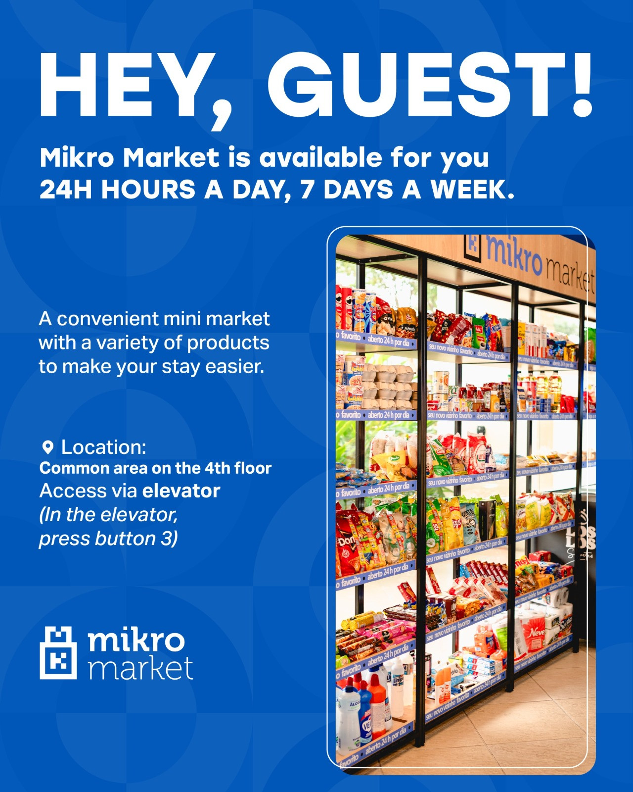 Además, el edificio cuenta con un minimercado abierto las 24 horas, disponible todos los días de la semana, que ofrece comodidad y una variedad de productos durante su estancia. El minimercado se encuentra en la zona común de la 4.ª planta, accesible mediante ascensor (presione el botón 3).