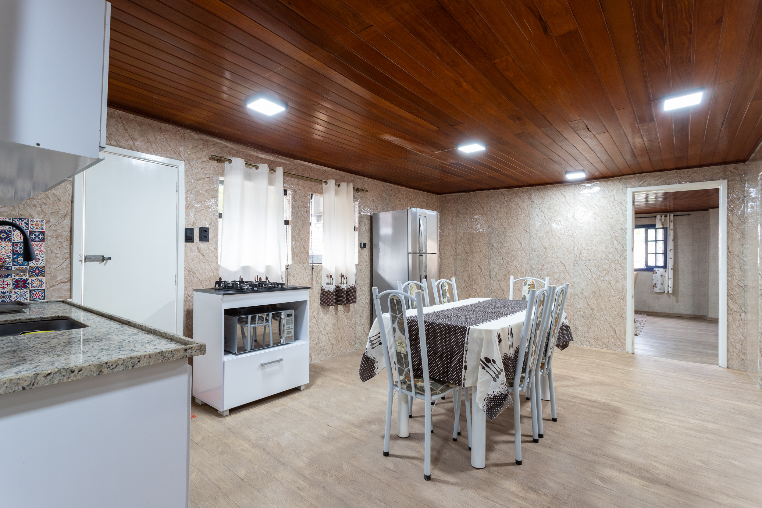 - Cocina equipada con refrigerador, cocina, microondas, utensilios y mesa de comedor con sillas