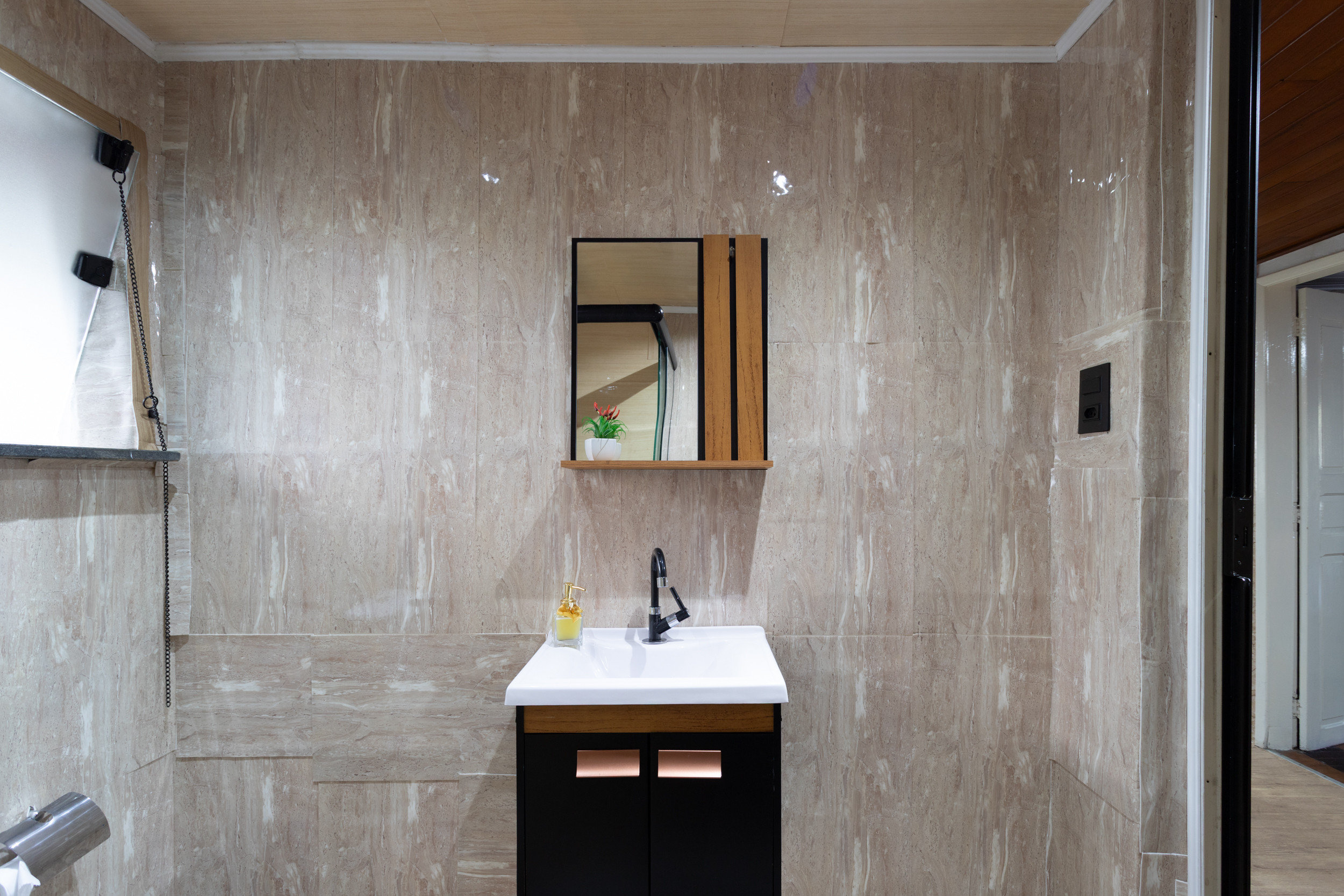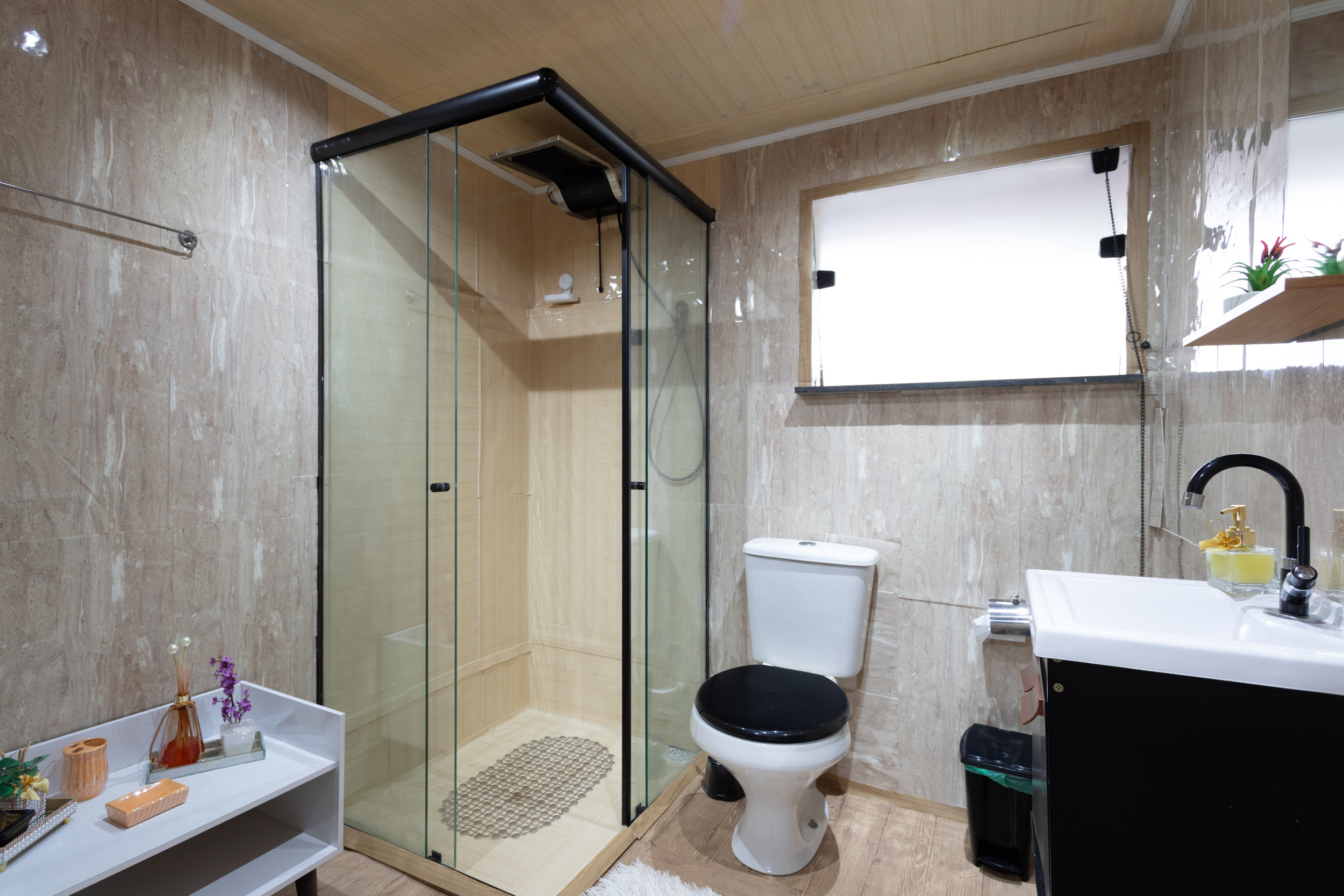 - Baño con ducha eléctrica, cabina de ducha y espejo