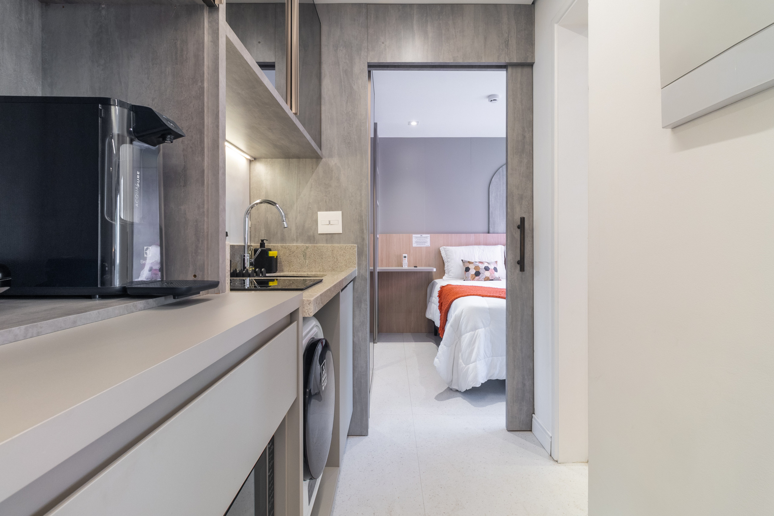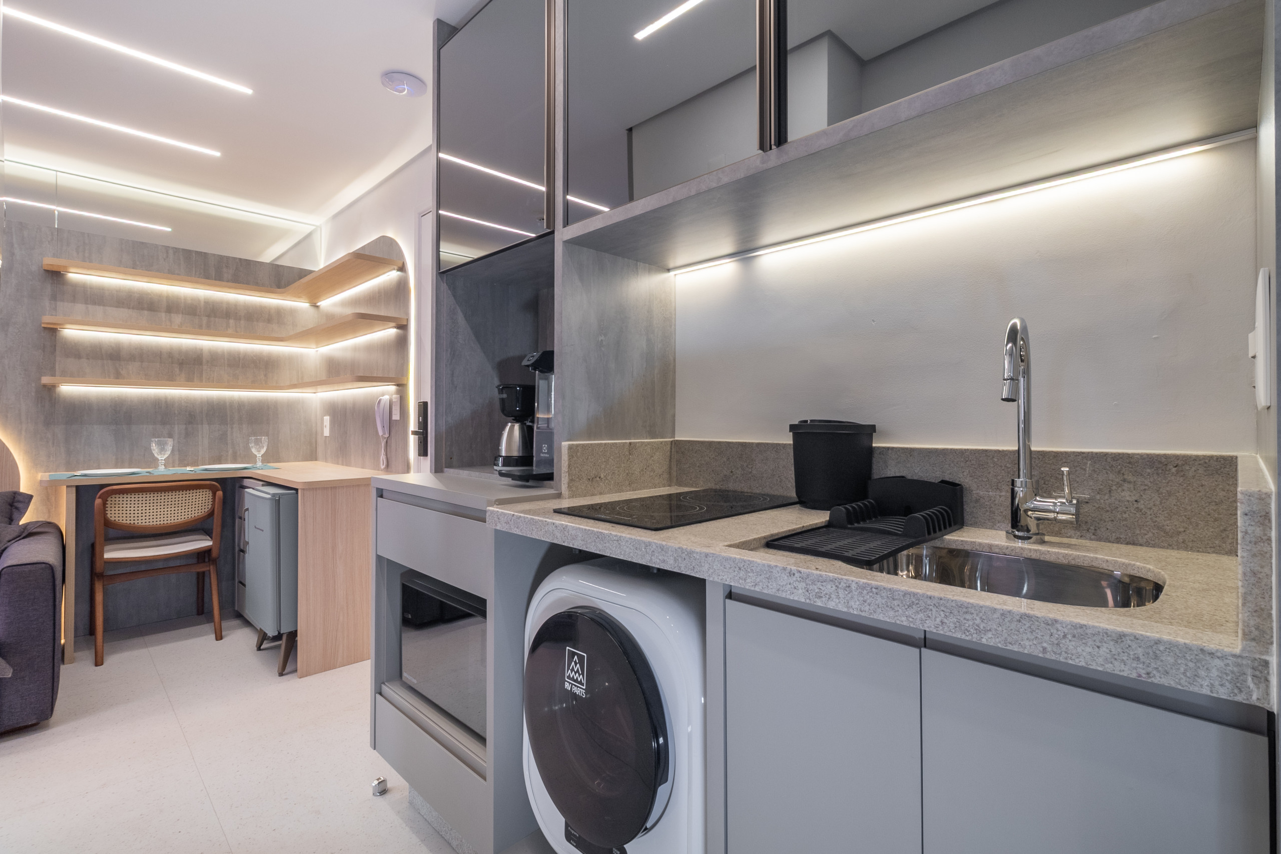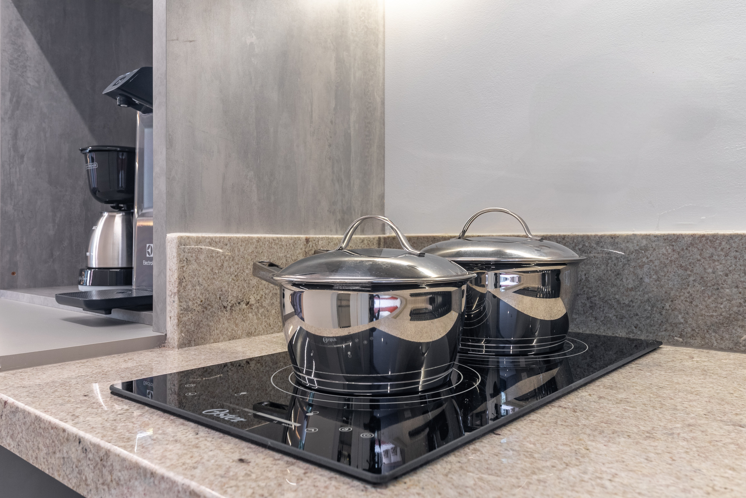 La cocina americana, de inducción, está equipada con nevera, microondas, congelador, vajilla/cubertería, utensilios/cocina, cafetera y tostadora.